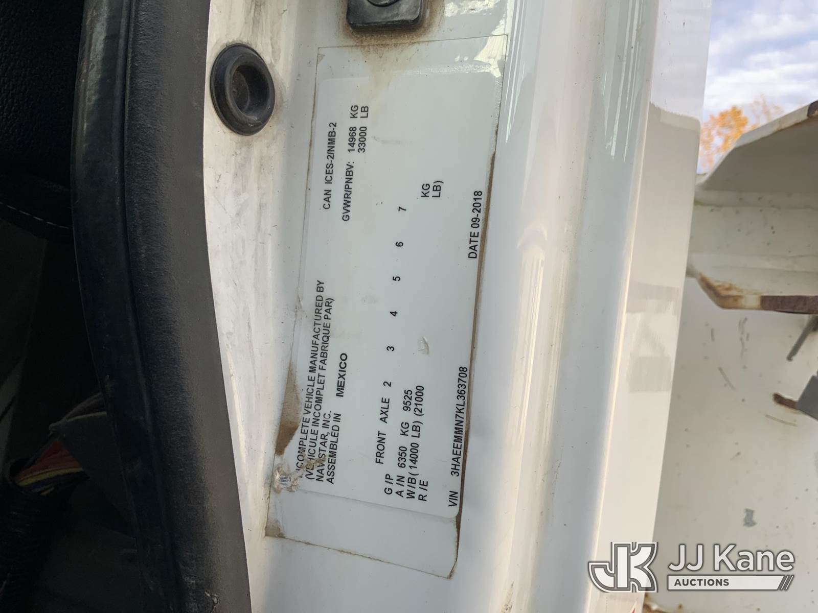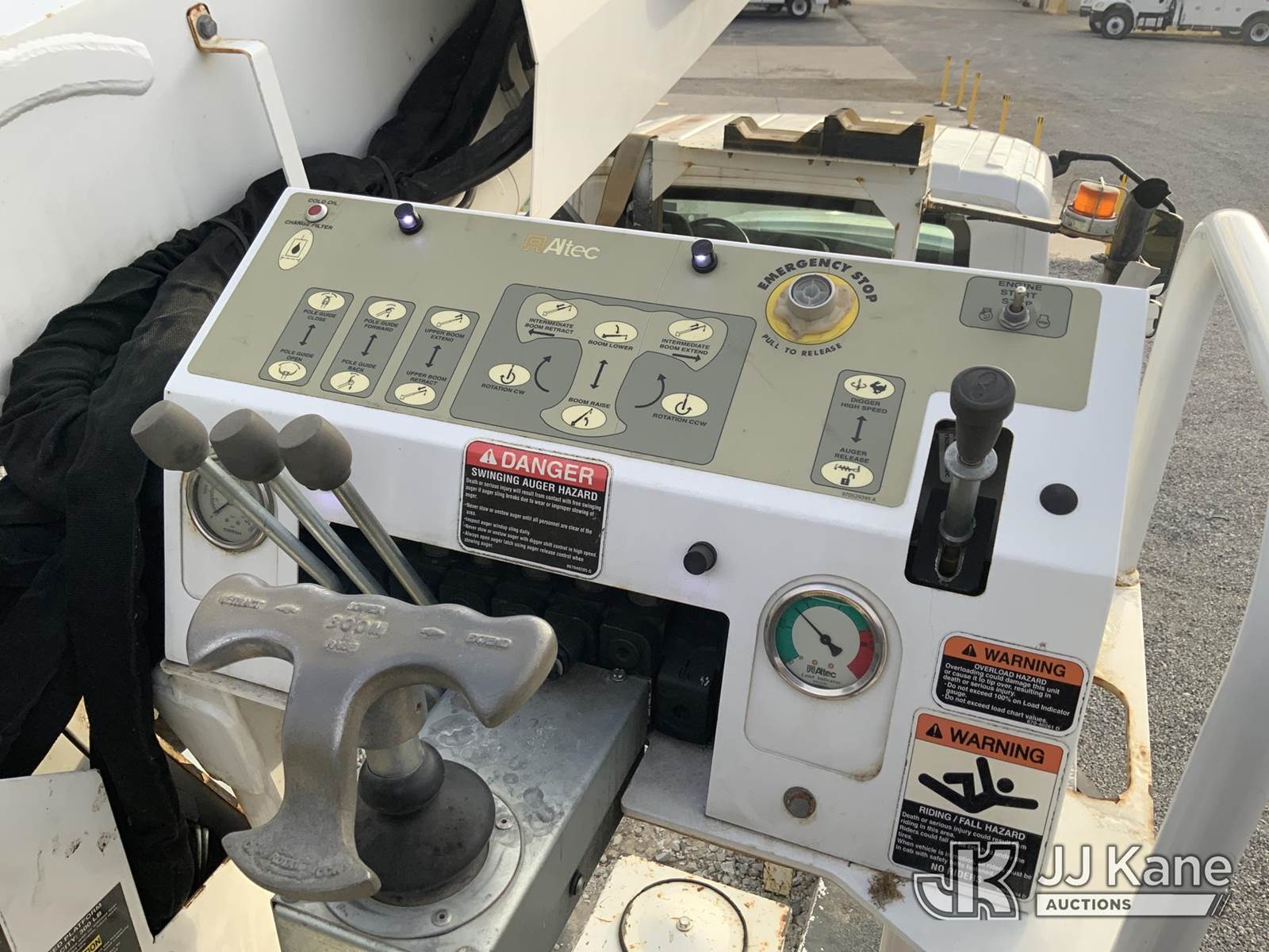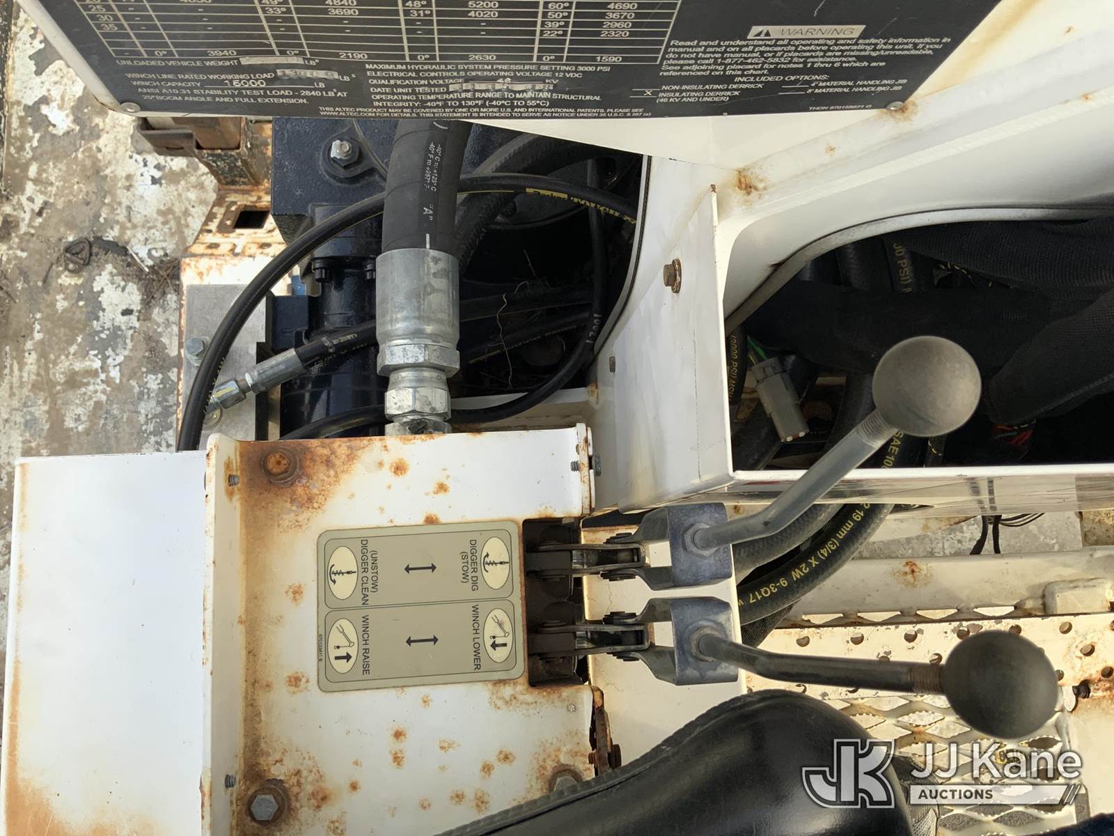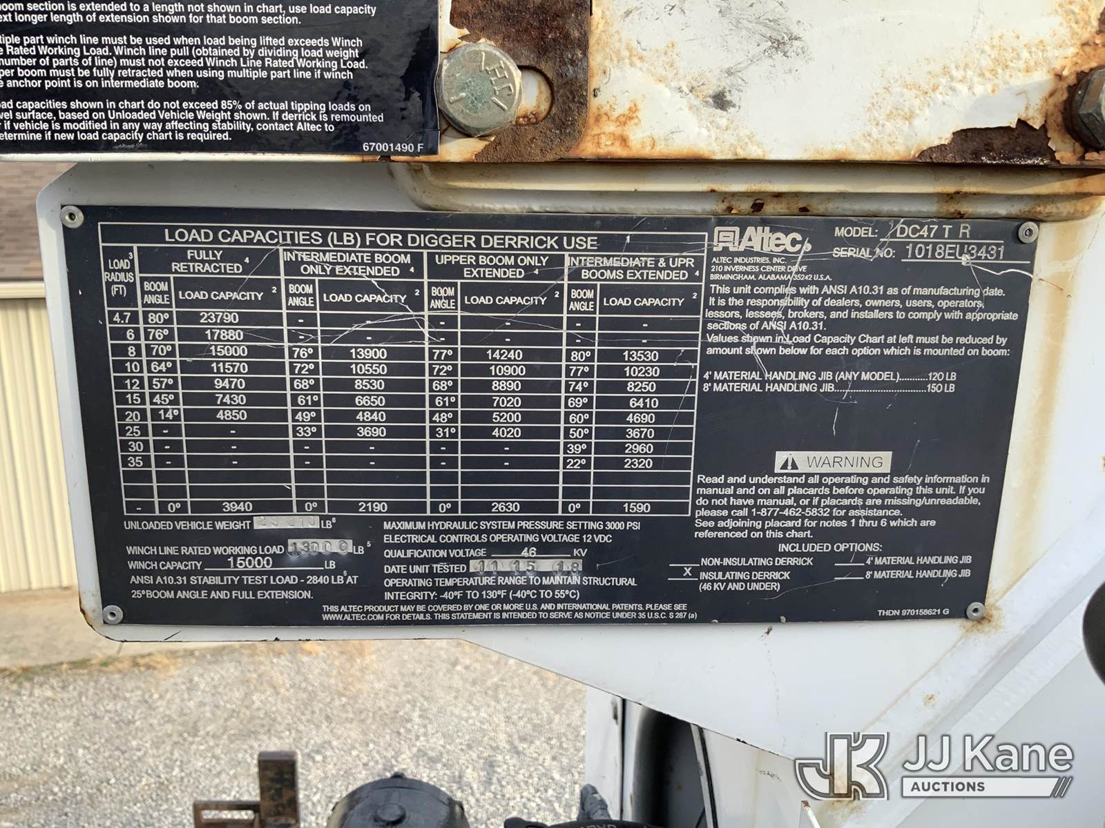 Altec DC47-TR, 23,790 Lb Digger Derrick s/n 1018EU3431, with 47 ft sheave height, 3-stage hyd. boom, pole grabs, 2 spd. digger, heel winch & riding console, rear mounted on 2019 International HV507 4x4 Utility Truck, International A36 Auto, diesel, A/C, with hyd. tool reel, (102,847 miles) (Runs, Moves & Upper Operates) (Check Engine Light On) (Seller States: Bad Tie Rod, NOX Sensor, Crankcase & 4 Wheel Drive) (Reads 7,594 hours) This is a Titled Item NOTE: This unit is being sold AS IS/WHERE IS via Timed Auction and is located in Fort Wayne, IN. For more information & removal arrangements please contact Office Staff @ (260) 450-9822. Load out by appointment only, Buyer/Hauler must present copy of paid invoice upon arrival. Purchaser acknowledges ALL lots must be removed within (10) business days of Auction, or a storage fee may be incurred. For load out and pick up information, please reference the hauler sheet sent out after purchase. (Manuals provided in cab) (Buyer is responsible for removal. Assistance by consignor or JJ Kane Auctioneers is not assured.)