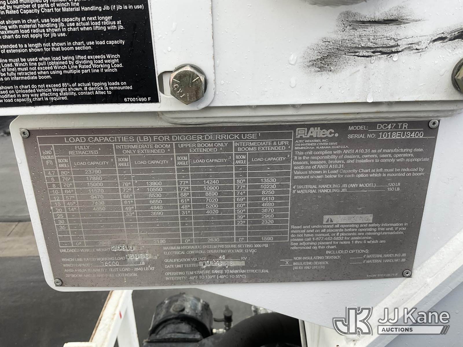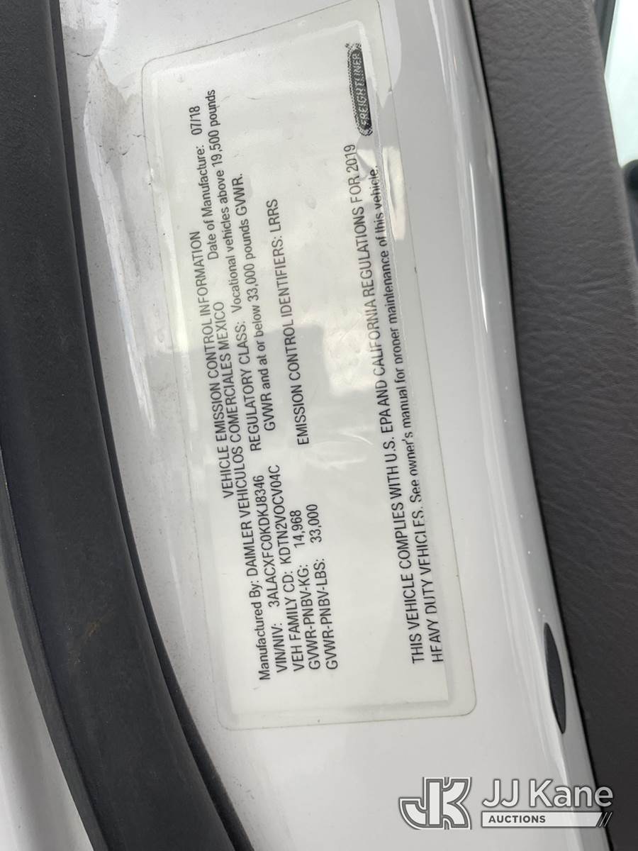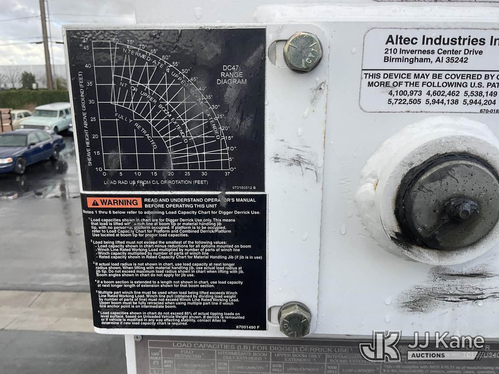 Altec DC47-TR, 23,790 Lb Digger Derrick s/n 1018EU3400, with 47 ft. sheave height, 3 section hyd boom, 2 spd digger, heel winch, pole guides, riding console & 4 hyd outriggers, rear mounted on 2019 Freightliner M2 106 Flatbed/Utility Truck, Cummins ISB6.7 Diesel Auto, A/C, with Tow Package, (019,588 miles) (Runs, Moves & Upper Operates) (The manufacturer has notified JJ Kane that this equipment is subject to an open recall. CSN 713A Reinforcement Plate Installation CSN 713B HOP Harness Installation The equipment should not be operated until this is addressed. Buyer is responsible for reviewing the recall notice and contacting the manufacturer to schedule the recommended corrective actions. Associated costs may be covered by the manufacturer in some cases.) (Reads 1,520 hours) May be subject to ARB Regulations This is a Titled Item NOTE: This unit is being sold AS IS/WHERE IS via Timed Auction and is located in Jurupa Valley, CA. Inspection & preview days for this unit are the 2 business days prior to the first day of items closing for this auction, item is located at 4510 Muth Way Jurupa Valley, CA 92509 and hours of operations are 8a-4p. For pre-sale questions, please contact please contact Office Staff @ (310) 353-7140. Dealer License Number 45696. (Manuals provided in cab) (Buyer is responsible for removal. Assistance by consignor or JJ Kane Auctions is not assured.)