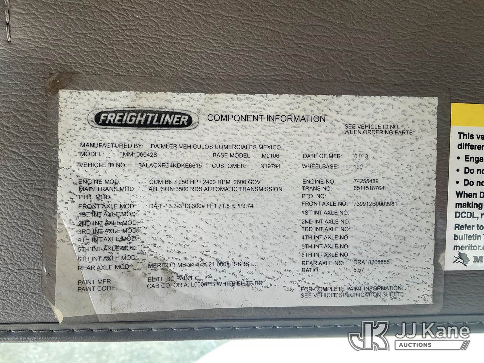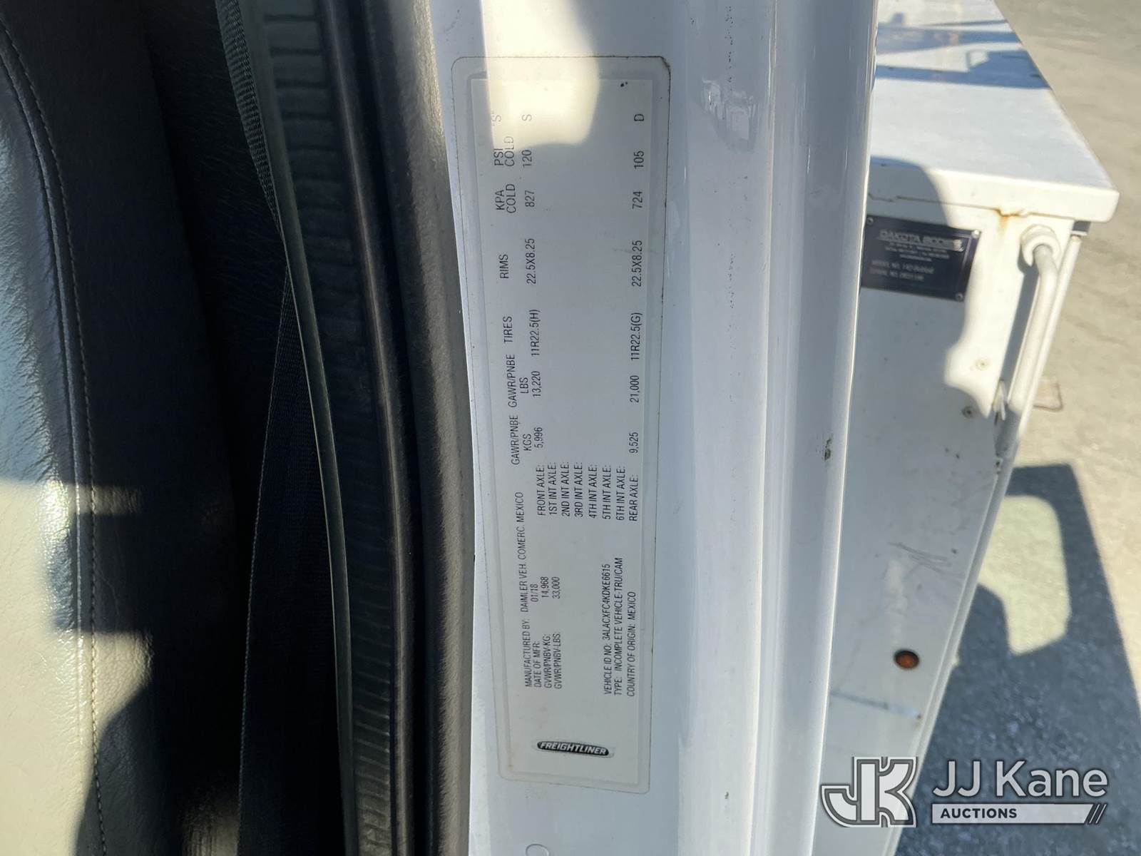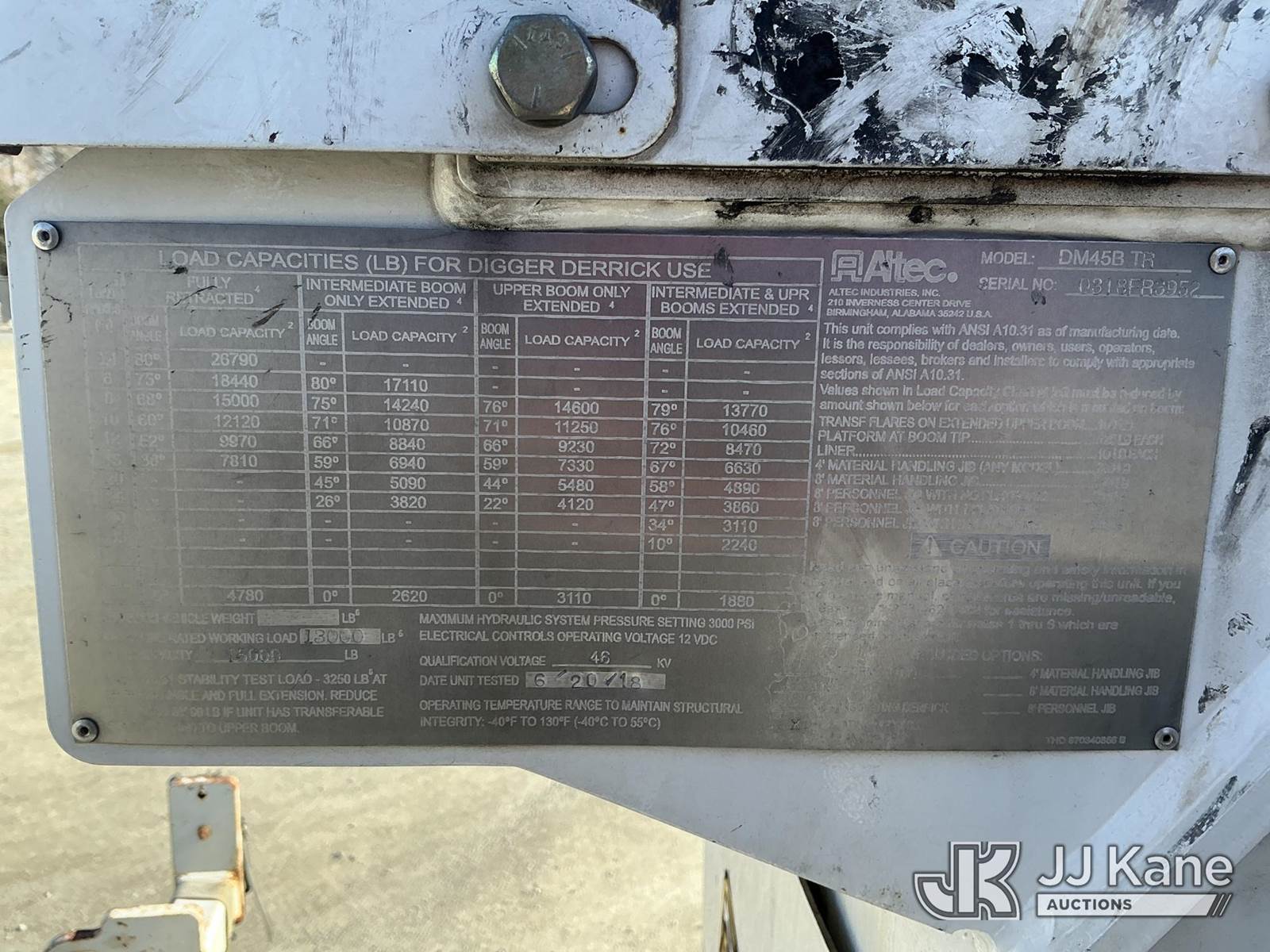 Altec DM45B-TR, 26,790 Lb Digger Derrick s/n 0318FR3952, with 45 ft sheave height, 3 section hyd boom, 2 spd digger, heel winch, pole grabs, riding console & 4 hyd outriggers, rear mounted on 2019 Freightliner M2 106 Utility Truck, Cummins 6.7L diesel, Auto, A/C, (82,279 miles) (Runs, Moves & Upper Operates) (Body Damage) This is a Titled Item NOTE: This unit is being sold AS IS/WHERE IS via Timed Auction and is located in China Grove, NC. Inspection & preview days for this unit are the 2 business days prior to the first day of items closing for this auction, item is located at 820 E NC Hwy 152 China Grove, NC 28023 and hours of operations are 8a-4p. For pre-sale questions, please contact Office Staff @ (704) 674-1113. (Manuals provided in cab) (Buyer is responsible for removal. Assistance by consignor or JJ Kane Auctions is not assured.)
