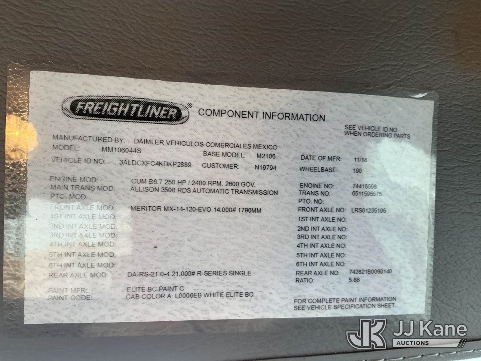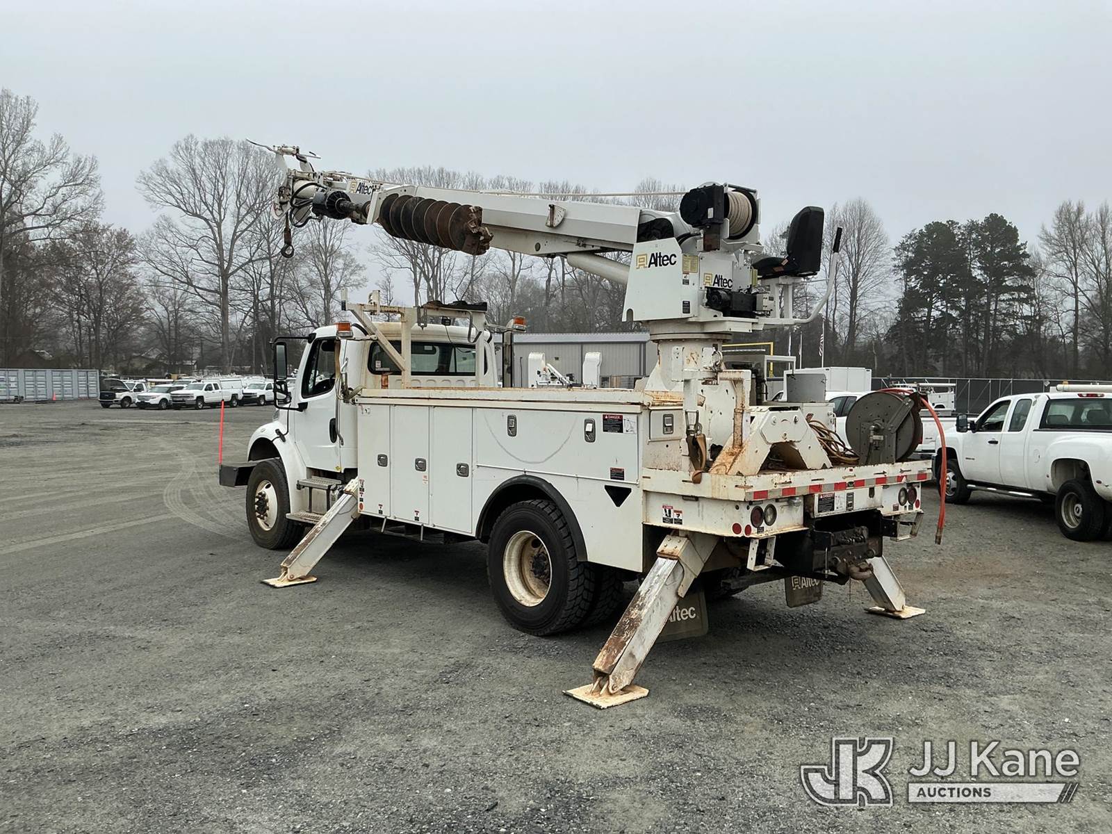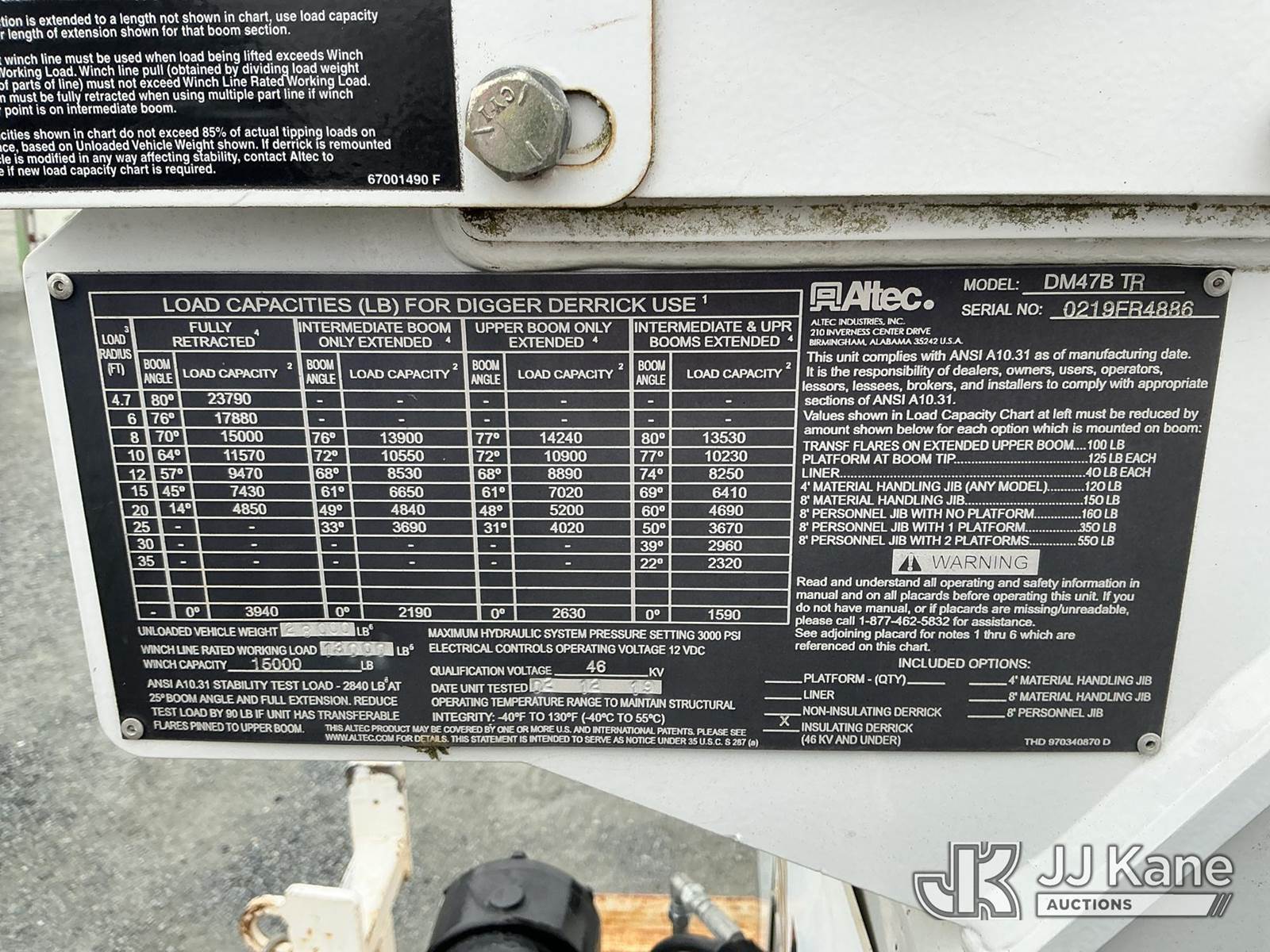 Altec DM47B-TR, 23,790 Lb Digger Derrick s/n 0219FR4886, with 47ft sheave height, 2spd digger, heel winch, upper controls, pole grabs, riding console, wireless remote, rear mounted on 2019 Freightliner M2 106 4x4 Utility Truck, Cummins 6.7L diesel, Auto, A/C, with front winch , (55,289 miles) (Runs, Moves & Upper Operates ) This is a Titled Item NOTE: This unit is being sold AS IS/WHERE IS via Timed Auction and is located in China Grove, NC. Inspection & preview days for this unit are the 2 business days prior to the first day of items closing for this auction, item is located at 820 E NC Hwy 152 China Grove, NC 28023 and hours of operations are 8a-4p. For pre-sale questions, please contact Office Staff @ (704) 674-1113. (Manuals provided in cab) (Buyer is responsible for removal. Assistance by consignor or JJ Kane Auctions is not assured.)