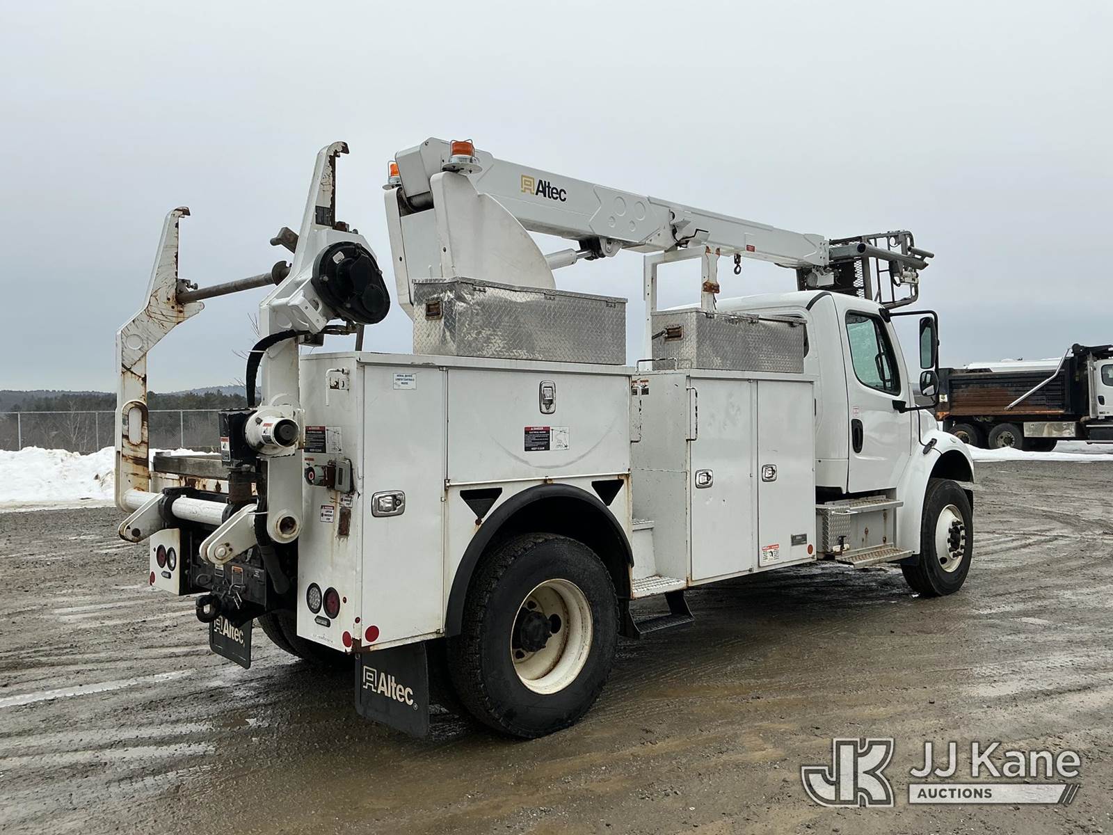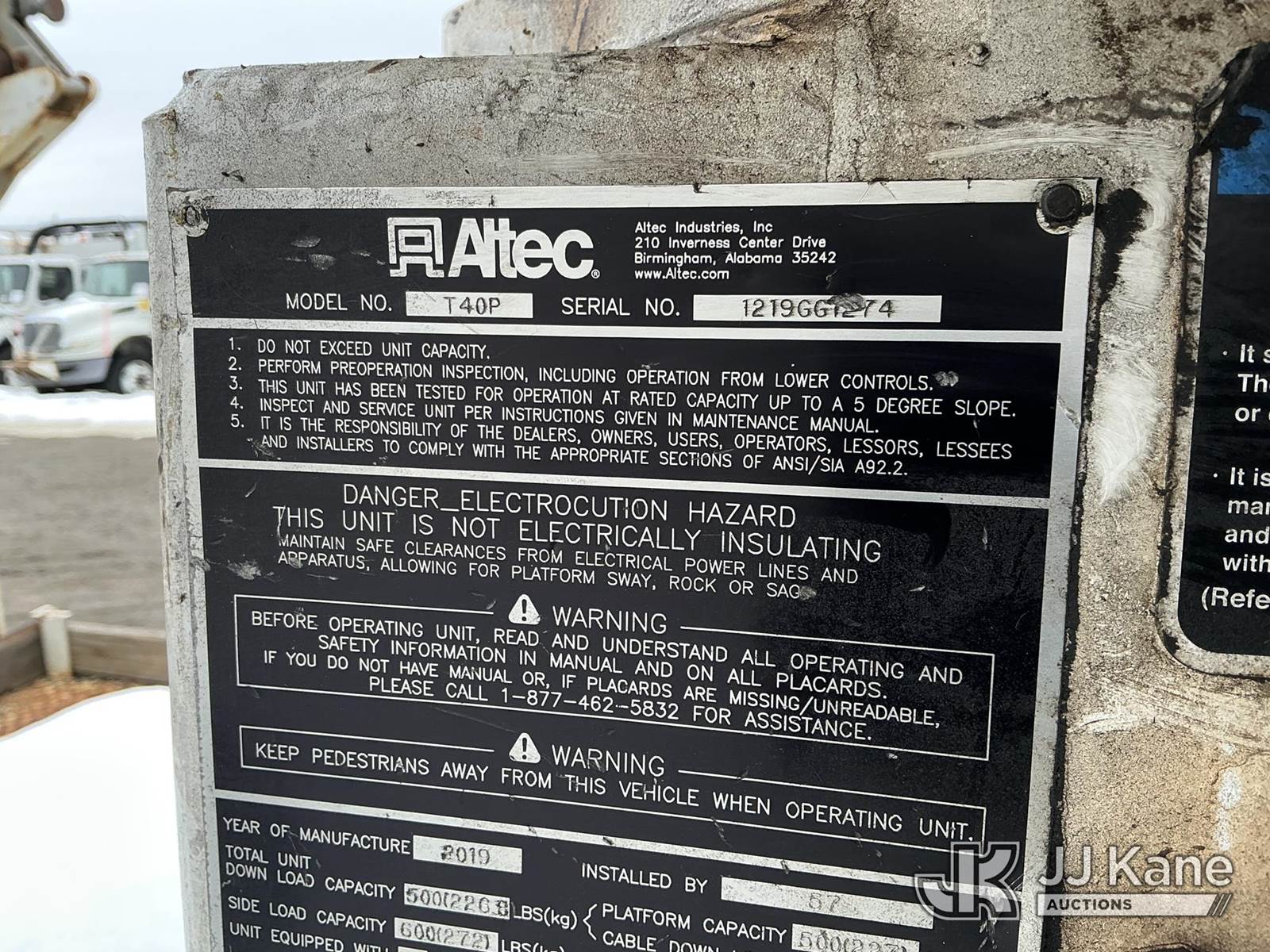 Altec T40P, 40 ft, Telescopic Cable Placing Bucket Truck s/n 1219GG1274, with single-man basket, rear mounted on 2019 Freightliner M2 Utility Truck, Cummins 6.7L diesel, Auto, A/C, with hyd reel carrier, (112,798 miles) (Runs, Moves & Upper Operates) (Reads 8,698 hours) This is a Titled Item NOTE: This unit is being sold AS IS/WHERE IS via Timed Auction and is located in Shrewsbury, MA. Inspection & preview days for this unit are the 2 business days prior to the first day of items closing for this auction, item is located at 11 Fortune Blvd Shrewsbury, MA 01545 and hours of operations are 8a-4p. For pre-sale questions, please contact Rob Gifford @ (508) 864-4126. (Manuals provided in cab) (Buyer is responsible for removal. Assistance by consignor or JJ Kane Auctions is not assured.)