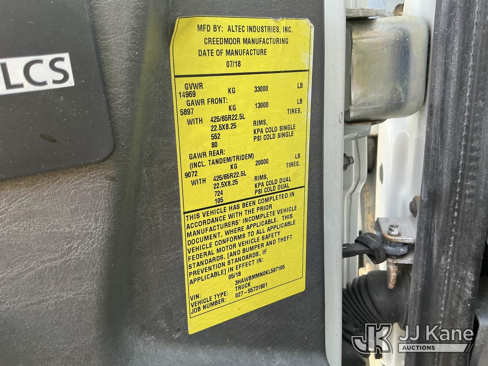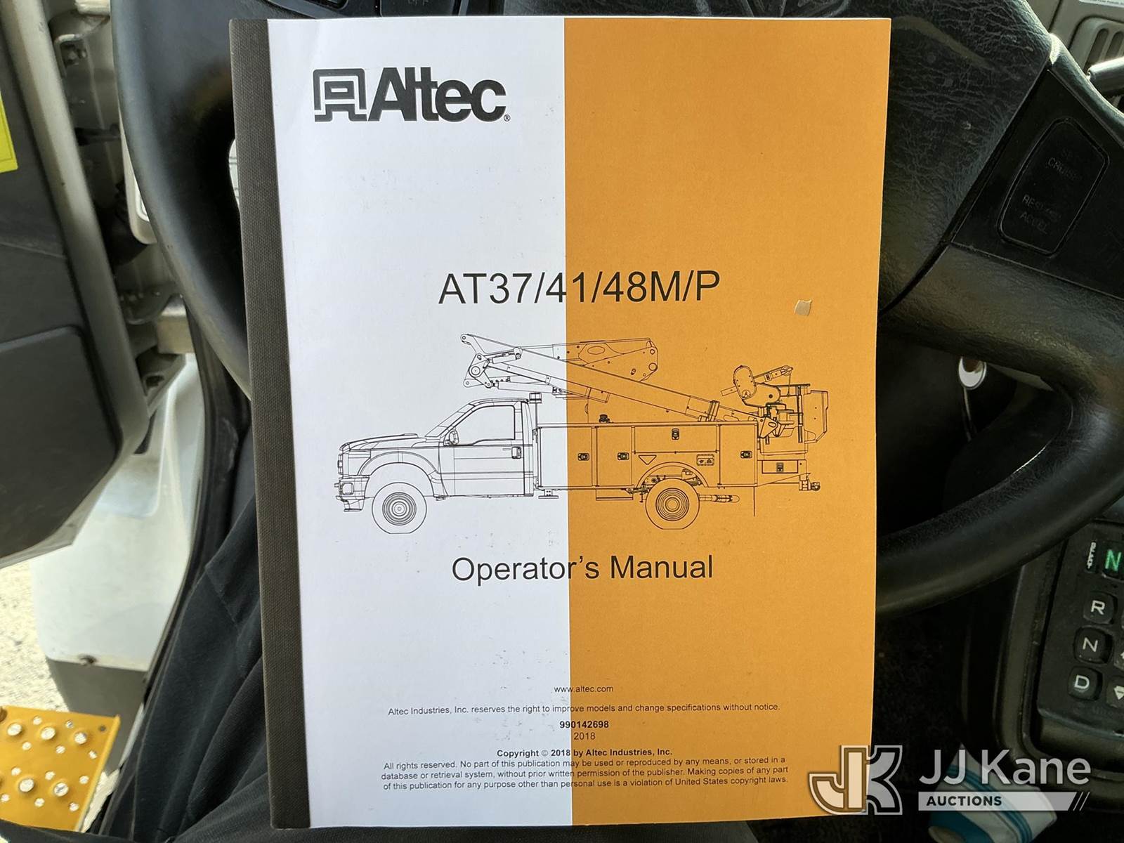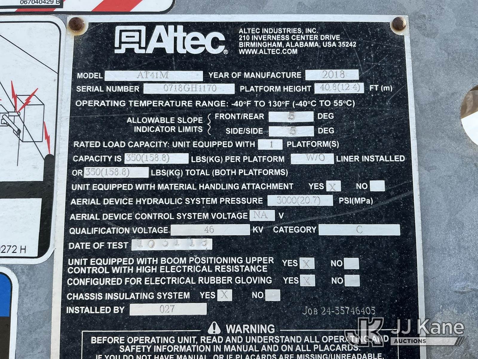 Altec TA41-MH, 45 ft, Articulating & Telescopic Material Handling Bucket Truck s/n 0718GH1170, with single man bucket & 2 hyd outriggers, rear mounted on 2019 International 7300 4X4 Utility Truck, Cummins 6.7L diesel, Auto, A/C, with Tire Boss Inflation System, (93,346 miles) (Runs, Moves & Upper Operates) (Maintenance Light On) (TITLE DELAY) This is a Titled Item NOTE: This unit is being sold AS IS/WHERE IS via Timed Auction and is located in China Grove, NC. Inspection & preview days for this unit are the 2 business days prior to the first day of items closing for this auction, item is located at 820 E NC Hwy 152 China Grove, NC 28023 and hours of operations are 8a-4p. For pre-sale questions, please contact Office Staff @ (704) 674-1113. (Manuals provided in cab) Sales Tax Collected Based on Residency Title To Come From Leasing Company In 30 Days(Buyer is responsible for removal. Assistance by consignor or JJ Kane Auctions is not assured.)