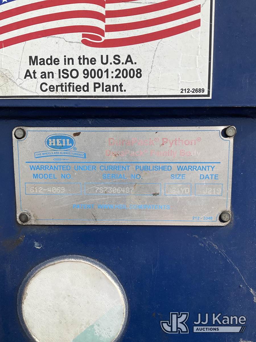 2019 Autocar Xpeditor T/A Trash Compactor Truck, 9.0L CNG Only, Auto, A/C, with Heil DuraPack 31 cubic yard body w/side loading boom & right side steering, (77,101 miles) (Runs, Moves, Operates) (Check Engine Light Is On, Has Minor Body And Paint Damage) (Reads 12,863 hours) This is a Titled Item NOTE: This unit is being sold AS IS/WHERE IS via Timed Auction and is located in Ocala, FL. For more information & removal arrangements please contact Mike Lessard @ 352-629-6677. (Buyer is responsible for removal. Assistance by consignor or JJ Kane Auctions is not assured.)