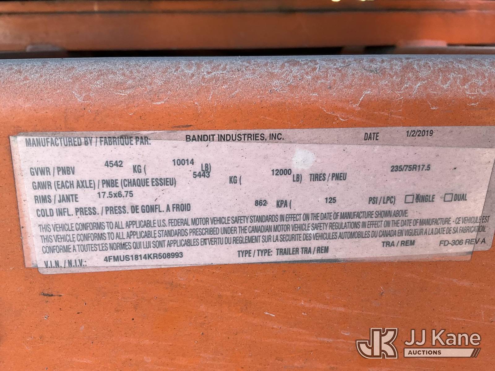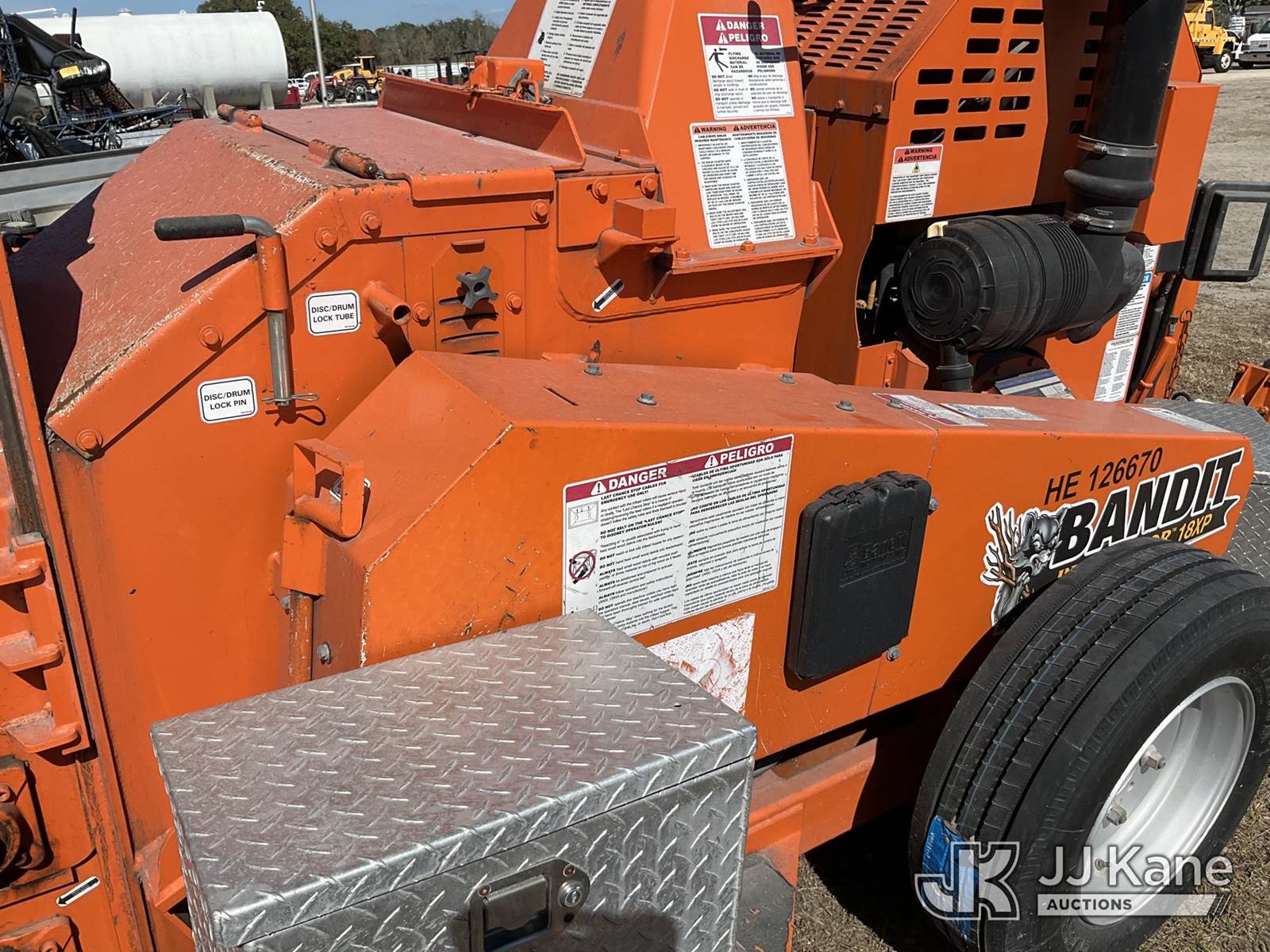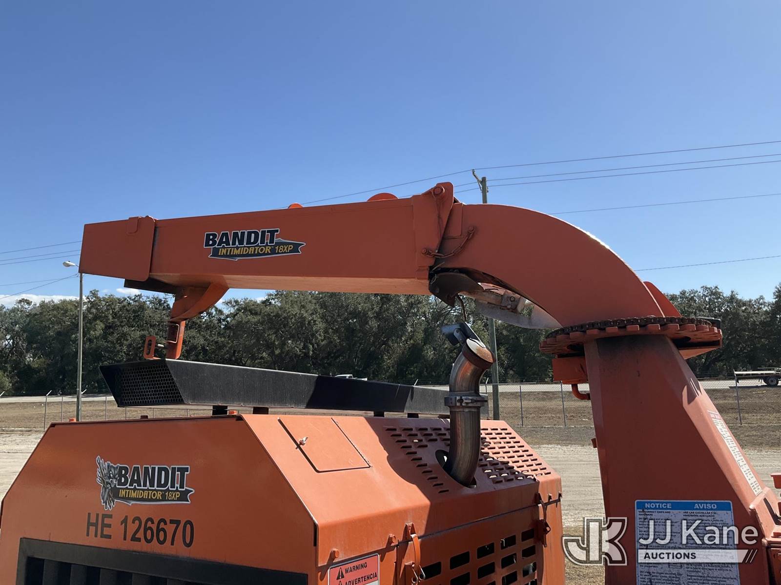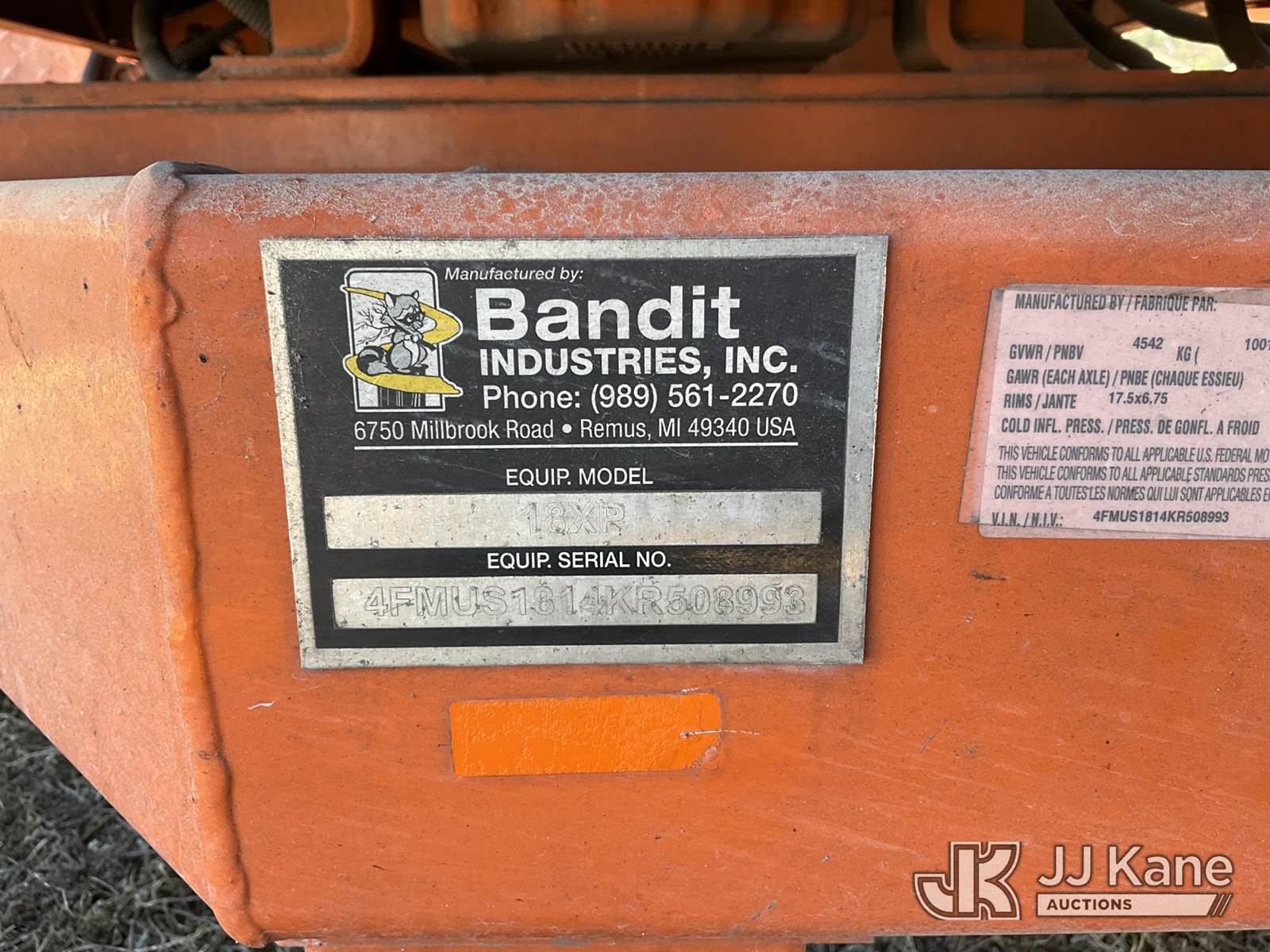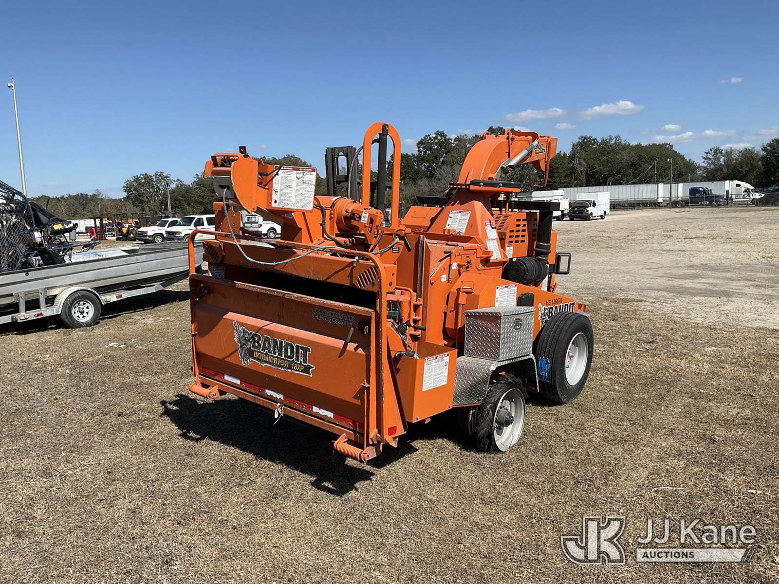 2019 Bandit Industries Intimidator 18XP Portable Chipper (18in Drum), diesel, with winch, trailer mtd. Pinellas County BOCC Unit (Runs & Operates)(Damaged Tire)(FL Residents Purchasing Titled Items – tax, title & registration fees will be collected at the maximum rate of $400.00 under 25,999 and $800.00 for Over 26,000 and $250.00 trailers – Proof of insurance is mandatory; Out of State Residents Purchasing Title Items – tax will be collected based upon your state rate.) (Reads 1,744 hours) This is a Titled Item NOTE: This unit is being sold AS IS/WHERE IS via Timed Auction and is located in Thonotosassa, FL. Inspection & preview days for this unit are the 2 business days prior to the first day of items closing for this auction, item is located at 11720 N US 301 Thonotosassa, Fl 33592 and hours of operations are 8a-4p. For pre-sale questions, please contact Office Staff @ (813) 986-2485. (Buyer is responsible for removal. Assistance by consignor or JJ Kane Auctions is not assured.)
