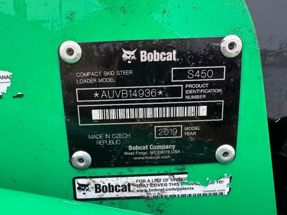 2019 BOBCAT S450 SKIDSTEER LOADER, gp bucket, aux hydraulics, canopy, solid tires, 1,454 hours indicated. s/n:AUVB14936