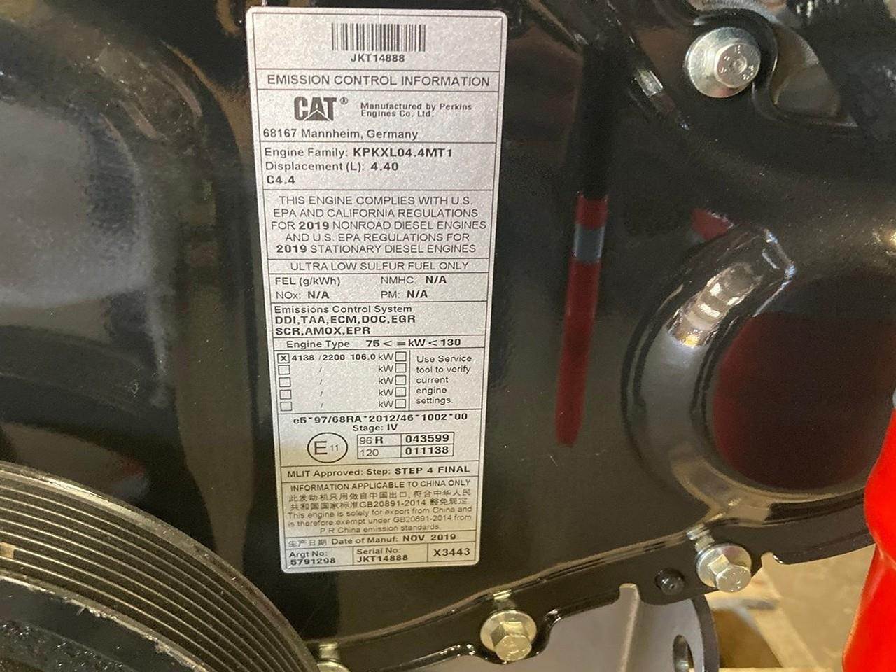 NEW CAT C4.4 ACERT DIESEL ENGINE FOR SALE at ADELMAN’S in CANTON, OHIO. 2019 Yr, All COMPLETE with STARTER, ALTERNATOR, TURBOCHARGER, ECM, FLYWHEEL, and CLEAN EMISSIONS MODULE, 142 HP @ 2200 RPM, 579-1298 ARRANGEMENT #, COMMON RAIL FUEL SYSTEM, TIER 4 FINAL EMISSIONS, KPKXL04.4MT1 FAMILY #, DDI, TAA, ECM, DOC, EGR, SCR, AMOX, & EPR EMISSIONS CONTROL SYSTEMS, and ENGINE TYPE 4138/2200.