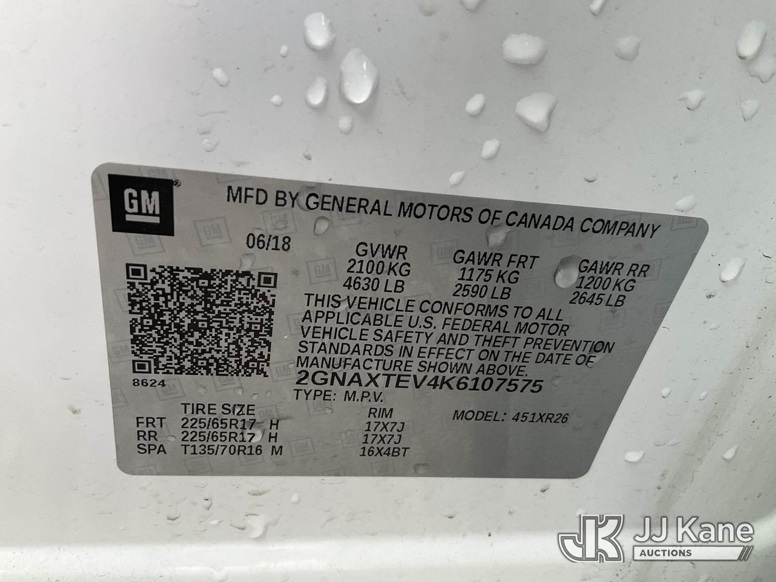 2019 Chevrolet Equinox AWD 4-Door Sport Utility Vehicle, 4-cyl gas, Auto, A/C, (105,829 miles) (DEALER ONLY-TITLE ISSUE FOR NON DEALERS) (Duke Unit) (Runs & Moves) (Bad Battery) This is a Titled Item NOTE: This unit is being sold AS IS/WHERE IS via Timed Auction and is located in Verona, KY. Inspection & preview days for this unit are the 2 business days prior to the first day of items closing for this auction, item is located at 2841 Verona-Mudlick Rd Ste B Verona, KY 41092 and hours of operations are 8a-4p. For pre-sale questions, please contact Office Staff @ (502) 612-5080. Auctioneer Michael Whitebread / License # 256617. (Buyer is responsible for removal. Assistance by consignor or JJ Kane Auctioneers is not assured.)