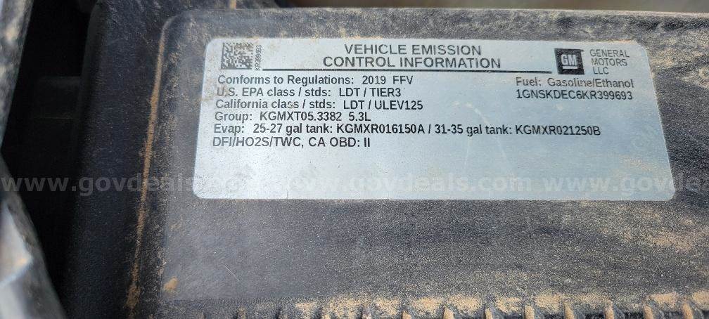2019 Chevrolet Tahoe SPORT UTILITY 4-DR, 5.3L V8 OHV 16V. Starts and runs with a jump start. Needs a new battery.