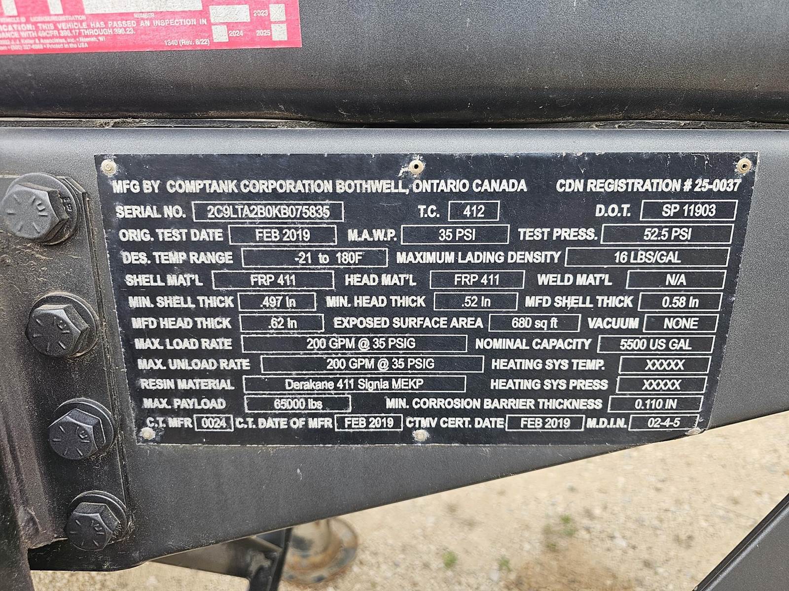 2019 Comptank, air ride, FRP, 11R24.5, 5500 gallon, new test, aluminum wheels, new tires, new brakes, side tray, $ 95,000.00