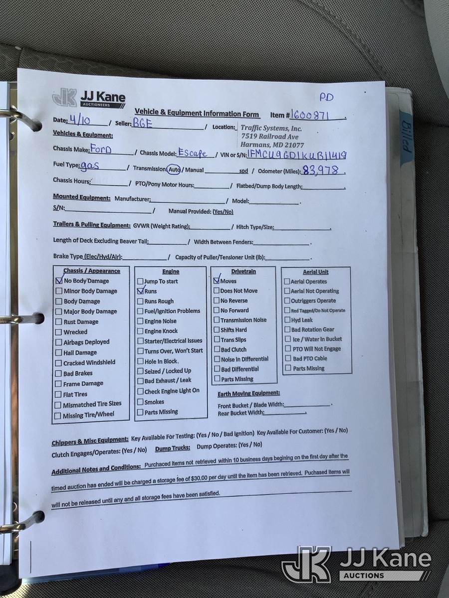 2019 Ford Escape 4x4 4-Door Sport Utility Vehicle, 1.5L L4 Gas, Automatic, A/C, (83,978 miles) (Runs & Moves TPS Light On) (Removal is by Appointment Only, Buyer MUST make a appointment prior to picking up, Buyer/Transporter Must have PAID IN FULL RELEASE. No onsite assistance available, Please Come prepared.) This is a Titled Item NOTE: This unit is being sold AS IS/WHERE IS via Timed Auction and is located in Harmans, MD. Inspection & preview days for this unit are by appointment only; please contact us at contact@jjkane.com or 84-Go-JJKane for more details. For pre-sale questions, please contact the on-site office @ (443) 557-0025 or Kevin.Waggoner@JJKane.com. (Buyer is responsible for removal. Assistance by consignor or JJ Kane Auctions is not assured.)