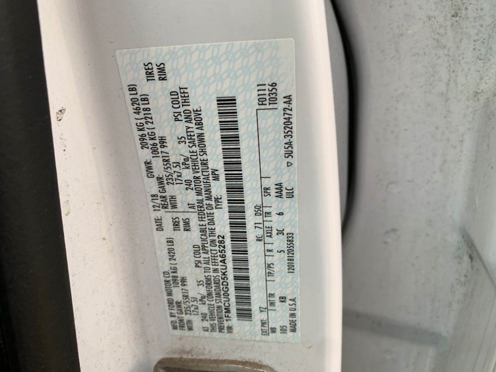 **2019 FORD ESCAPE SUV, 1.5 L gasoline, automatic, a/c, pw, pdl, pm, 55,354 miles indicated. s/n:1FMCU0GD5KUA65282