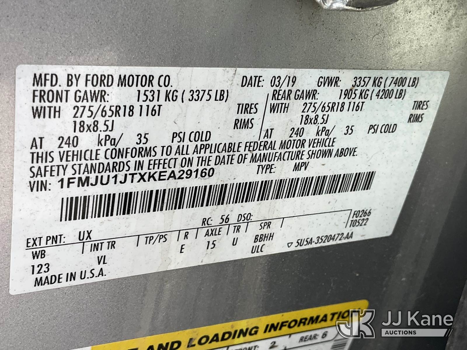 2019 Ford Expedition 4x4 4-Door Sport Utility Vehicle, 6-cyl gas, Auto, A/C, (124,166 miles) (Runs & Moves) (K9 Unit) This is a Titled Item NOTE: This unit is being sold AS IS/WHERE IS via Timed Auction and is located in Phoenix, AZ. Inspection & preview days for this unit are the 2 business days prior to the first day of items closing for this auction, item is located at 2505 W Durango St Phoenix, AZ 85009 and hours of operations are 8a-4p. For pre-sale questions, please contact Andrew Espinoza @ (602) 393-8107. (Buyer is responsible for removal. Assistance by consignor or JJ Kane Auctions is not assured.)