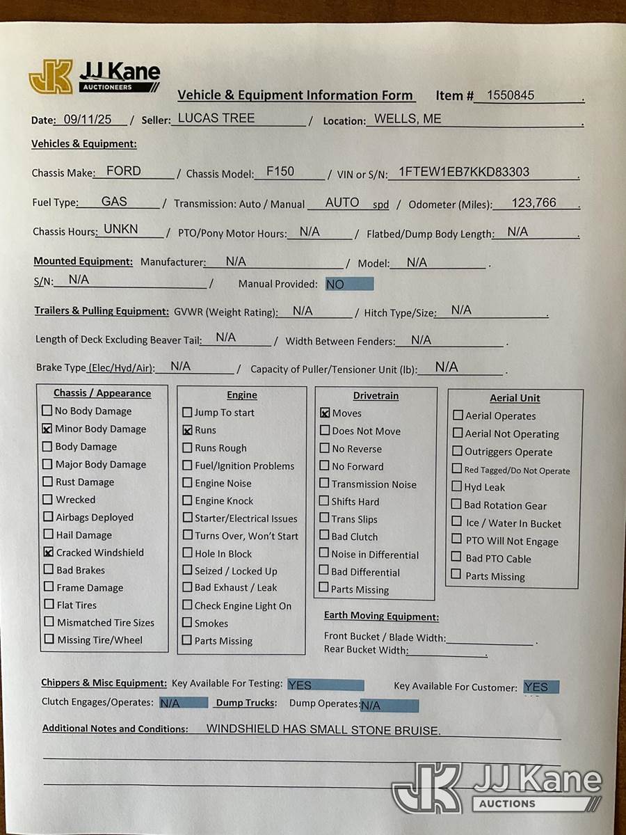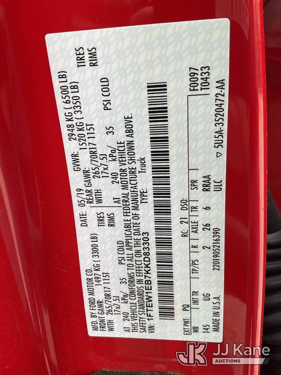 2019 Ford F-150 Crew-Cab Pickup Truck, 3.3L V6 DOHC 24V Auto, RWD, Gas, (123,766 miles) (Runs & Moves) (Windshield Has Small Stone Bruise) This is a Titled Item NOTE: This unit is being sold AS IS/WHERE IS via Timed Auction and is located in Wells, ME. Inspection & preview days for this unit are by appointment only; please contact us at contact@jjkane.com or 84-Go-JJKane for more details. (Buyer is responsible for removal. Assistance by consignor or JJ Kane Auctioneers is not assured.)