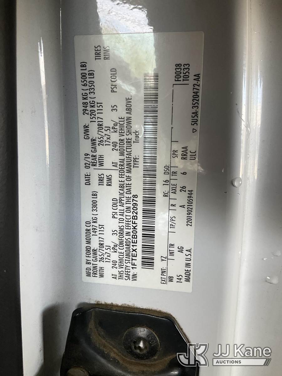 2019 Ford F-150 Extended-Cab Pickup Truck, s/n 1FTEX1EB0KFB20978, 3.3L V6 DOHC 24V Gas, 4WD, 6-Speed Automatic, A/C, with Tow package, (207,759 miles) (Runs & Moves) (Engine Light On, Runs Rough) (Bidding Restricted to Licensed Vehicle Dealers Only), This is a Titled Item NOTE: This unit is being sold AS IS/WHERE IS via Timed Auction and is located in Jurupa Valley, CA. Inspection & preview days for this unit are the 2 business days prior to the first day of items closing for this auction, item is located at 4510 Muth Way Jurupa Valley, CA 92509 and hours of operations are 8a-4p. For pre-sale questions, please contact please contact Office Staff @ (310) 353-7140. Dealer License Number 45696. (Buyer is responsible for removal. Assistance by consignor or JJ Kane Auctions is not assured.)