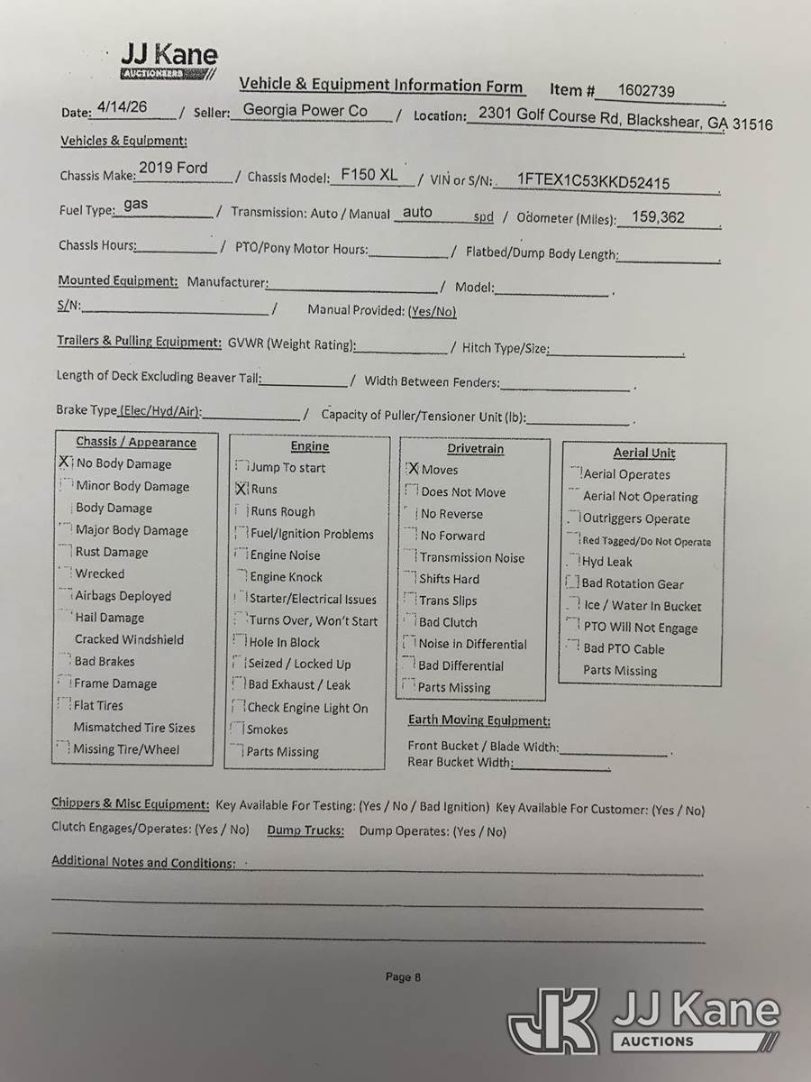 2019 Ford F-150 Extended-Cab Pickup Truck, 8-cyl gas, RWD, Auto, A/C, (159,362 miles) (Runs & Moves) This is a Titled Item NOTE: This unit is being sold AS IS/WHERE IS via Timed Auction and is located in Blackshear, GA. Inspection & preview days for this unit are by appointment only; please contact us at contact@jjkane.com or 84-Go-JJKane for more details. (Buyer is responsible for removal. Assistance by consignor or JJ Kane Auctions is not assured.)