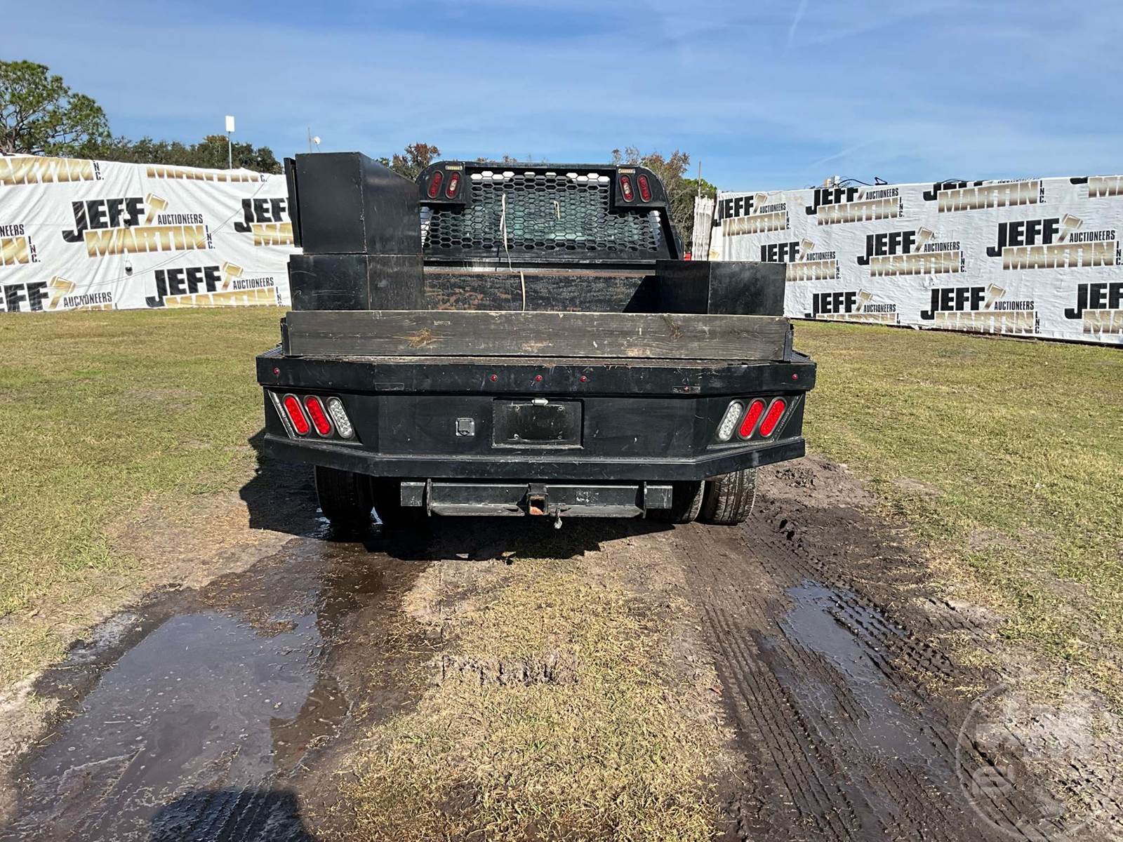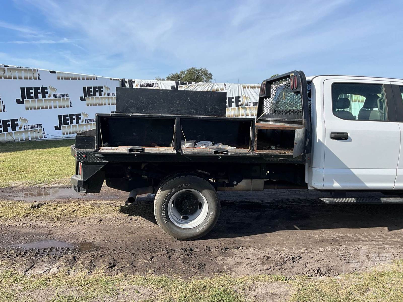SINGLE AXLE CREW CAB 4X4 FLATBED TRUCK, 9', STEEL BED, 6.2L, AUTOMATIC, SPRING SUSPENSION, HEADACHE RACK, CRUISE CONTROL, 180 " WB, 14000 GVWR, 245/75R17 TIRES, 5200 FRONTS, 10040 REARS, TOOL BOXES, ODOMETER READS: 136212