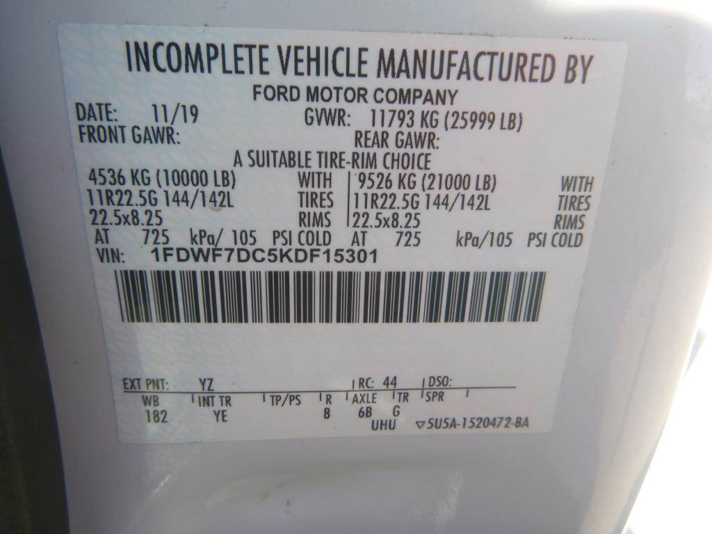 VIN: 1FDWF7DC5KDF15301 6.7L V8 Diesel, Automatic, 25,999lbs GVWR, 10,000lbs Front Axle, 21,000lbs Rear Axle, AC, Heat, AM/FM, Cruise Control, DEF, PTO, Trailer Brake Controller, Air Brakes, 12' Chipper Dump Box, Spring Suspension, Pintle Hitch, 182" Wheel Base, 22.5" Tire Size Odometer Reading: 041,027 Disclaimer: Mileage and hours are visually observed and not verified.