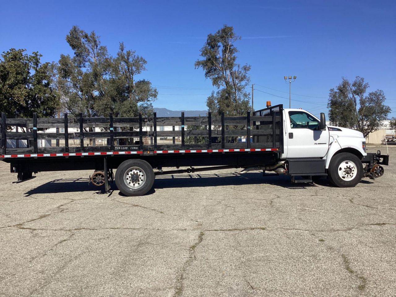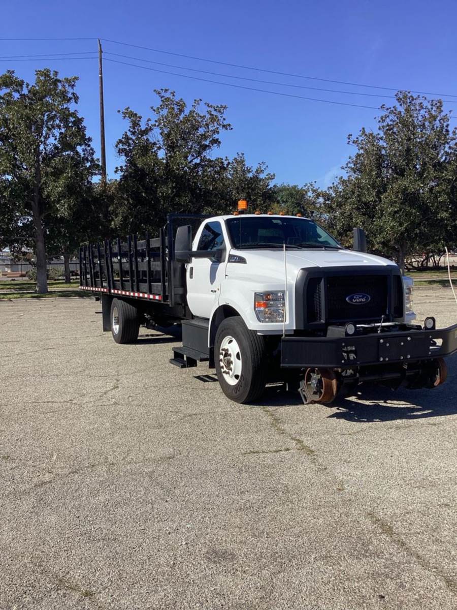 2019 Ford F750 4x2 Hi-Rail Flatbed Truck, 10,614 Miles, 12,000 Lbs. FAWR, 21,000 Lbs. RAWR, 33,000 Lbs. GVWR, 6.7L Power Stroke Engine, 270 Horsepower, Allison Transmission, Flatbed With Stake Sides, 24.6 Ft. Length, 8.5 Ft. Width, DMF Rail Gear