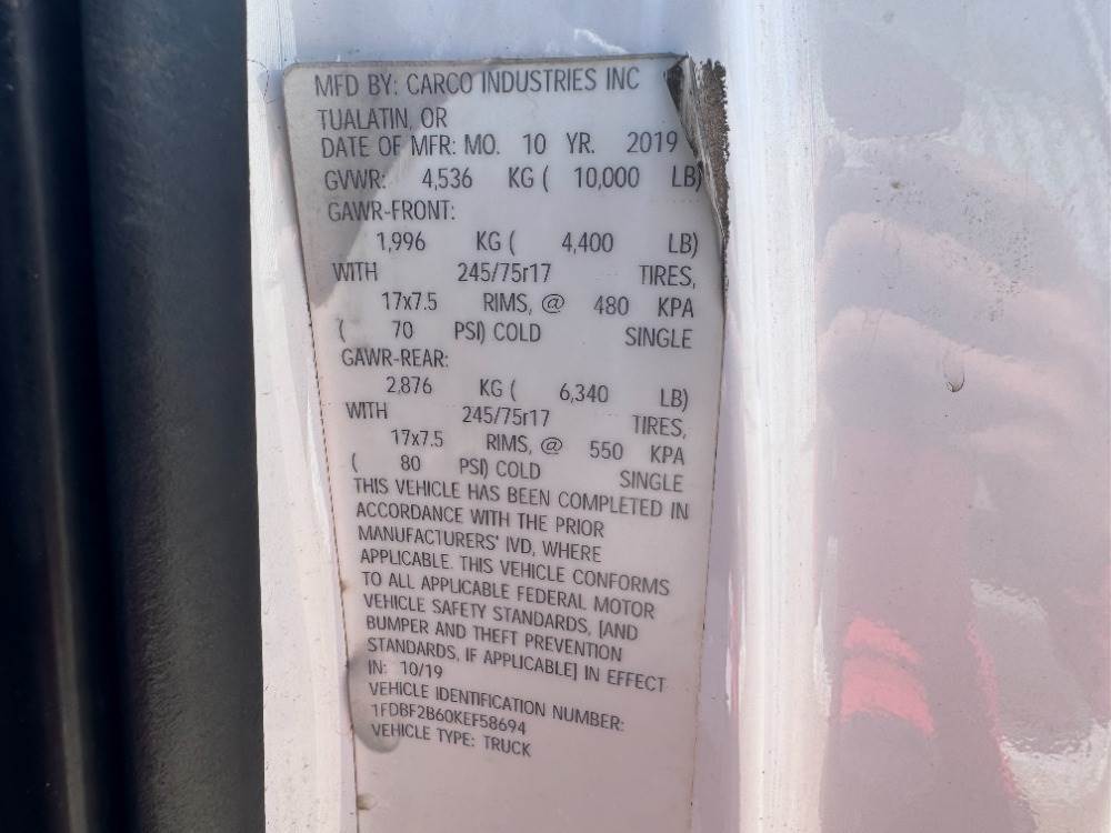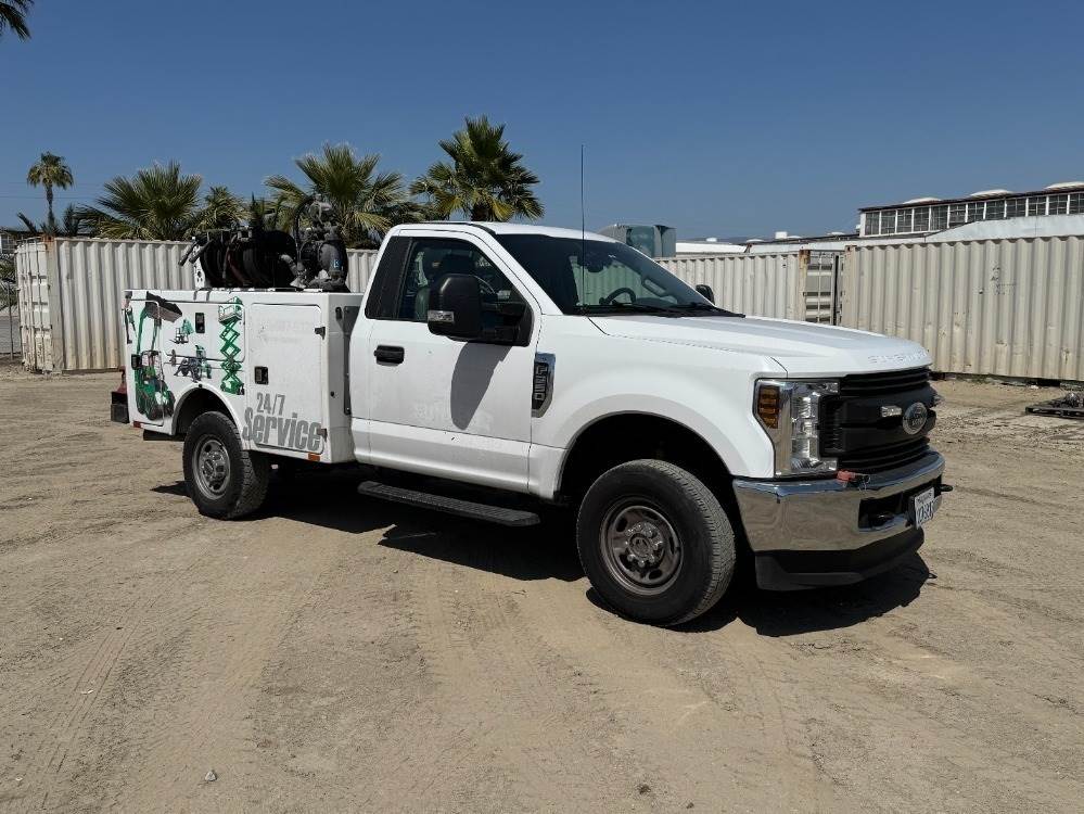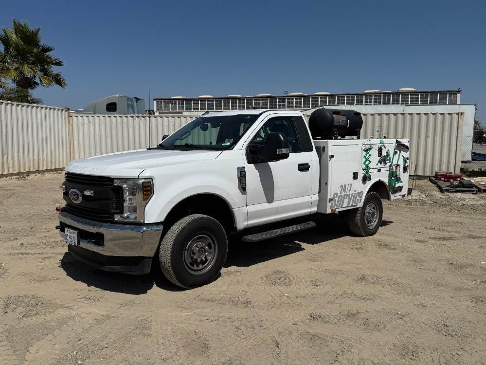 2019 FORD F250XL SERVICE TRUCK, 6.2L gasoline, automatic, 4x4, a/c, pw, pdl, pm, 8' service bed, 30-gallon product tank, Mi-T-M air compressor, hose reels, tow package. s/n:1FDBF2B60KEF58694