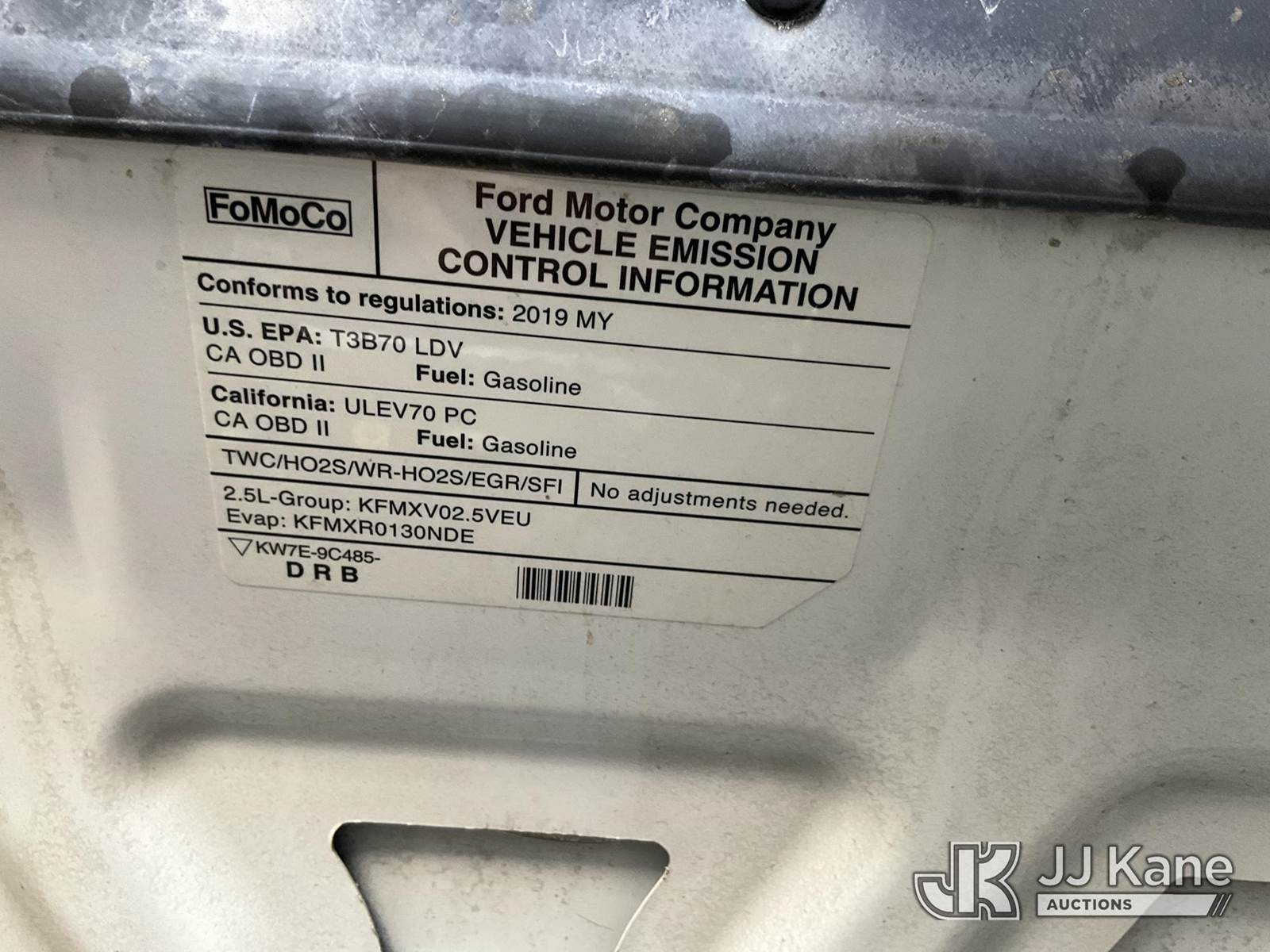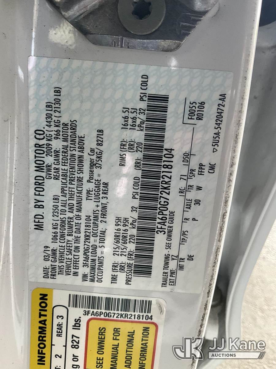 2019 Ford Fusion 4-Door Sedan, s/n 3FA6P0G72KR218104, 4-cyl gas, 6-Speed Automatic, A/C, (047,753 miles) (Runs & Moves) This is a Titled Item NOTE: This unit is being sold AS IS/WHERE IS via Timed Auction and is located in Jurupa Valley, CA. Inspection & preview days for this unit are the 2 business days prior to the first day of items closing for this auction, item is located at 4510 Muth Way Jurupa Valley, CA 92509 and hours of operations are 8a-4p. For pre-sale questions, please contact please contact Office Staff @ (310) 353-7140. Dealer License Number 45696. (Buyer is responsible for removal. Assistance by consignor or JJ Kane Auctioneers is not assured.)