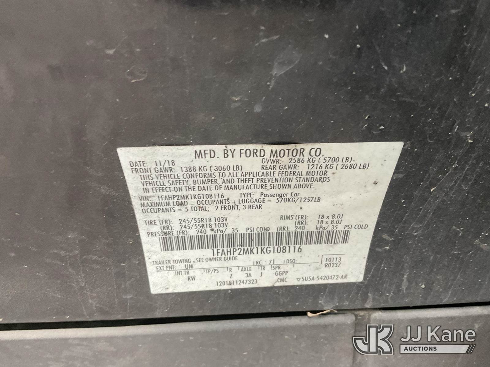 2019 Ford Taurus Police AWD 4-Door Sedan, 6-cyl gas, 6-Speed Automatic, A/C, (79,727 miles) Open Recall, Remedy Not Yet Available, Vehicle is subject to an open NHTSA safety recall related to ON YOUR VEHICLE, THE REAR VIEW CAMERA COULD DISPLAY A BLANK OR DISTORTED IMAGE ON THE CENTER DISPLAY SCREEN WHEN THE VEHICLE IS IN REVERSE. YOU MAY ALSO RECEIVE A MESSAGE THAT THE REAR VIEW CAMERA IS UNAVAILABLE ON THE CENTER DISPLAY SCREEN., but a remedy for this recall does not appear to be available. Dealer is not authorized to perform the recall repair. Periodically contact the manufacturer or check the VIN on the NHTSA website at www.safercar.govivin to determine whether a remedy for the recall is available. As soon as a remedy is available, arrange to have the recall remedied with a dealer from that make of car to make such repair. Open Recall, Remedy Not Yet Available, Vehicle is subject to an open NHTSA safety recall related to ON YOUR VEHICLE, THE FRONT DRIVER AND PASSENGER DOOR B-PILLAR TRIM APPLIQUES MAY BECOME PARTIALLY OR FULLY DETACHED. YOU MAY VISUALLY NOTICE THE B-PILLAR TRIM APPLIQUES SEPARATING FROM THE TOP OF THE FRONT DOORS WHEN ENTERING EXITING THE VEHICLE. YOU ALSO NOTICE A WIND NOISE AND RATTLING NOISE AS YOU, but a remedy for this recall does not appear to be available. Dealer is not authorized to perform the recall repair. Periodically contact the manufacturer or check the VIN on the NHTSA website at www.safercar.govivin to determine whether a remedy for the recall is available. As soon as a remedy is available, arrange to have the recall remedied with a dealer from that make of car to make such repair. (Runs & Moves) (No Emissions Sticker, Collision Damage To Rear Driver Side) (Bidding Restricted to Licensed Vehicle Dealers Only), This is a Titled Item NOTE: This unit is being sold AS IS/WHERE IS via Timed Auction and is located in Jurupa Valley, CA. Inspection & preview days for this unit are the 2 business days prior to the first day of items closing for this auction, item is located at 4510 Muth Way Jurupa Valley, CA 92509 and hours of operations are 8a-4p. For pre-sale questions, please contact please contact Office Staff @ (310) 353-7140. Dealer License Number 45696. (Buyer is responsible for removal. Assistance by consignor or JJ Kane Auctions is not assured.)