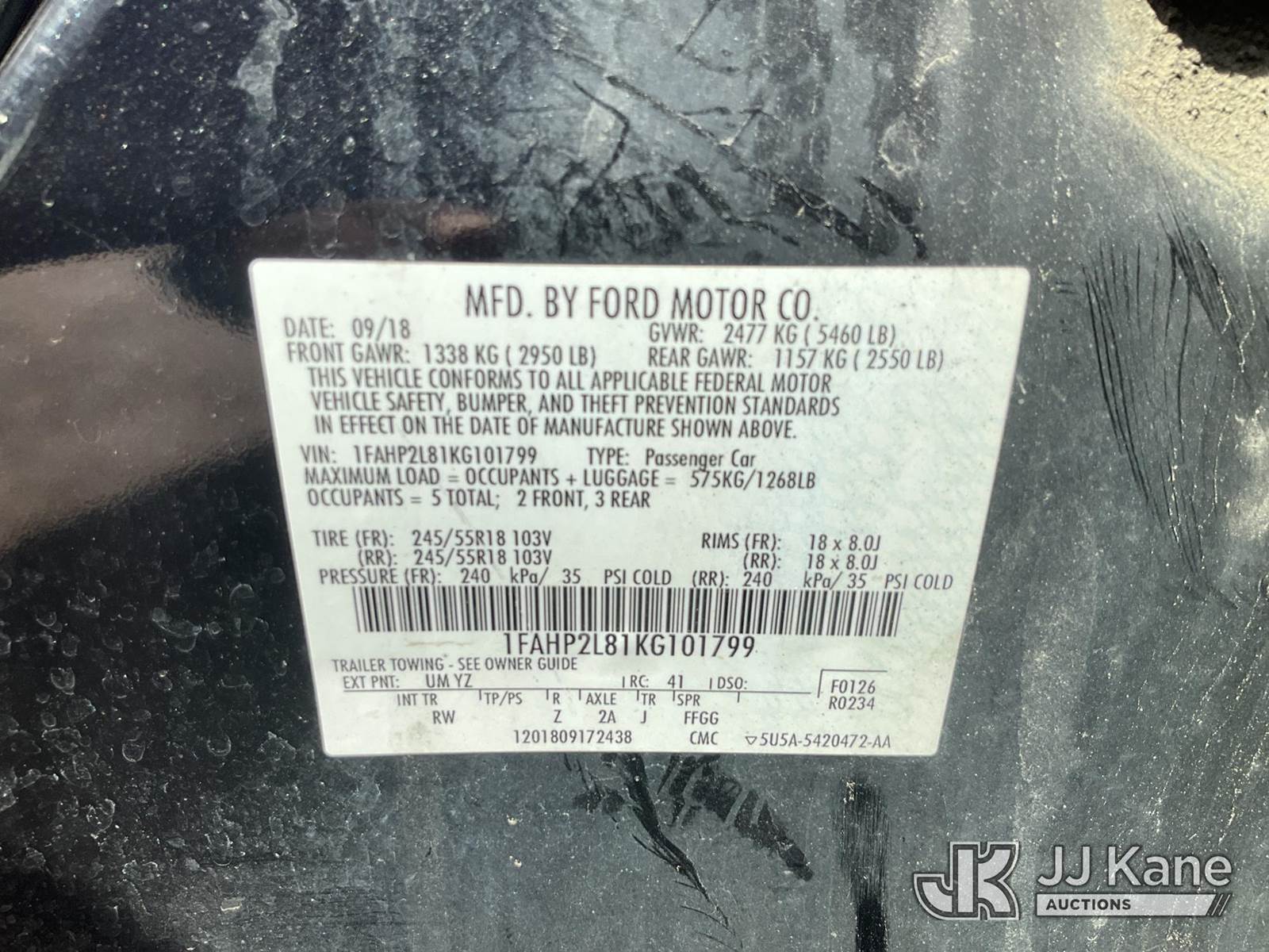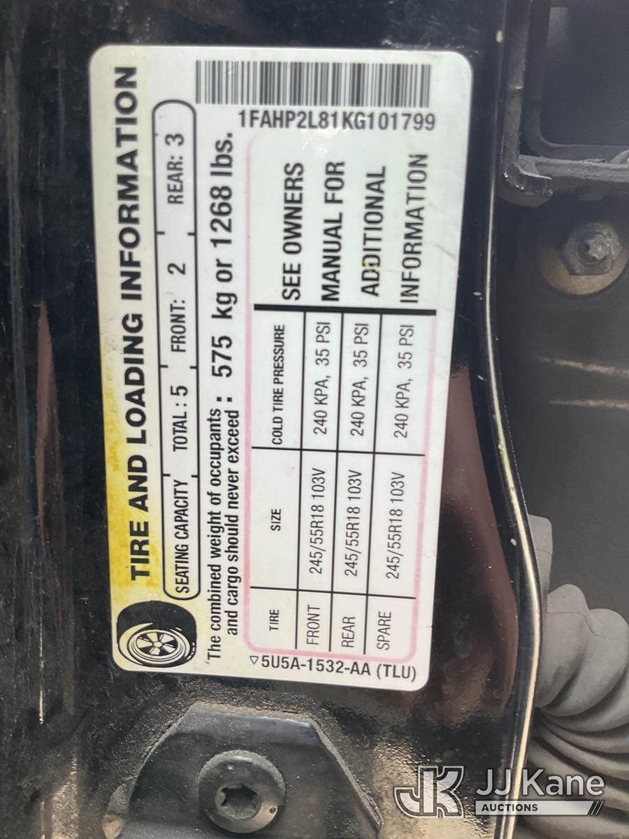 2019 Ford Taurus Police FWD 4-Door Sedan, s/n 1FAHP2L81KG101799, 3.5L V6 DOHC 24V GAS, Auto, A/C, (124,907 miles) (Runs & Moves) (Miscellaneous Defects) (Branded Title - Police Vehicle) (Reads 23,891 hours) This is a Titled Item NOTE: This unit is being sold AS IS/WHERE IS via Timed Auction and is located in South Beloit, IL. Inspection & preview days for this unit are the 2 business days prior to the first day of items closing for this auction, item is located at 14354 Dearborn Ave South Beloit, IL and hours of operations are 8a-4p. For pre-sale questions, please contact Derek Eklund at (608) 904-0618 or (derek.eklund@jjkane.com). (Buyer is responsible for removal. Assistance by consignor or JJ Kane Auctions is not assured.)