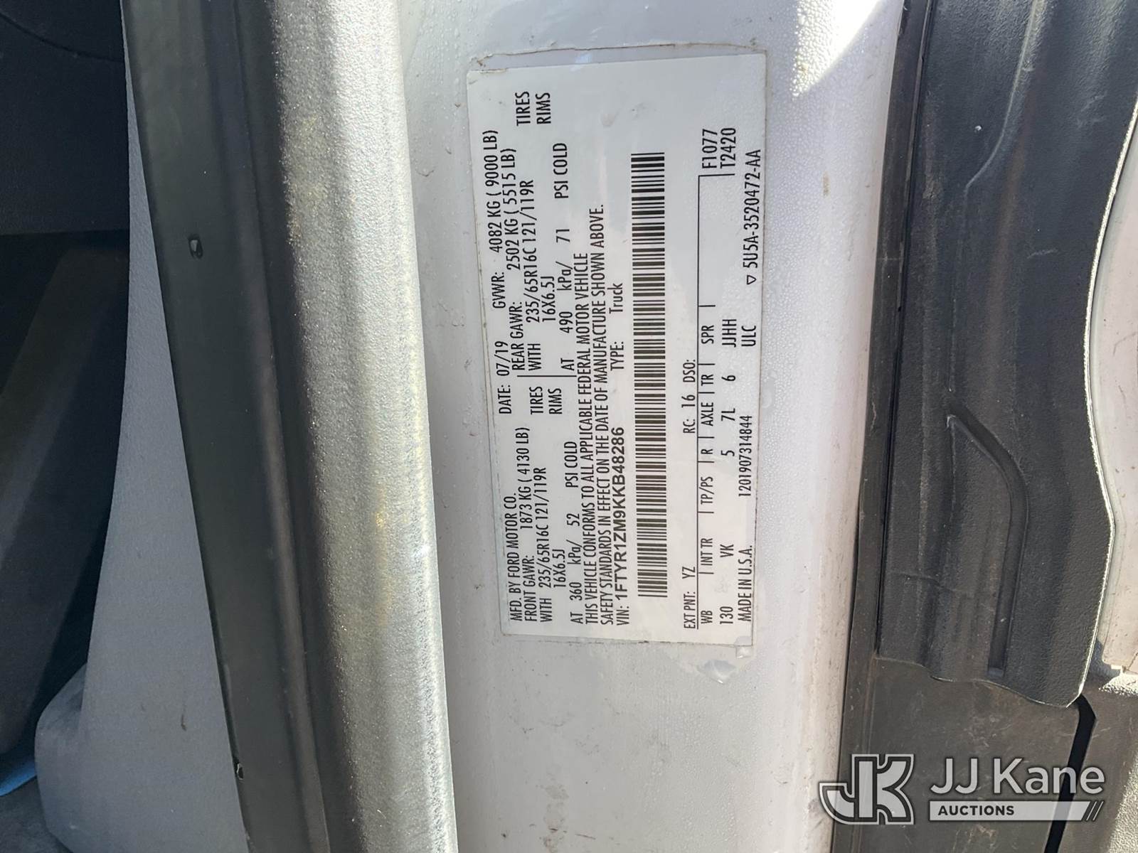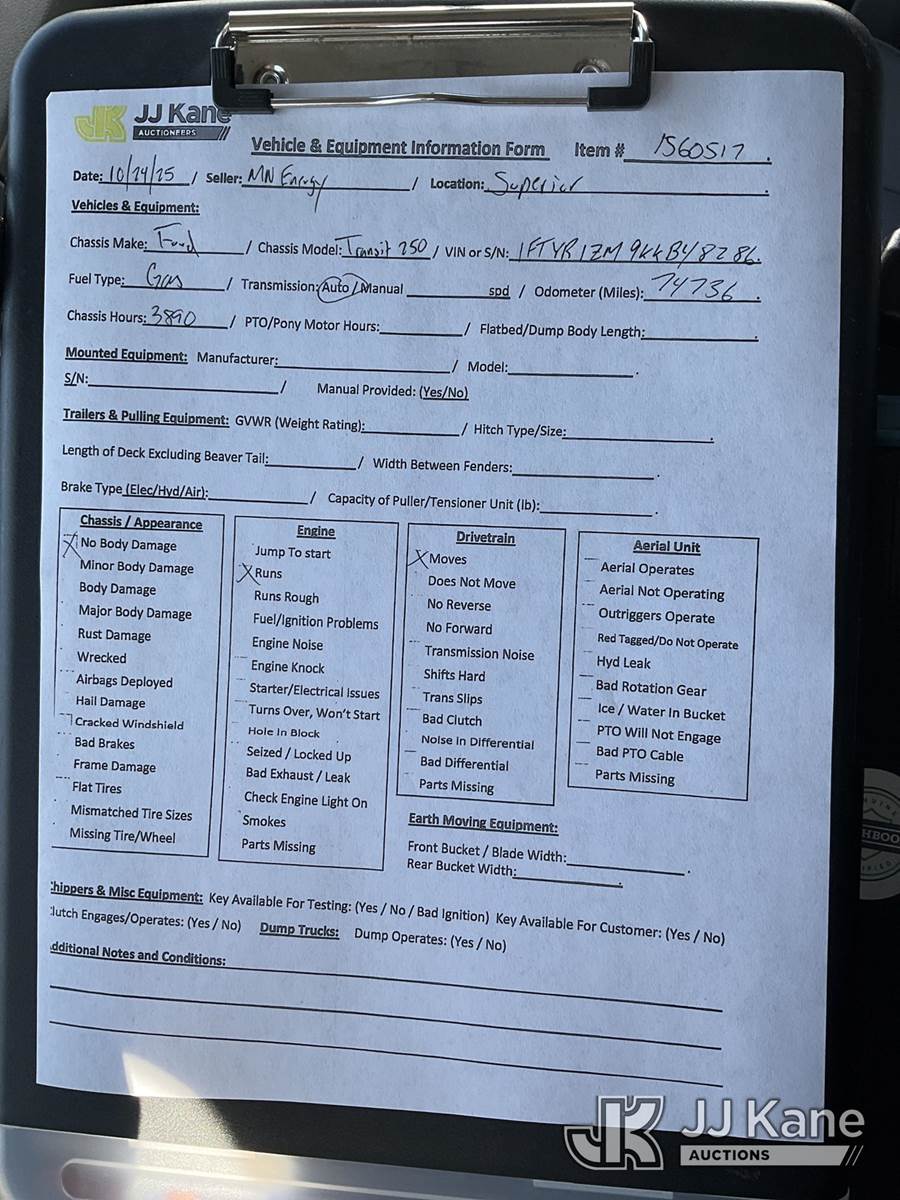 2019 Ford Transit Cargo Van, 6-cyl gas, 6-Speed Automatic, A/C, (074,736 miles) (Runs & Moves) (No Body Damage) This is a Titled Item NOTE: This unit is being sold AS IS/WHERE IS via Timed Auction and is located in Superior, WI. Inspection & preview days for this unit are by appointment only; please contact us at contact@jjkane.com or 84-Go-JJKane for more details. (Buyer is responsible for removal. Assistance by consignor or JJ Kane Auctioneers is not assured.)