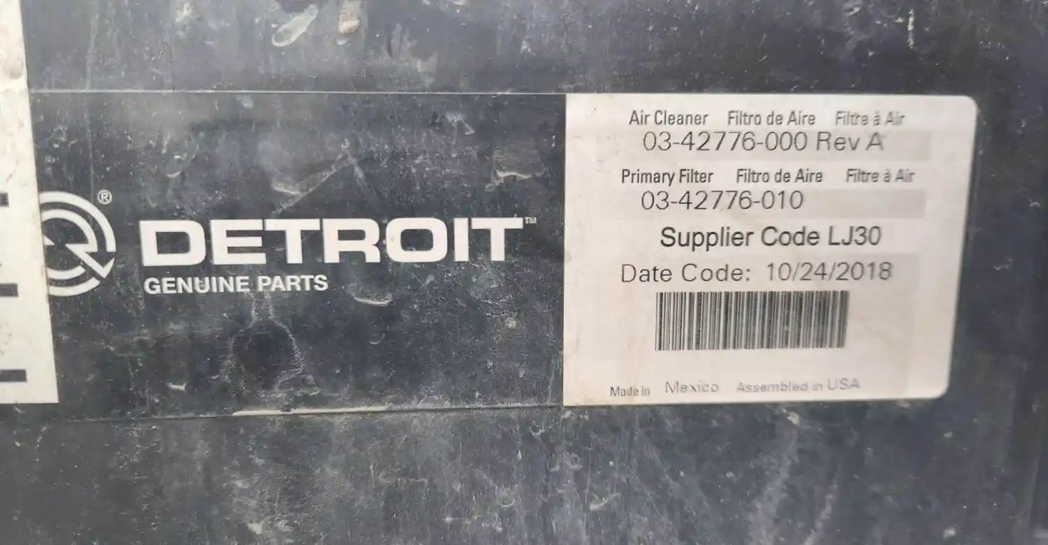 (Used) 2019 Freightliner Cascadia 126, AIR CLEANER- Part Number: 03-42776-000, Side: Center Of Truck, Color: Black, Material: Plastic, Engine: Detroit DD15, Dimensions: L=31 ½", H=8", W=25", Reference images for condition, For more information about this item, give us a call. We ship Worldwide! (CRG HEAVY TRUCK PARTS) 929 W PULASKI HWY ELKTON, MD 21921, Dimensions: L=31 ½", H=8", W=25", Material: Plastic, Shape: Rectangular