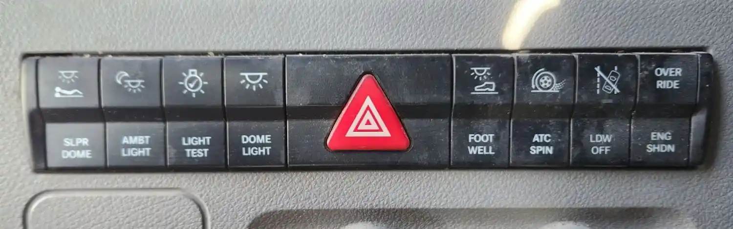 (Used) 2019 Freightliner Cascadia 126, MISCELLANEOUS DASH SWITCHES- Controls: Sleeper Dome, Ambt Light, Light Test, Dome Light, Hazard Lights, Foot Well, Atc Spin, Ldw Off, Override Eng Shdn, Material: Plastic, Reference images for condition, For more information about this item, give us a call. We ship Worldwide! (CRG HEAVY TRUCK PARTS) 929 W PULASKI HWY ELKTON, MD 21921, Material: Plastic