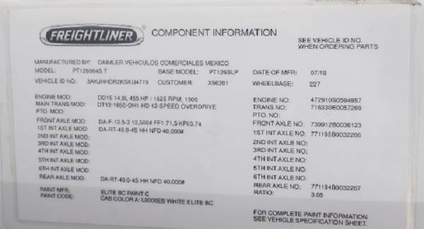 2019 FREIGHTLINER Cascadia · Detroit Diesel DD15- 500 hp DT12 Automated Manual Transmission Detroit HD AMT clutch Eaton Advantage 15-1/2” self-adjusting clutch · Detroit DA-F 16,000lb · Freightliner Taper Leaf 14,600lb · Freightliner Taper Leaf 16,000lb TRW TAS-85 power steering box Meritor RT46-160 GP Meritor RPL25SD Bendix ADB22X air disc brakes WABCO 6S/6M ABS Electronic Stability Control (ESC) Integrated FUPD bumper integrated FUPD bulbar DUAL FUEL TANKS • Microwave, TV and refrigerator provision 729,512 miles, Financing Available.