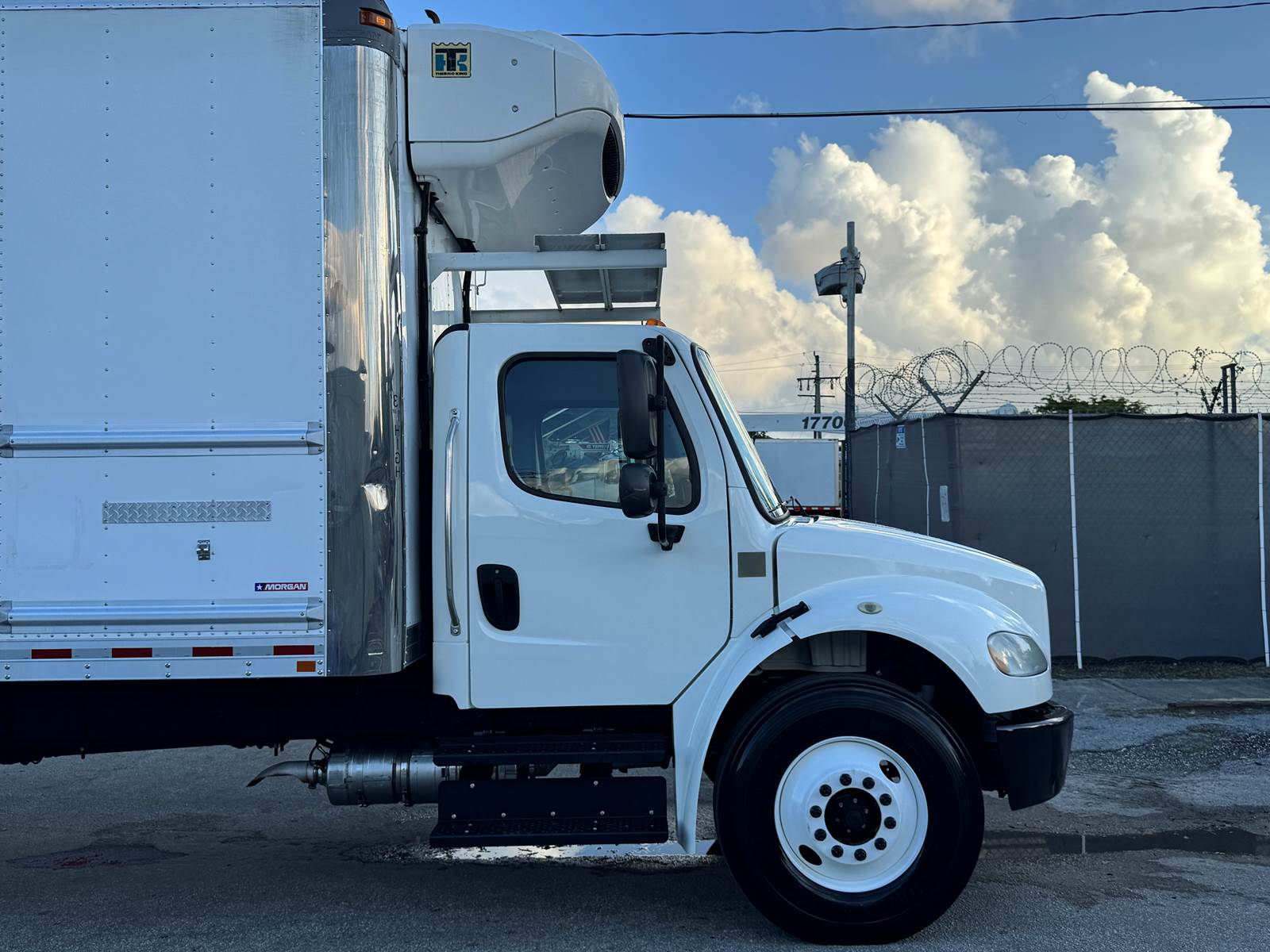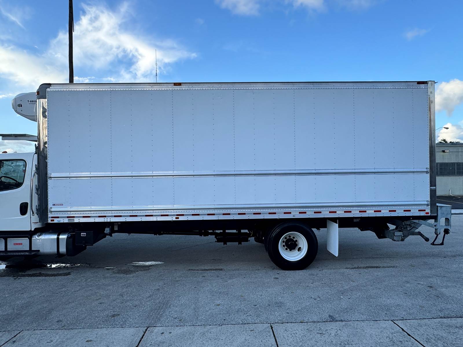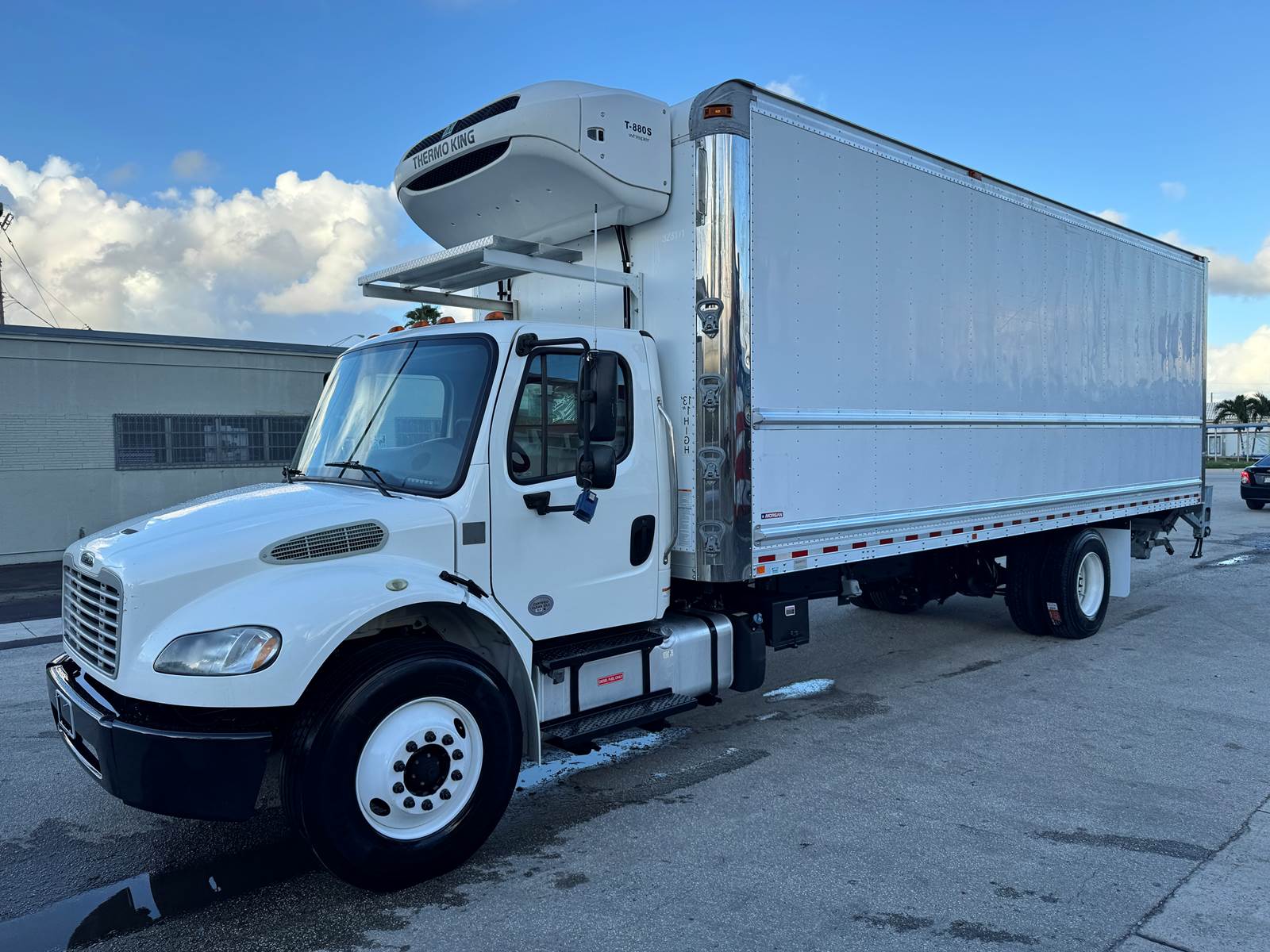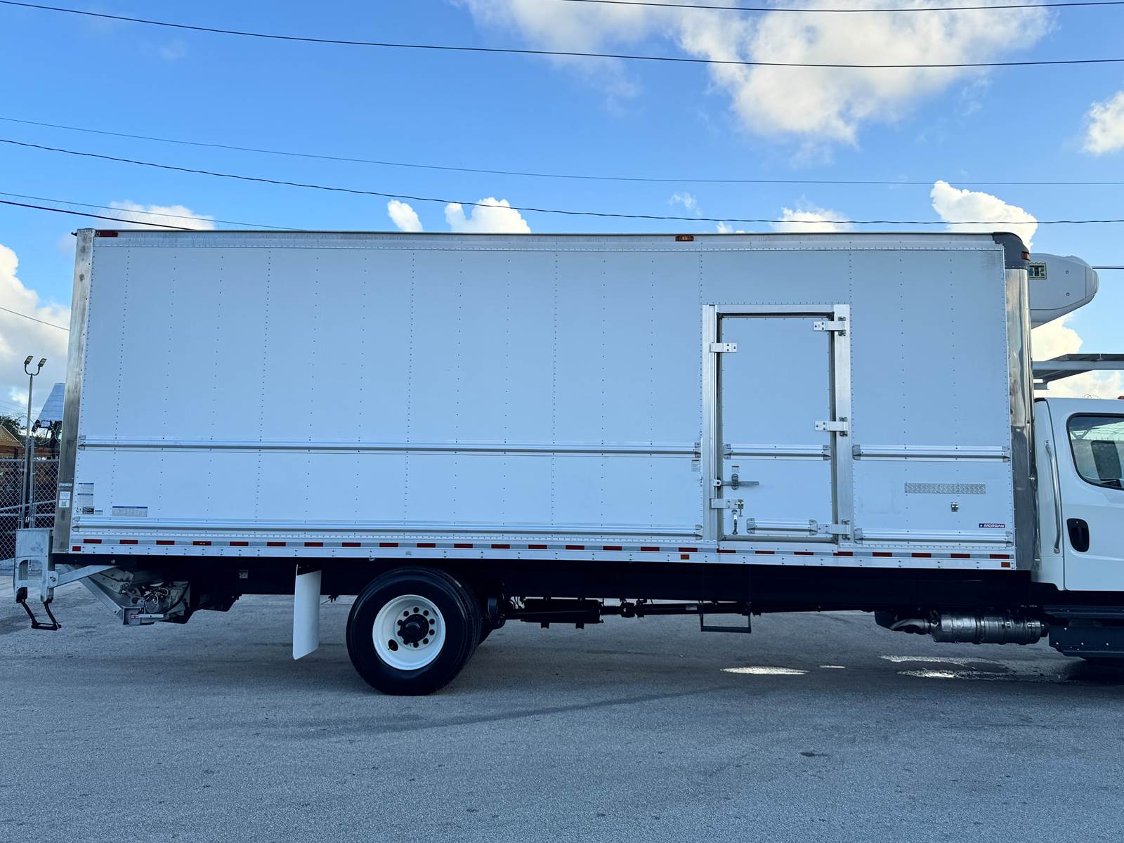 The truck is equipped with a Morgan insulated 26-foot reefer body featuring an extruded aluminum floor, curbside swing door, and roll-up rear door for efficient access. Cargo management is supported by two rows of E-tracks, while a 3,000 lb aluminum tuckaway liftgate simplifies loading and unloading. Temperature control is maintained by a Thermo King T-880S Whisper standalone reefer unit with electric standby capability, designed for efficient, quiet operation. The body measures 26’ long, 103” high, and 102” wide, making it ideal for perishable goods transport.