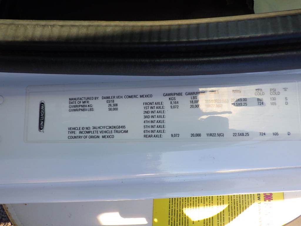 VIN: 3ALHCYFC3KDKG8495 Cummins 6-CYL Turbo Diesel, Automatic Allison, Air Brakes, Air Ride Seat, Back Up Camera, Trailer Brake Controller, Cruise Control, Cloth Interior, Spring Suspension, PTO, Differential Lock, DEF, X5 Spray Heads, Reel w/ Hose, 18,000 LBS Front Axle, 20,000 LBS x2 Rear Axle, 11R22.5 Tires, GVWR 58,000 LBS, Odometer Reading: 12,909 Disclaimer: Mileage and hours are visually observed and not verified.