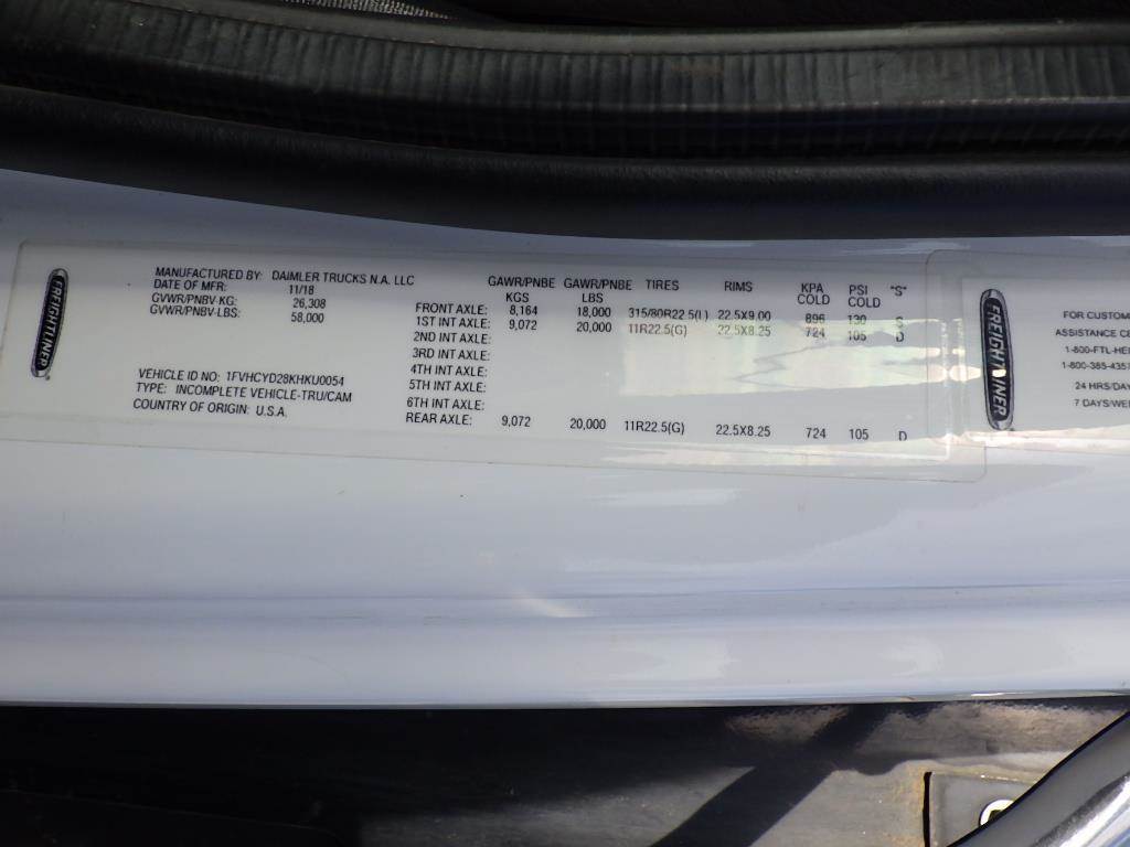VIN: 1FVHCYD28KHKU0054 Turbo Diesel, Allison Autimatic, Air Brakes, Air Ride Seat, Air Bag Suspension, Glad Hands, DEF, Trailer Brake Controller, Pintle Hitch w/ Air, Vinyl Interior, AM/FM, Cruise Control, PTO, Cargo Cover System, Differential Lock, 315/80R 22.5 (F) Tires, 11R22.5 (R) Tires, 18,000lbs Front Axle, 20,000lbs, Rear Axle, GVWR 58,000lbs, Odometer Reading: 31,264 Disclaimer: Mileage and hours are visually observed and not verified.