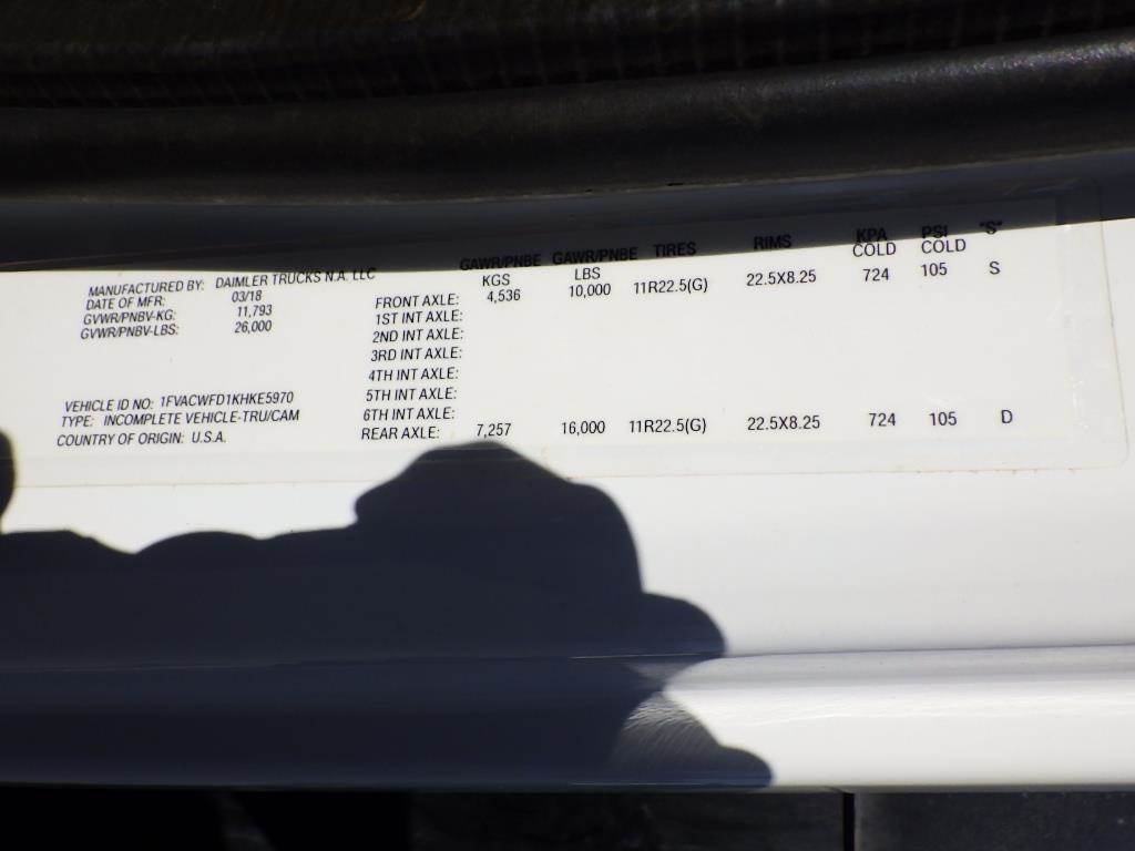 VIN: 1FVACWFD1KHKE5970 Cummins 6-CYL Turbo Diesel, Automatic, A/C/Heat, AM/FM, Cruise Control, Vinyl Interior, 9' Dump Bed 5YD, Pintle Hitch, Spring Suspension, Tarp System, DEF, PTO, 3,196 Hours, 10,000lb Front Axle, 16,000lb Rear Axle, 11R22.5 Tires, GVWR 26,000lbs, Odometer Reading: 51,791 Disclaimer: Mileage and hours are visually observed and not verified.