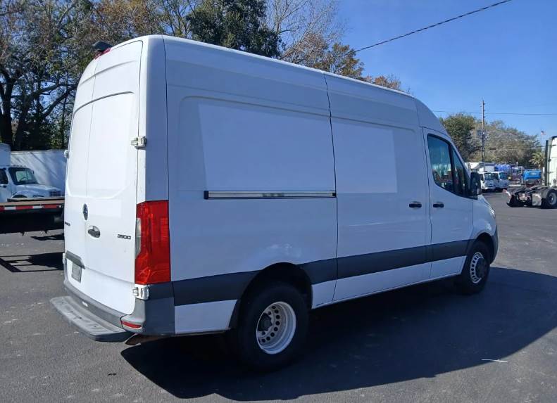 The van rides on Mercedes-Benz spring suspension with a hydraulic braking system and utilizes a single rear axle with dual rear wheel configuration, providing enhanced stability and payload capability. It carries a 9,990 lb GVWR supported by a 5,445 lb front axle rating and a 7,060 lb rear axle rating, along with a 144-inch wheelbase and all-steel construction, making it both durable and maneuverable for delivery environments.
