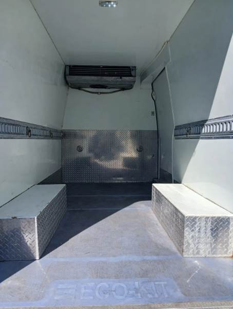 The refrigerated cargo area is fully insulated and constructed with aluminum and Kemlite interior lining, providing durability, sanitation, and effective temperature retention. The unit is equipped with a Carrier Integra 30S engine-driven refrigeration system, ensuring consistent cooling performance during operation. The cargo area is accessible via full rear swing doors as well as a sliding curbside door, allowing efficient loading and unloading even in tight delivery environments. The high roof configuration provides increased interior clearance, improving usability and cargo handling.