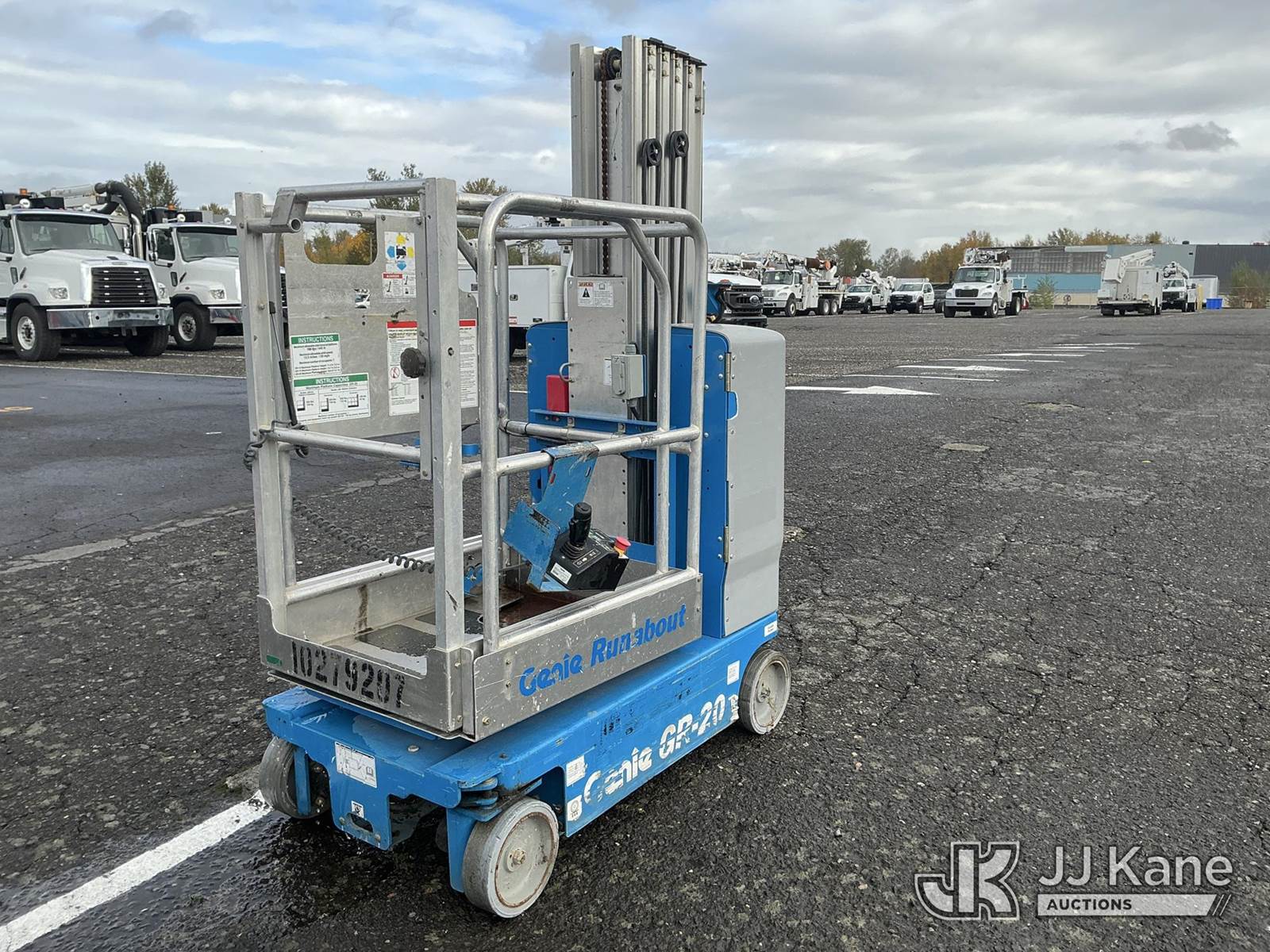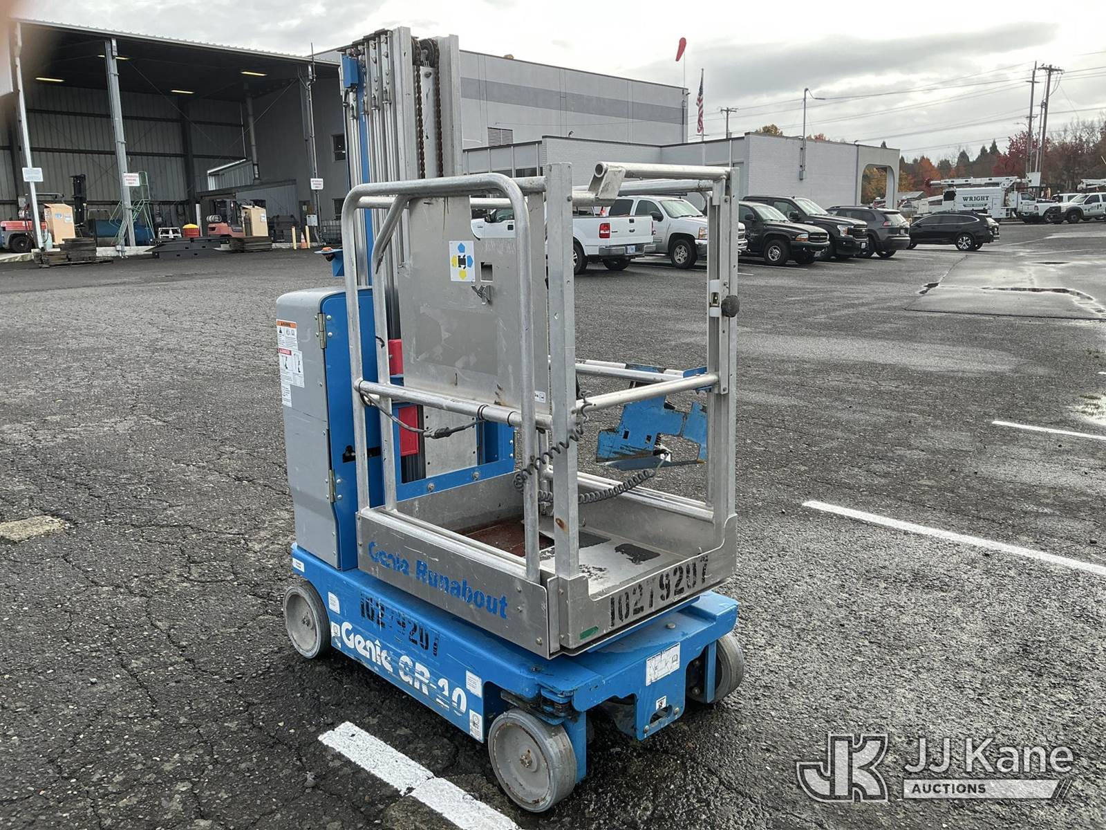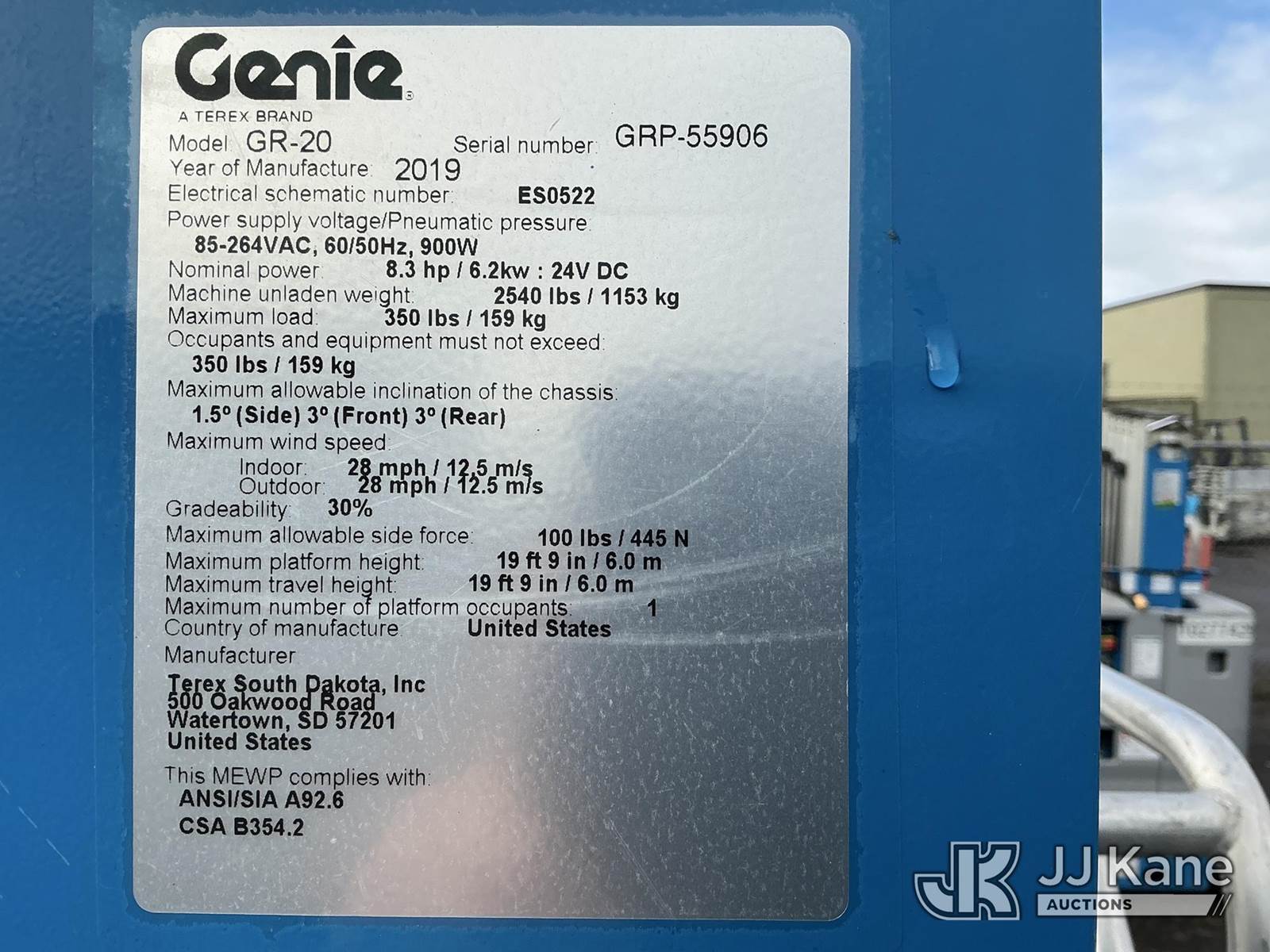 2019 Genie GR-20 Self-Propelled Manlift, s/n GRP55906, battery powered, (Runs, Moves, & Operates) (Reads 189 hours) NOTE: This unit is being sold AS IS/WHERE IS via Timed Auction and is located in Portland, OR. "Inspection & preview days for this unit are the 2 business days prior to the first day of items closing for this auction, item is located at 13817 NE Sandy Blvd Portland, OR 97230 and hours of operations are 8a-3p, M-F. For pre-sale questions, please contact Tony Tully @ (503)-307-1348. Dealer License Number DL1391." (Manuals provided in cab) (Buyer is responsible for removal. Assistance by consignor or JJ Kane Auctioneers is not assured.)