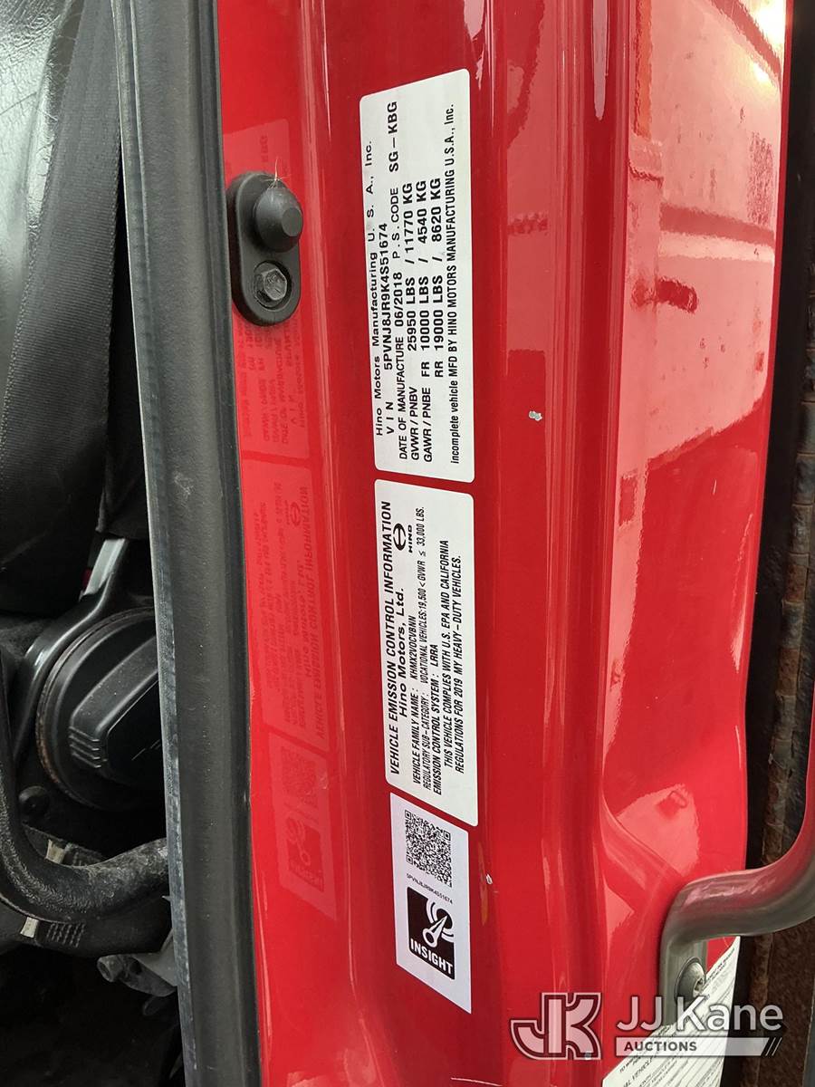 2019 Hino Conventional Cab Flatbed Truck, J08E 7.6L L6 diesel, 4X2, Auto, True Mileage Unknown (Not Running, Condition Unknown, Drive Shaft Removed, Rust and Body Damage) This is a Titled Item NOTE: This unit is being sold AS IS/WHERE IS via Timed Auction and is located in Pennsville, NJ. For pre-sale questions and pickups, please contact Pete Rhodes at peter.rhodes@jjkane.com. Pickups can be conducted Monday through Friday 9:30am to 3:00pm. (Buyer is responsible for removal. Assistance by consignor or JJ Kane Auctions is not assured.)