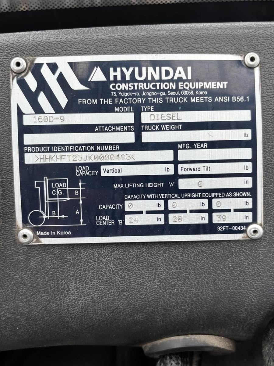 2019 HYUNDAI 160D-9 DIESEL FORKLIFT IS A HEAVY-DUTY INDUSTRIAL LIFT TRUCK WITH 12,500 HOURS AND A SOLID SERVICE HISTORY, MAKING IT A PROVEN MACHINE READY FOR CONTINUED DAILY USE. EQUIPPED WITH A FULL ENCLOSED CAB FEATURING HEAT AND A/C, THIS FORKLIFT IS DESIGNED FOR YEAR-ROUND OPERATION IN TOUGH WORKING CONDITIONS. SOLID TIRES PROVIDE MAXIMUM DURABILITY AND PUNCTURE-FREE PERFORMANCE, IDEAL FOR YARDS, PLANTS, AND INDUSTRIAL APPLICATIONS. KNOWN FOR STRONG LIFT CAPACITY, SMOOTH HYDRAULICS, AND EXCELLENT STABILITY, THIS IS A GOOD USED MACHINE WITH PLENTY OF LIFE REMAINING AND READY TO GO TO WORK.