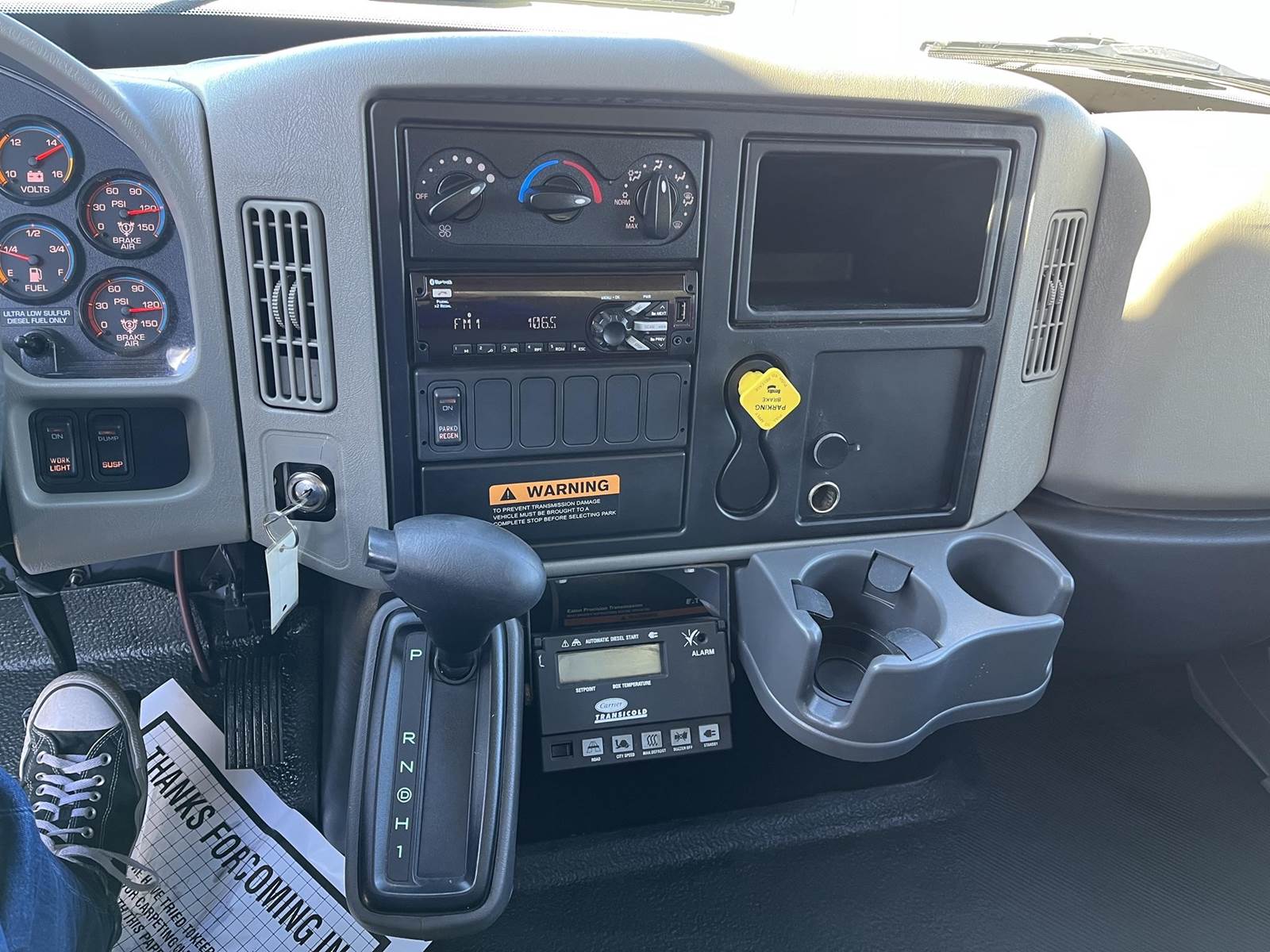 An automatic Eaton Fuller 6 speed , Air ride suspension, 4x2 drive, single rear axle, 35,999 lbs. GVWR, All steel wheels, 254 in wheelbase, drum brakes, Power steering, Power locks, Cruise control, Excellent A/C, Cloth seats, Tilt/Telescopic, Power windows, Carrier Supra reefer with only 2,961 hours,50 gal fuel capacity, 24ft body length, 102 in body width, and so much more!!