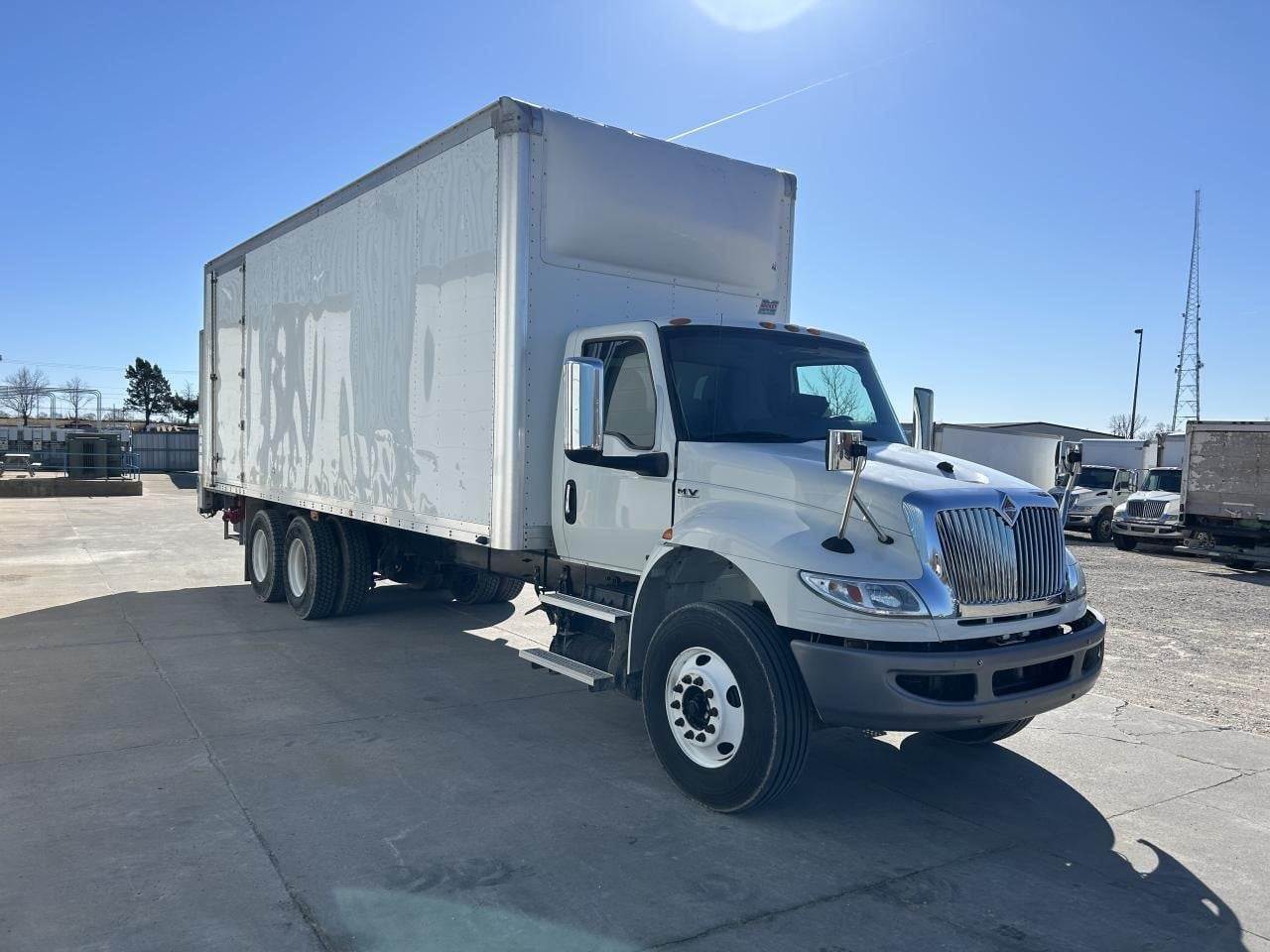 2019 International MV-607 with 26' Van Box, Cummins L9 350HP Engine, Automatic 6 Spd Allison 3000 RDS Transmission, PTO, Air Ride Suspension, 54,000 GVW, 14,000# MFS14143ANN Front Axle, 40,000# Meritor MD2014X Rear Axle, 5.29 Ratio, 272" Wheelbase (CA/CT-208" EOF-324"), 11R22.5 Tires (Front: 19/32 - Rear: 20/32), Steel Wheels, 70-gal Aluminum Fuel Tank, Air Brakes 50%, Double Frame, AC, Cruise, Engine Brake, Power Locks, Power Windows, Power Steering, Tilting, Power Mirror