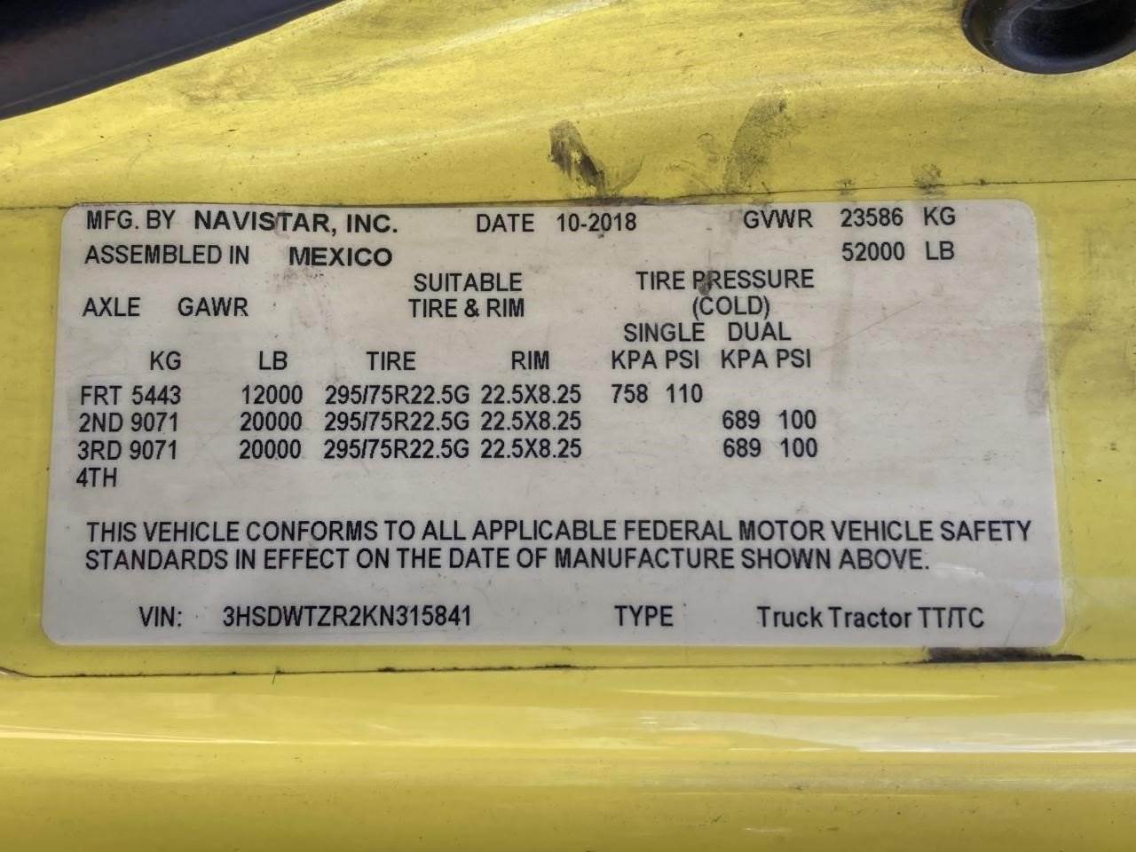 2019 International RH Tandem Axle Day Cab, A26 Engine, FULLER EEO-14F112C Transmission, Air Ride Suspension, 5th-Wheel, 52,000 GVW, 12, Front Axle, 40,000 Rear Axle, 175" Wheelbase