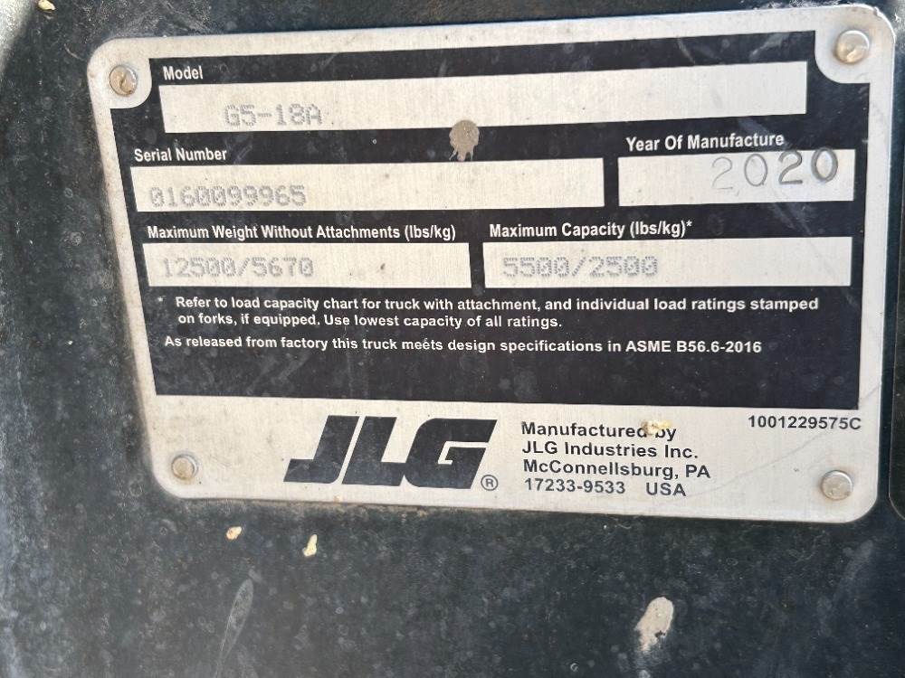 2019 JLG G518A ROUGH TERRAIN REACH FORKLIFT, 5,500#, 18' reach, 2-stage, 4x4x4, diesel, canopy, foam filled tired, 1,646 hours indicated. s/n:0160099965