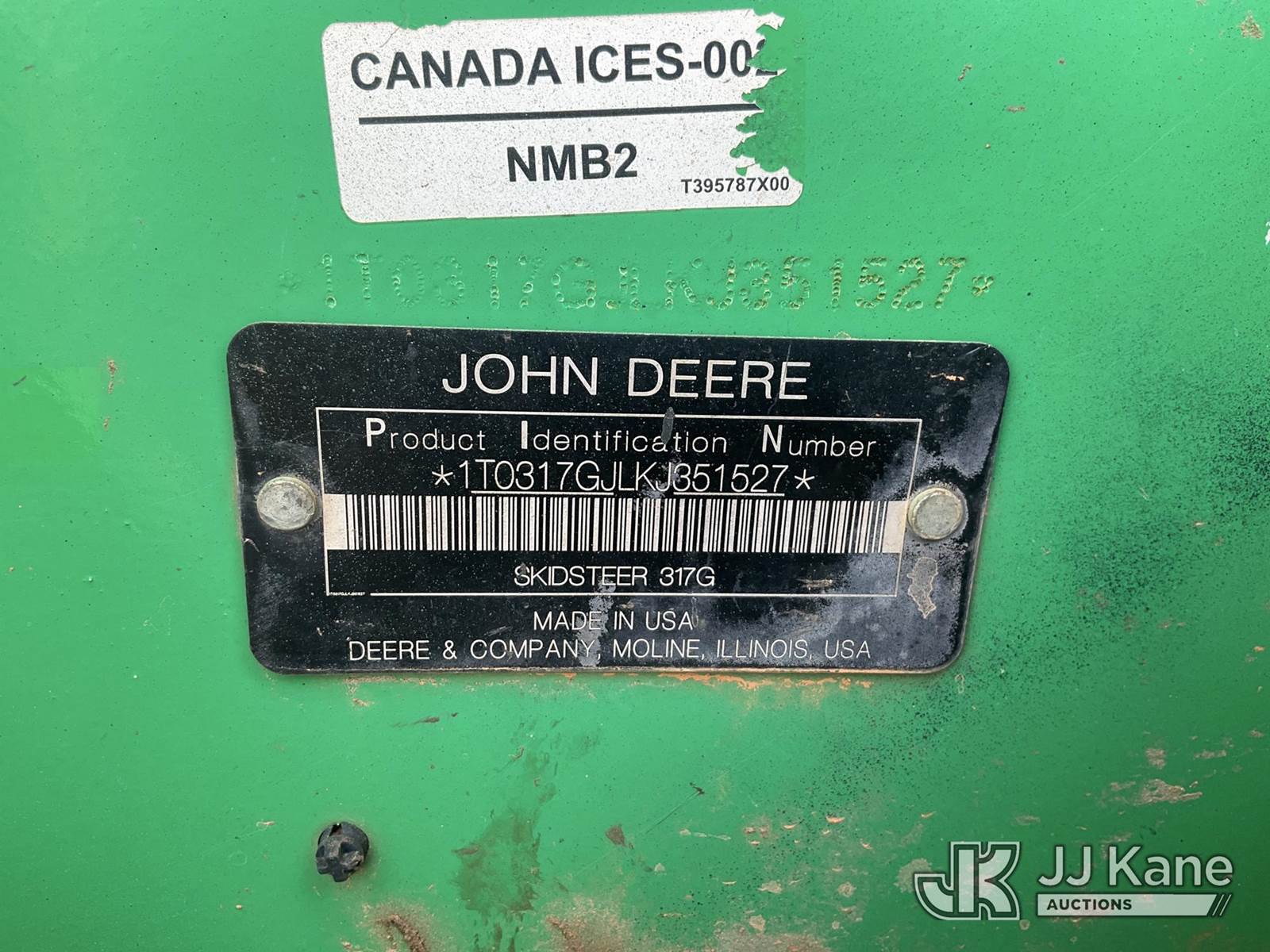 2019 John Deere 317G Crawler Skid Steer Loader, s/n 1T0317GJLKJ351527, Yanmar diesel, Hydrostatic, with aux high flow hyd, joystick controls, rubber tracks & ROPS, (Runs, Moves, & Operates) (Reads 1,774 hours) NOTE: This unit is being sold AS IS/WHERE IS via Timed Auction and is located in China Grove, NC. Inspection & preview days for this unit are the 2 business days prior to the first day of items closing for this auction, item is located at 820 E NC Hwy 152 China Grove, NC 28023 and hours of operations are 8a-4p. For pre-sale questions, please contact Office Staff @ (704) 674-1113. (Buyer is responsible for removal. Assistance by consignor or JJ Kane Auctions is not assured.)