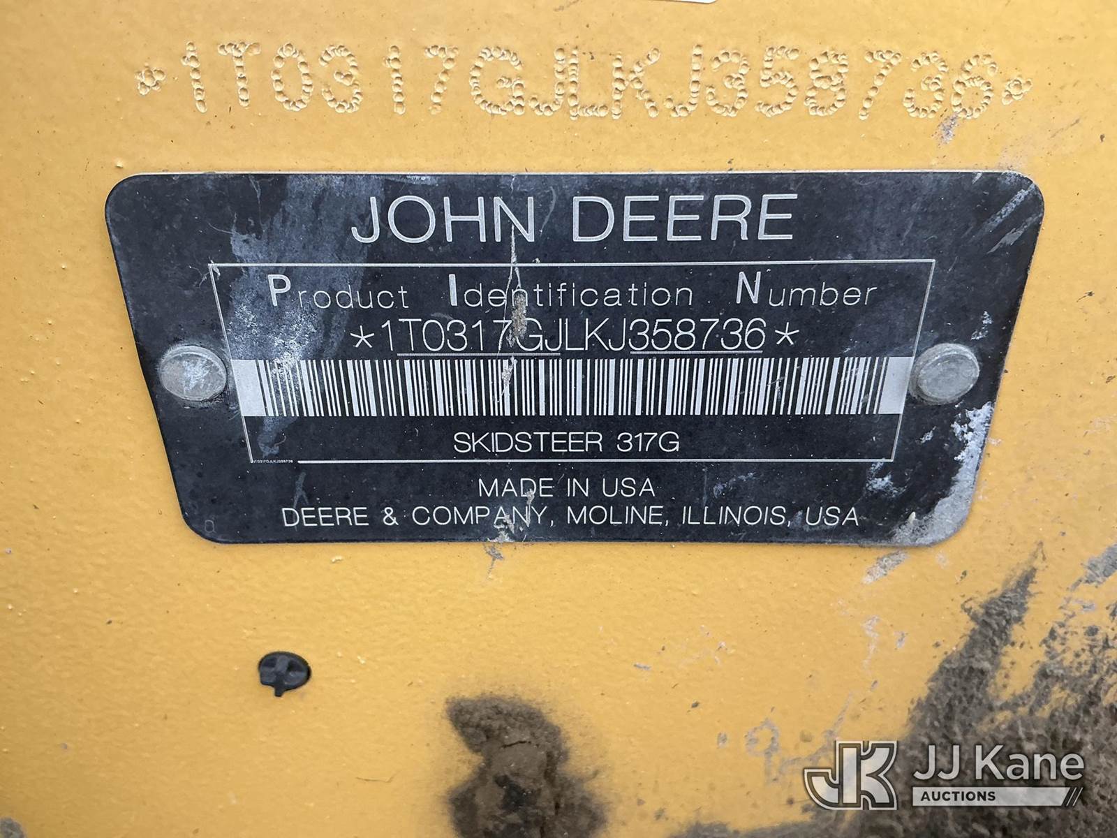 2019 John Deere 317G Skid Steer Loader, s/n 1T0317GJLKJ358736, John Deere Hydrostatic, diesel, with aux hydraulics, EROPS w/ AC, (Runs, Moves & Operates) (Jump To Start, Error Codes Condition Unknown, Codes Cause To Remain Parked) ( No Emissions Provided, See Bidder Agreement) (Non Drive Away Removal Only ) (Reads 2,386 hours) NOTE: This unit is being sold AS IS/WHERE IS via Timed Auction and is located in Fort Lupton, CO. Inspection & preview days for this unit are the 2 business days prior to the first day of items closing for this auction, item is located at 2105 Northland Dr Fort Lupton, CO 80621 and hours of operations are 8a-4p. For pre-sale questions, please contact Dakota Hoffman @ (720) 621-0786. Dealer License Number 47109. (Buyer is responsible for removal. Assistance by consignor or JJ Kane Auctions is not assured.)