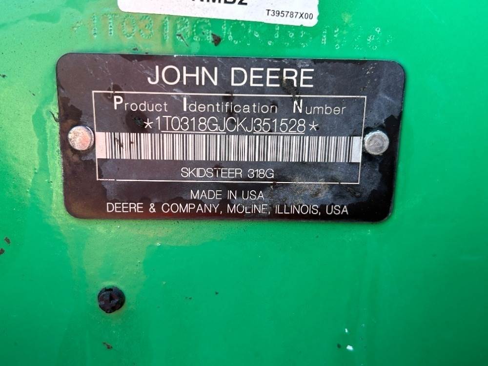 2019 JOHN DEERE 318G SKIDSTEER LOADER, aux hydraulics, canopy, solid tires, 1,989 hours indicated. s/n:1T0318GJCKJ351528