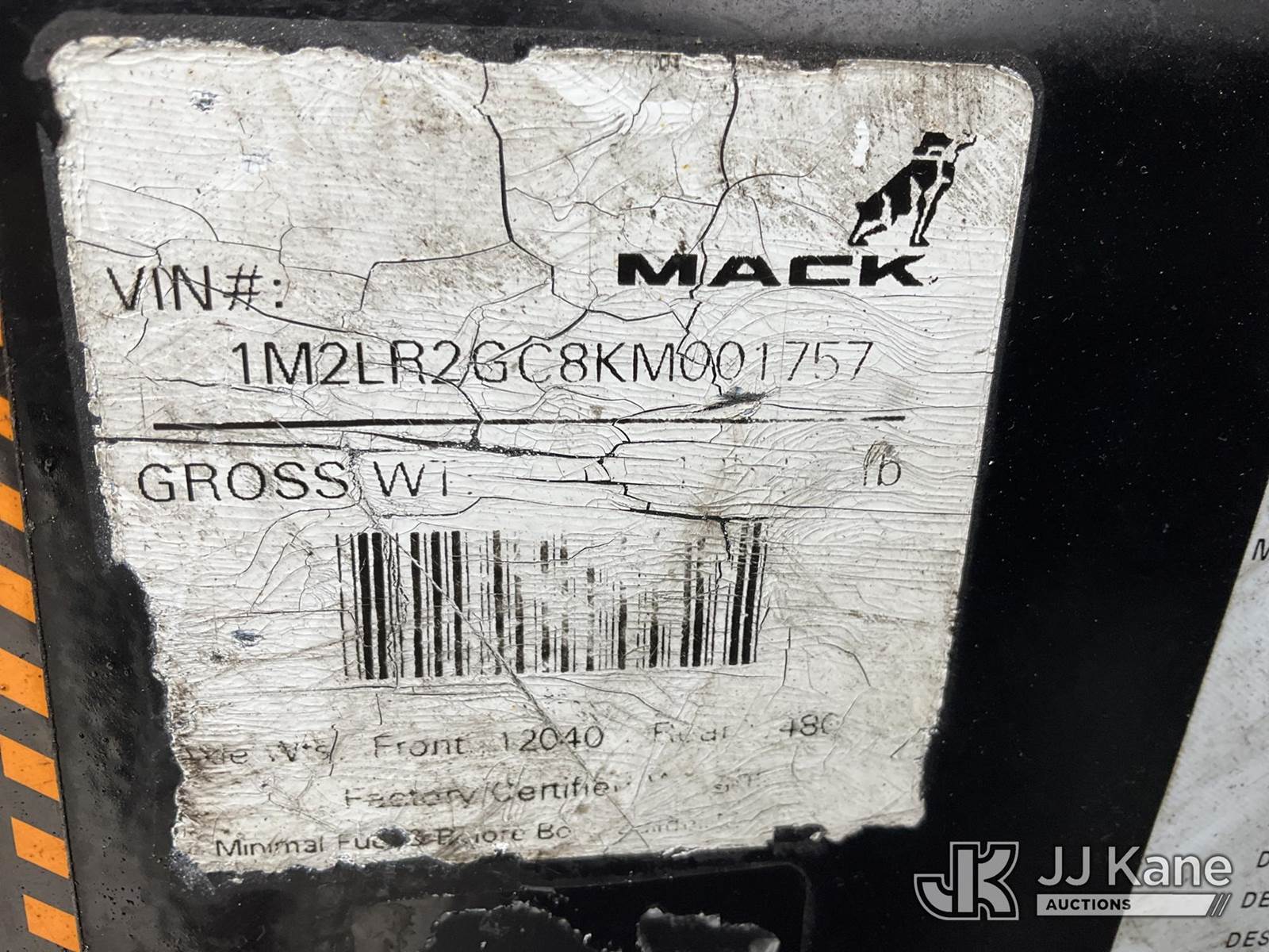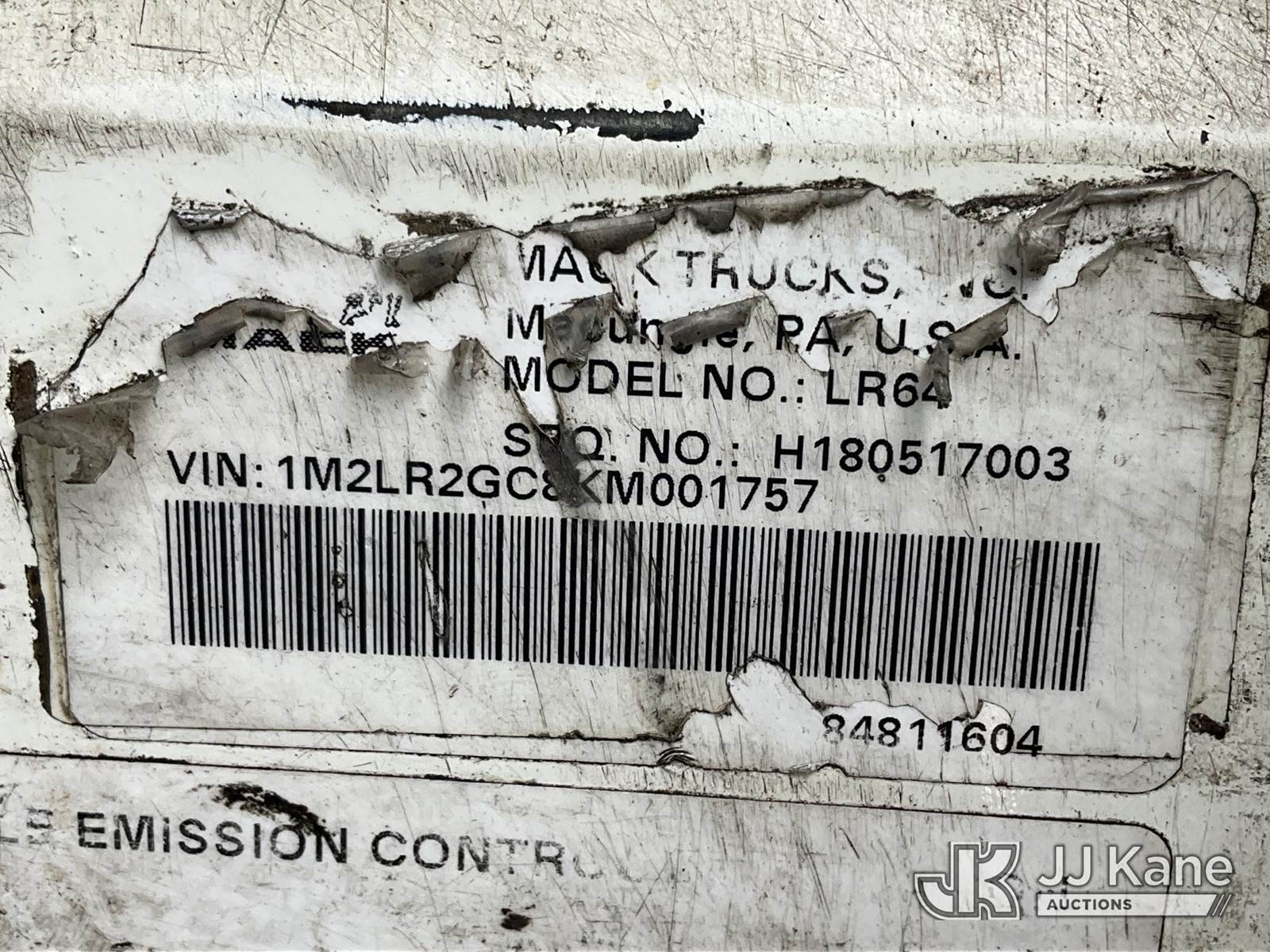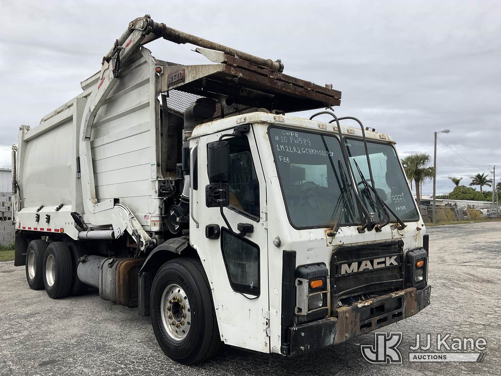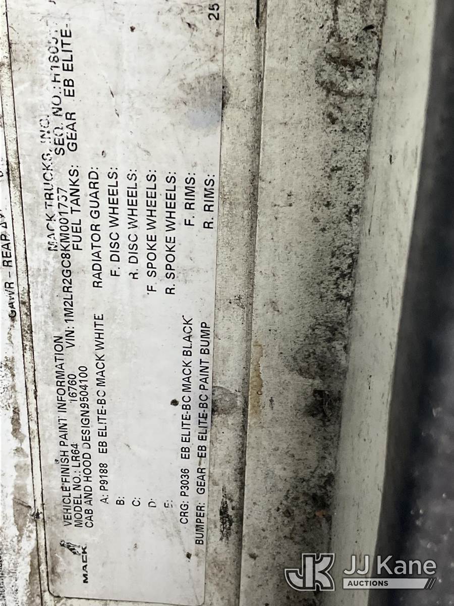 2019 Mack LR Front Load T/A Trash Truck, 10.9L diesel, Auto, A/C, (88,355 miles) (Runs & Moves) (Check Engine & ABS Lights On, Body Damage & Rust, Air Brake Release Switch Lock Nut Missing, Passenger Door Damaged & Window Does Not Raise) (FL Residents Purchasing Titled Items - tax, title & registration fees will be collected at the maximum rate of $400.00 under 25,999 and $800.00 for Over 26,000 and $250.00 trailers - Proof of insurance is mandatory; Out of State Residents Purchasing Title Items - tax will be collected based upon your state rate.) This is a Titled Item NOTE: This unit is being sold AS IS/WHERE IS via Timed Auction and is located in West Palm Beach, FL. For Pick Up & Removal information, please contact: Andy Garcia @ 561-215-0085. Removals require 24-hr Notice by Appointment Only, Buyer/Hauler must present copy of Paid-in-Full JJ Kane Release Form upon arrival. Purchaser acknowledges ALL lots must be removed within 10 business days of Auction, or a towing & storage fee may be incurred. (Buyer is responsible for removal. Assistance by consignor or JJ Kane Auctions is not assured.)