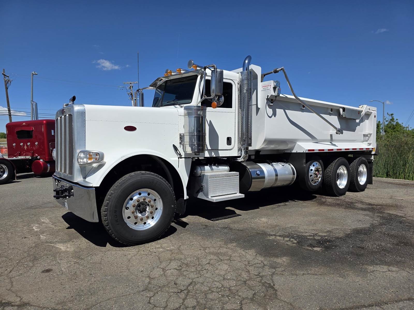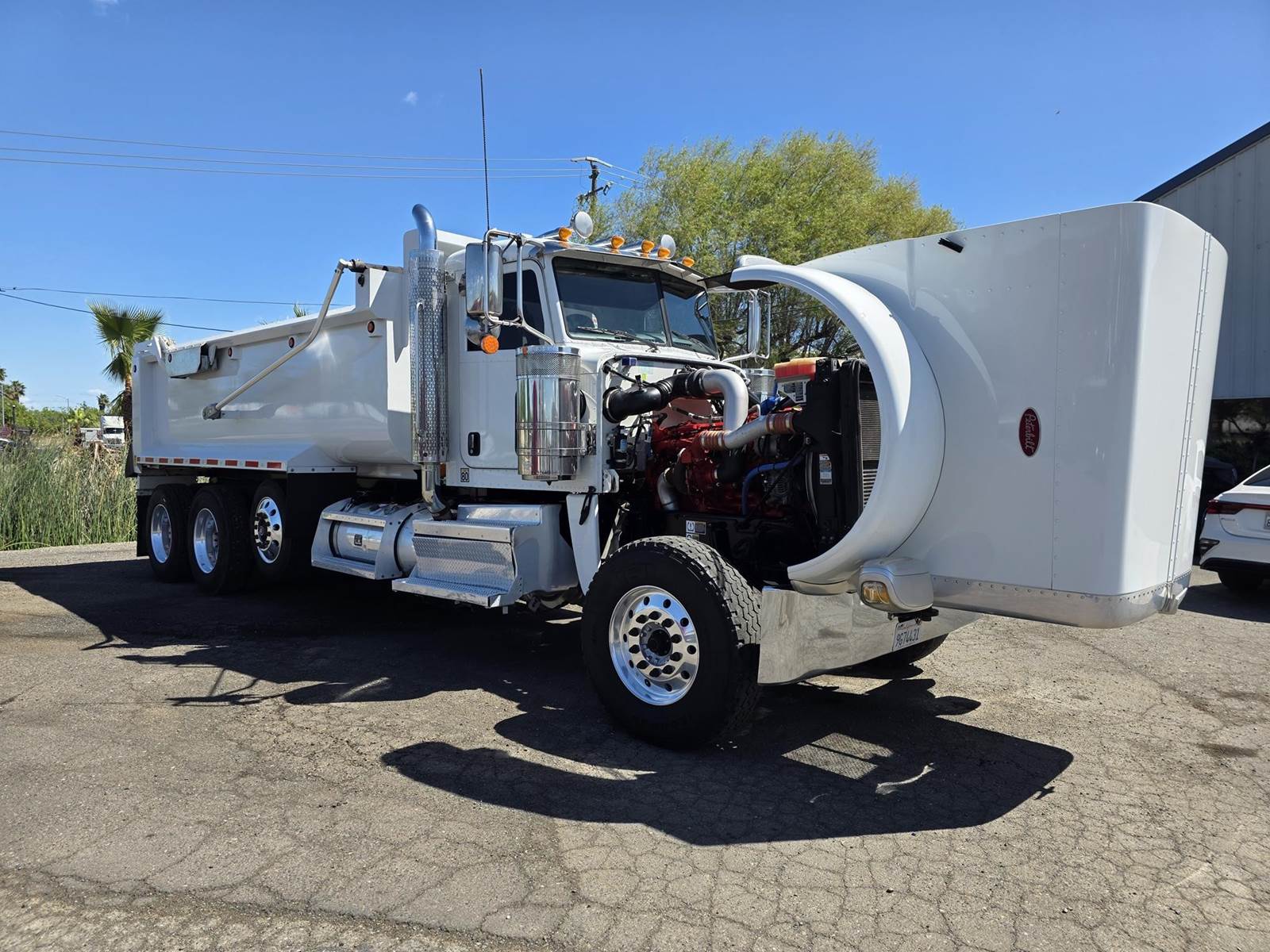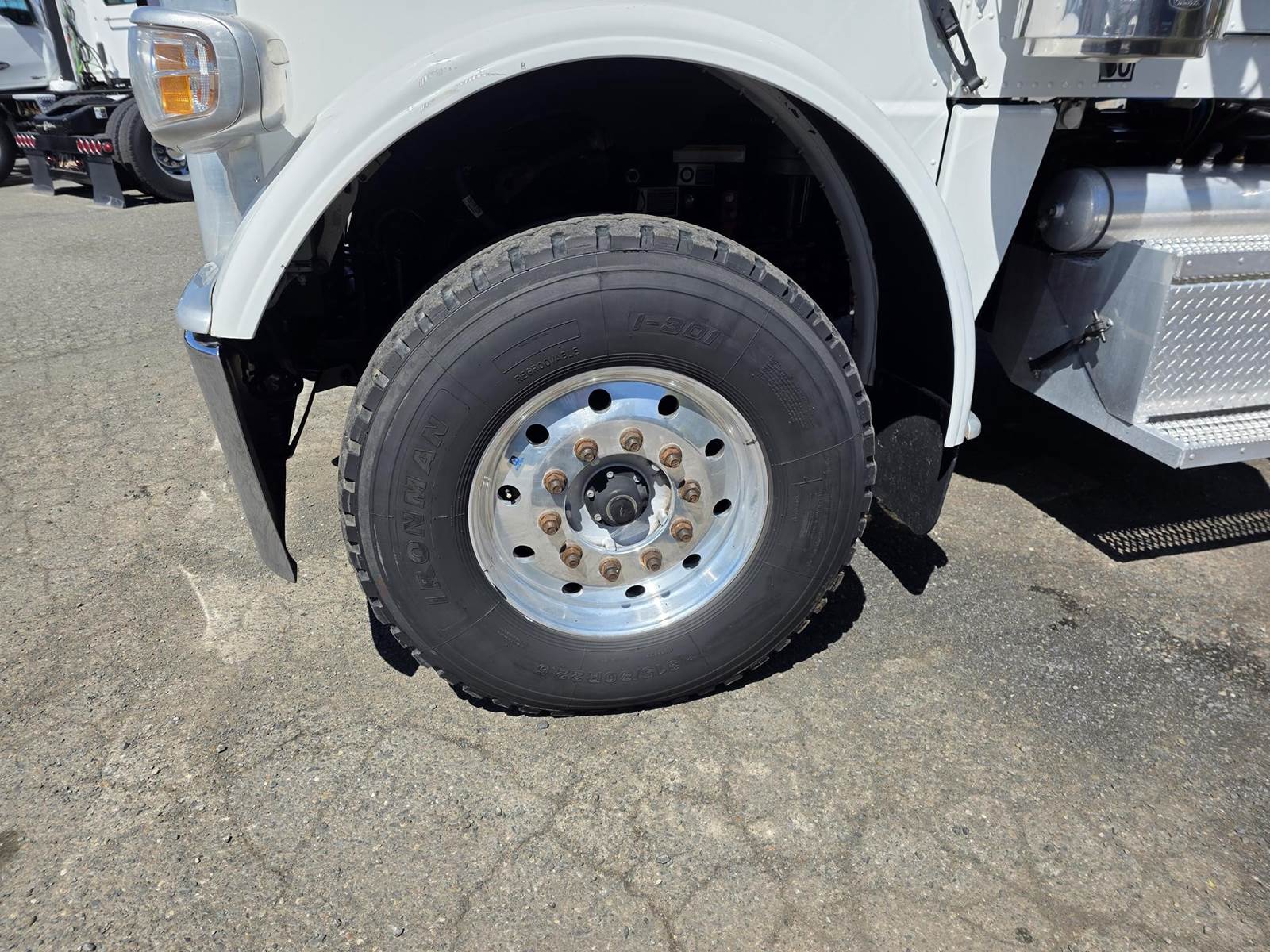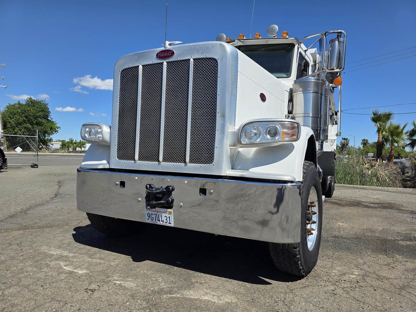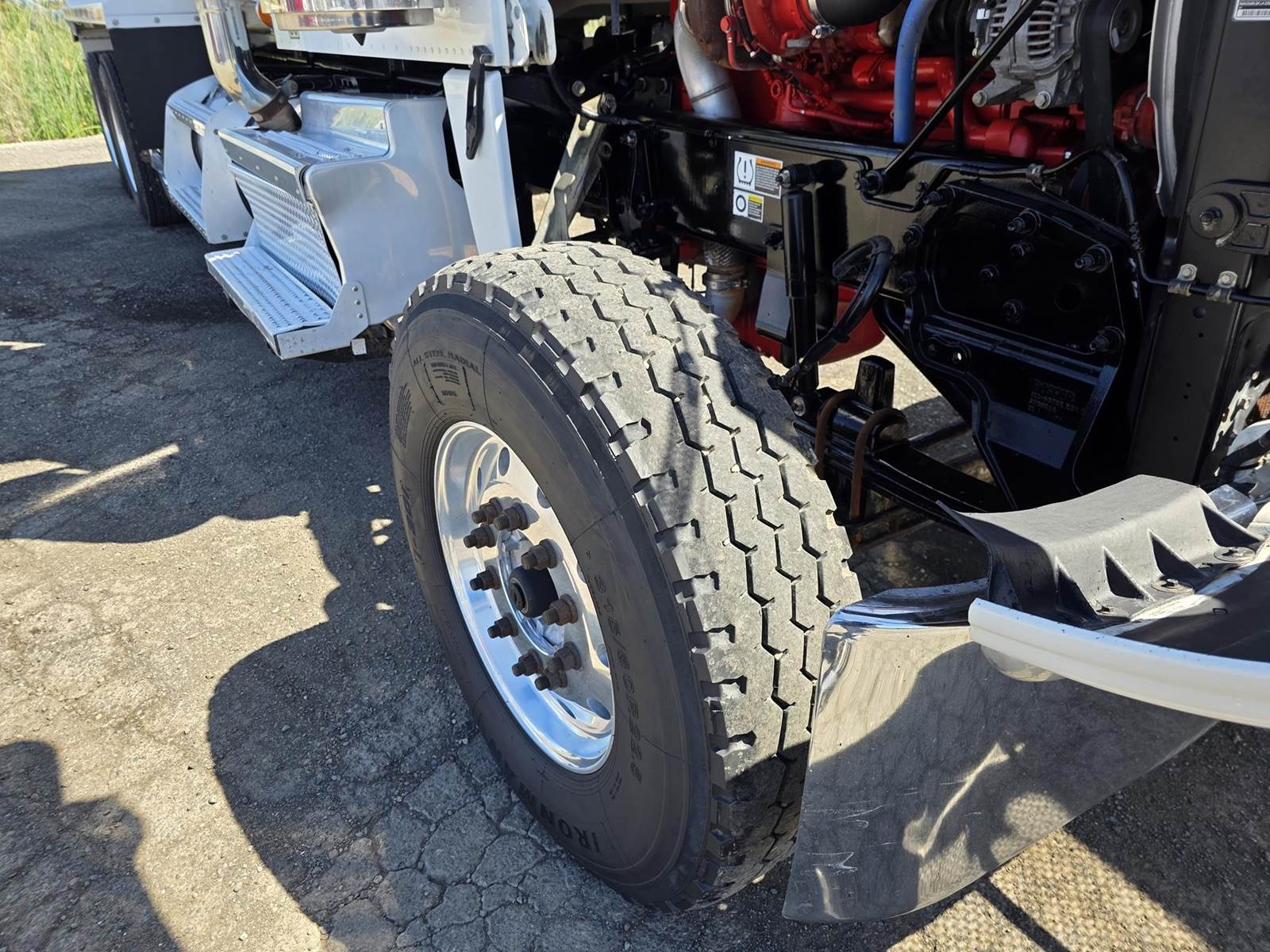 Cummins X15 (485 HP), Engine Brake, Eaton Fuller FRO16210C 10-Speed Manual Transmission, Dana Spicer DSH40 Dual Locking Rear Axles on Drum Brakes, 3.90 Ratio, Peterbilt Air Trac Suspension w/ Dump Switch, 315/80R22.5 Steer Tires, 11R24.5 Drive Tires on Aluminum Wheels, Steer Axle Disc Brakes , 23" L/H 100 Gallon Aluminum Fuel Tank, 23" Split Fuel Tank R/H 100 Gallon Aluminum 50 Gal Fuel & 50 Gal Hydraulic Tank, L/H Frame Mounted DEF Tank, Factory Installed DPF, L/H Aluminum Frame Mounted Battery Box, Chrome Bumper, Stainless Steel Visor, Factory Air Ride Day Cab, Leather Legacy Air Ride Drivers Seat, Tilt & Tele Steering Column, Gauge Package, Power Door Locks, Power Windows, Power Mirrors, Heated Mirrors, A/C, Cruise Control, AM/FM Radio w/ CD Player, Navigation & Bluetooth, Watson Chalin SL1190SSR 13,500 lb Steerable Pusher Axle,