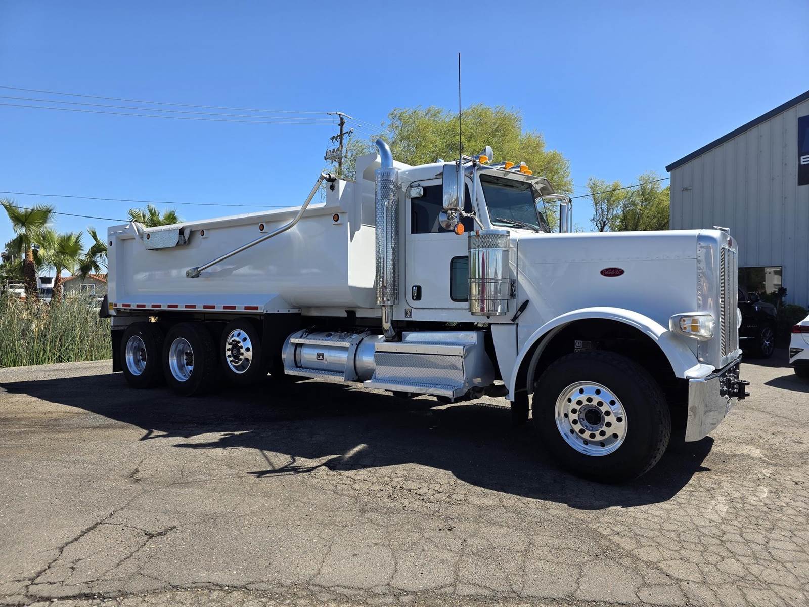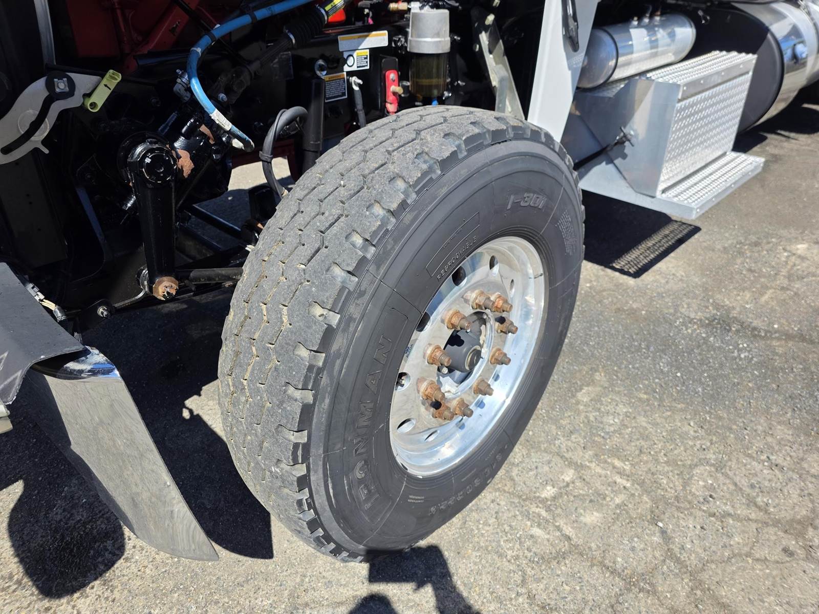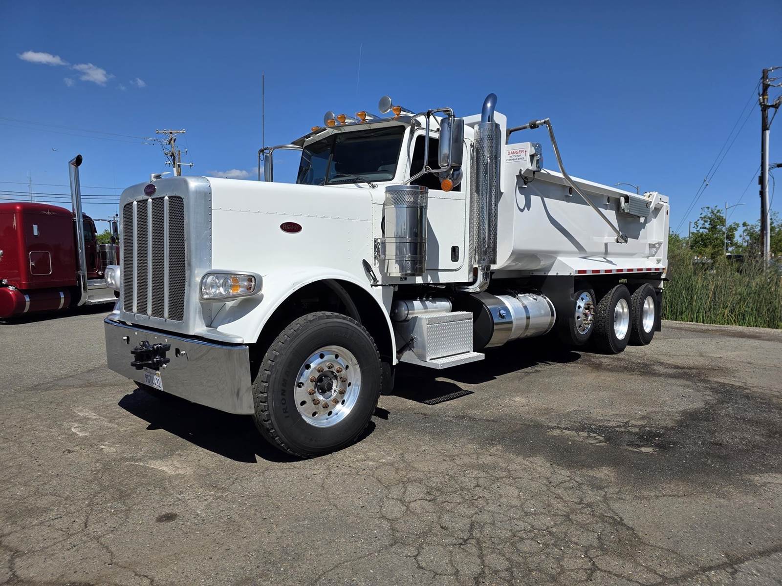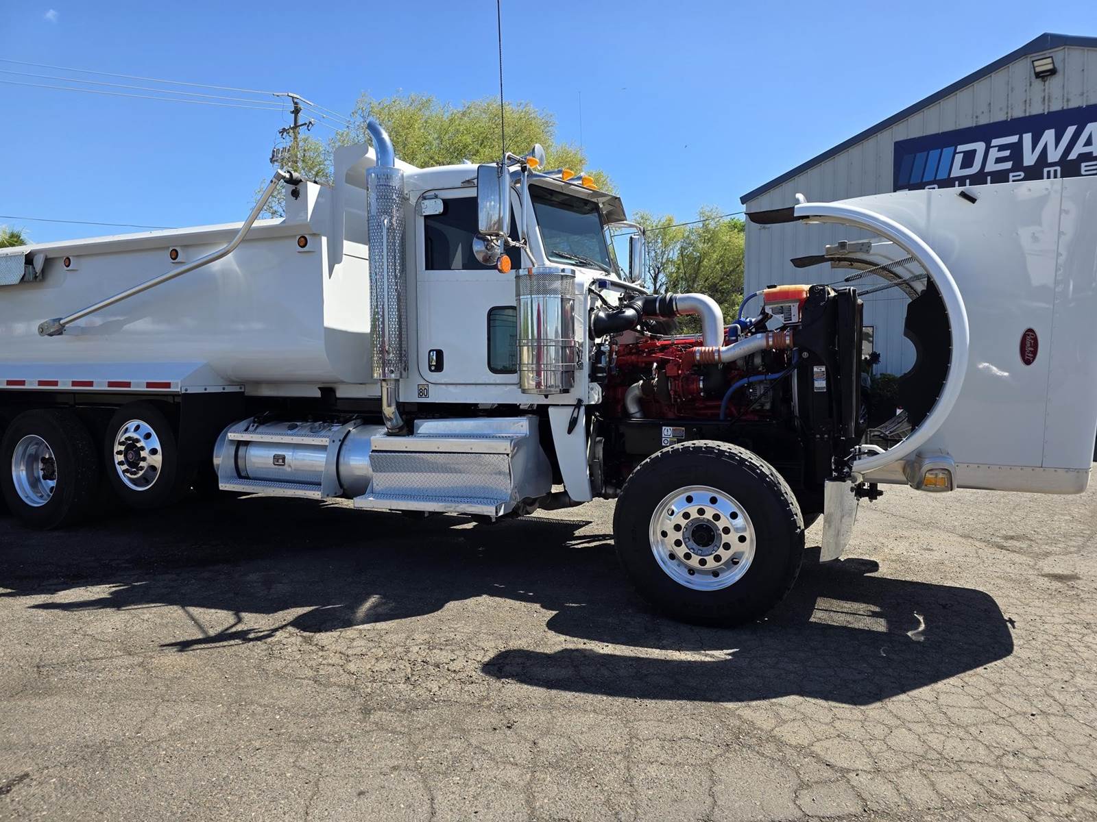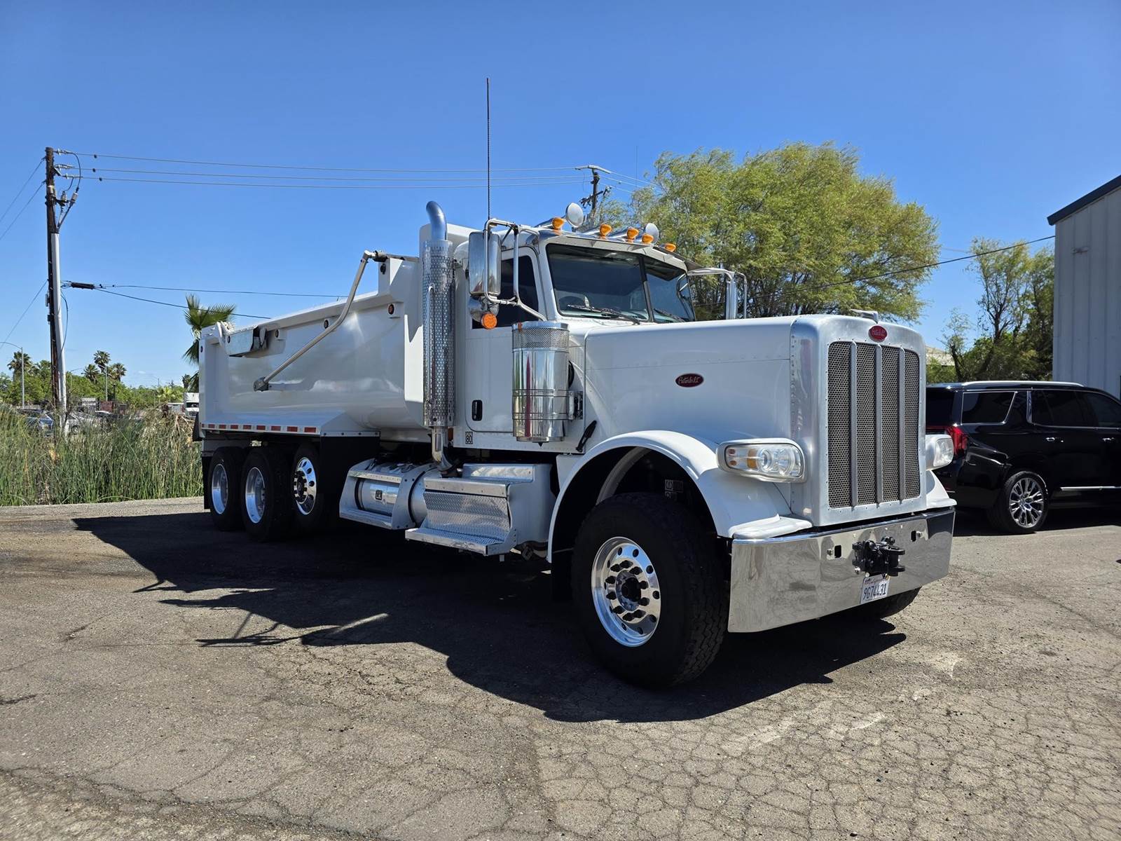 Cummins X15 (485 HP), Engine Brake, Eaton Fuller FRO16210C 10-Speed Manual Transmission, Dana Spicer DSH40 Dual Locking Rear Axles on Drum Brakes, 3.90 Ratio, Peterbilt Air Trac Suspension w/ Dump Switch, 315/80R22.5 Steer Tires, 11R24.5 Drive Tires on Aluminum Wheels, Steer Axle Disc Brakes , 23" L/H 100 Gallon Aluminum Fuel Tank, 23" Split Fuel Tank R/H 100 Gallon Aluminum 50 Gal Fuel & 50 Gal Hydraulic Tank, L/H Frame Mounted DEF Tank, Factory Installed DPF, L/H Aluminum Frame Mounted Battery Box, Chrome Bumper, Stainless Steel Visor, Factory Air Ride Day Cab, Leather Legacy Air Ride Drivers Seat, Tilt & Tele Steering Column, Gauge Package, Power Door Locks, Power Windows, Power Mirrors, Heated Mirrors, A/C, Cruise Control, AM/FM Radio w/ CD Player, Navigation & Bluetooth, Watson Chalin SL1190SSR 13,500 lb Steerable Pusher Axle,
