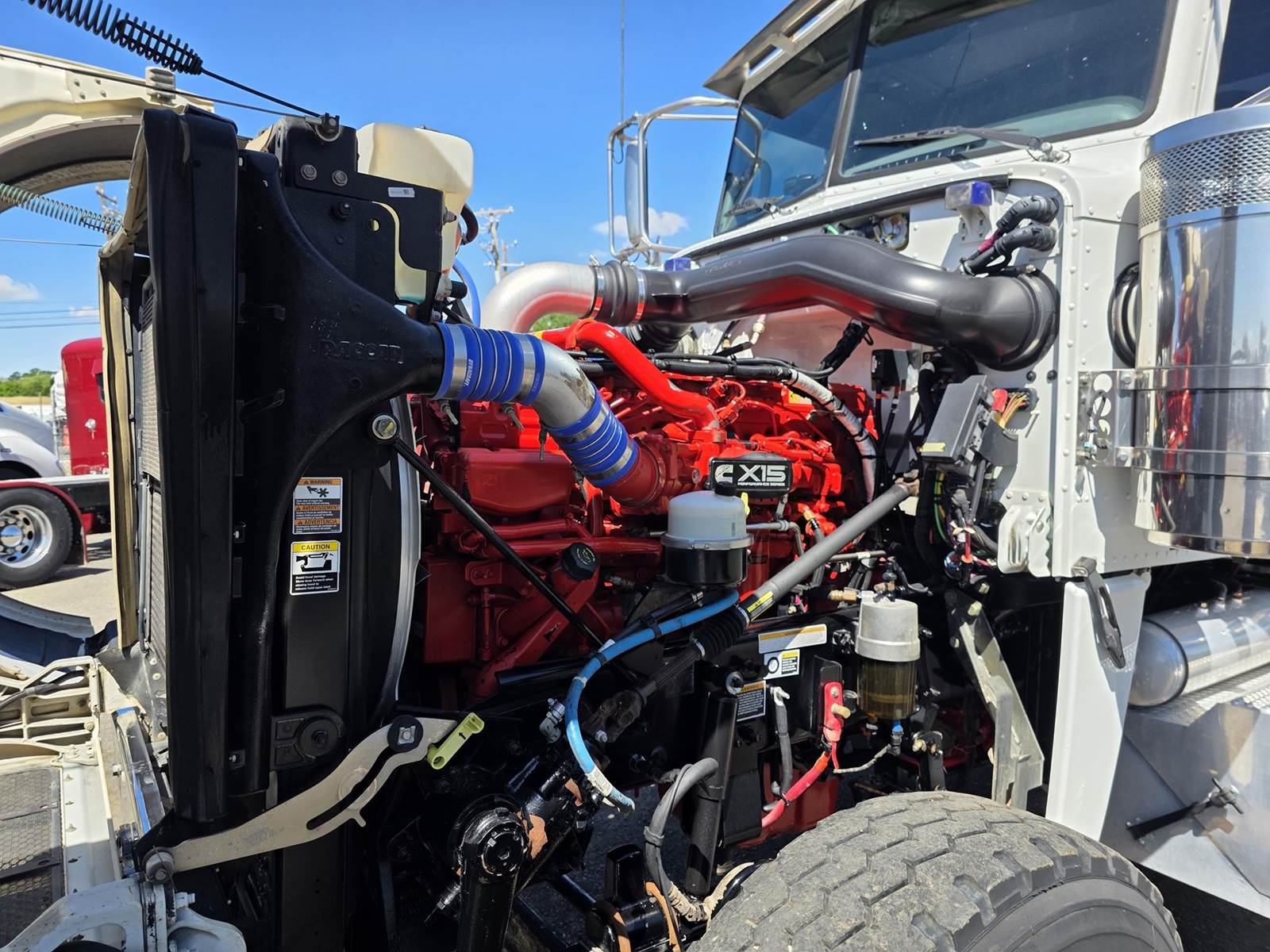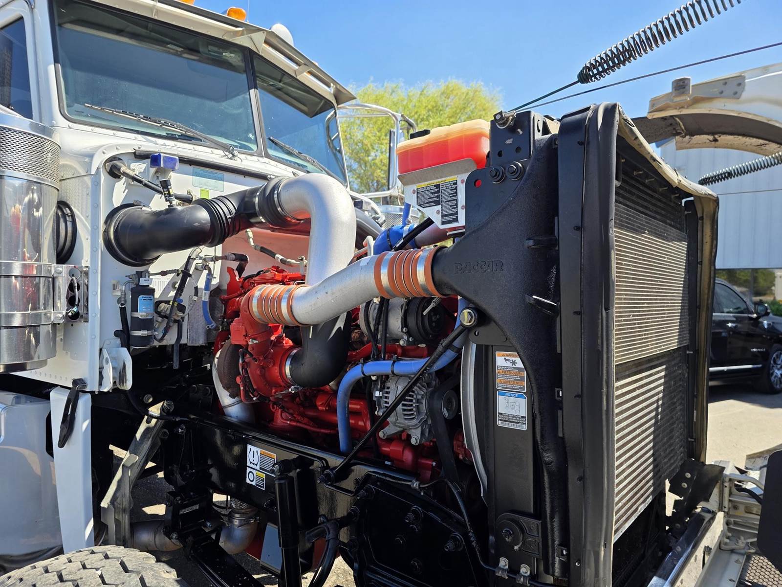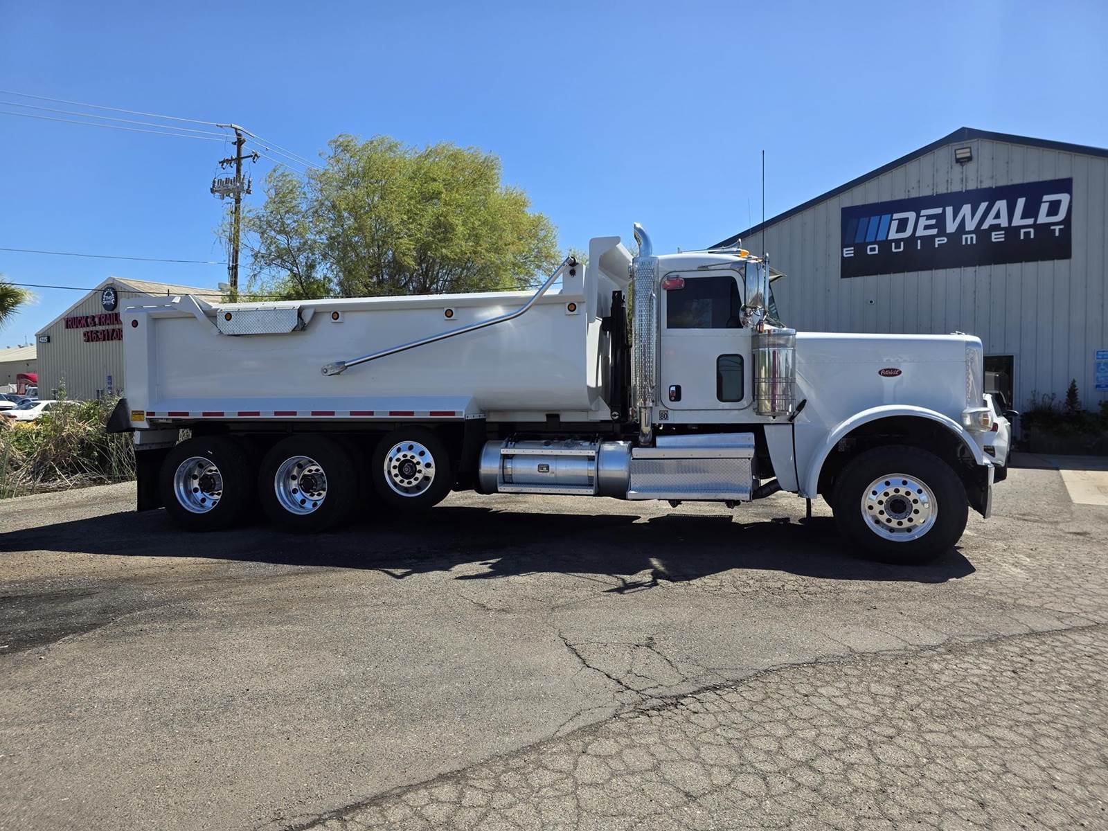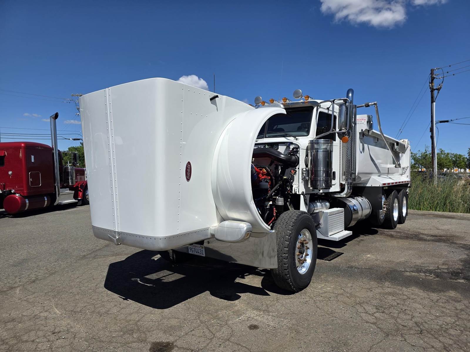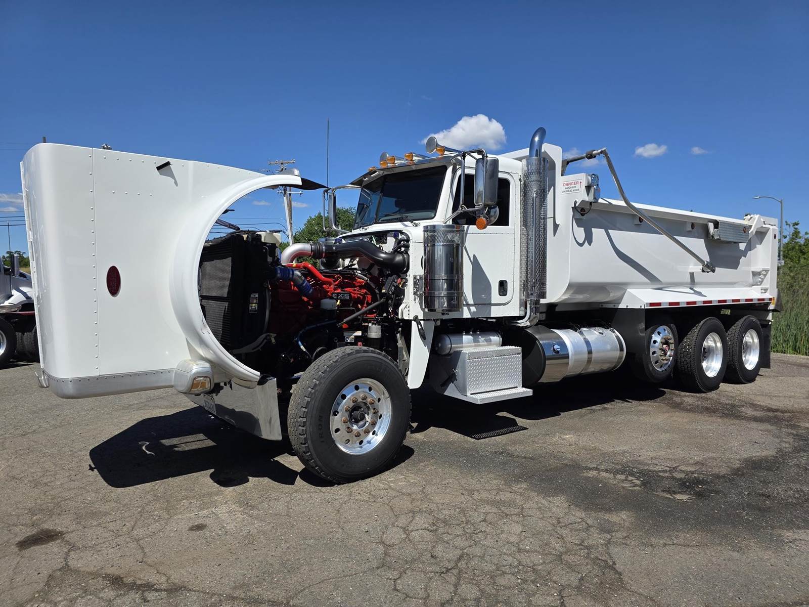 Cummins X15 (485 HP), Engine Brake, Eaton Fuller FRO16210C 10-Speed Manual Transmission, Dana Spicer DSH40 Dual Locking Rear Axles on Drum Brakes, 3.90 Ratio, Peterbilt Air Trac Suspension w/ Dump Switch, 315/80R22.5 Steer Tires, 11R24.5 Drive Tires on Aluminum Wheels, Steer Axle Disc Brakes , 23" L/H 100 Gallon Aluminum Fuel Tank, 23" Split Fuel Tank R/H 100 Gallon Aluminum 50 Gal Fuel & 50 Gal Hydraulic Tank, L/H Frame Mounted DEF Tank, Factory Installed DPF, L/H Aluminum Frame Mounted Battery Box, Chrome Bumper, Stainless Steel Visor, Factory Air Ride Day Cab, Leather Legacy Air Ride Drivers Seat, Tilt & Tele Steering Column, Gauge Package, Power Door Locks, Power Windows, Power Mirrors, Heated Mirrors, A/C, Cruise Control, AM/FM Radio w/ CD Player, Navigation & Bluetooth, Watson Chalin SL1190SSR 13,500 lb Steerable Pusher Axle,